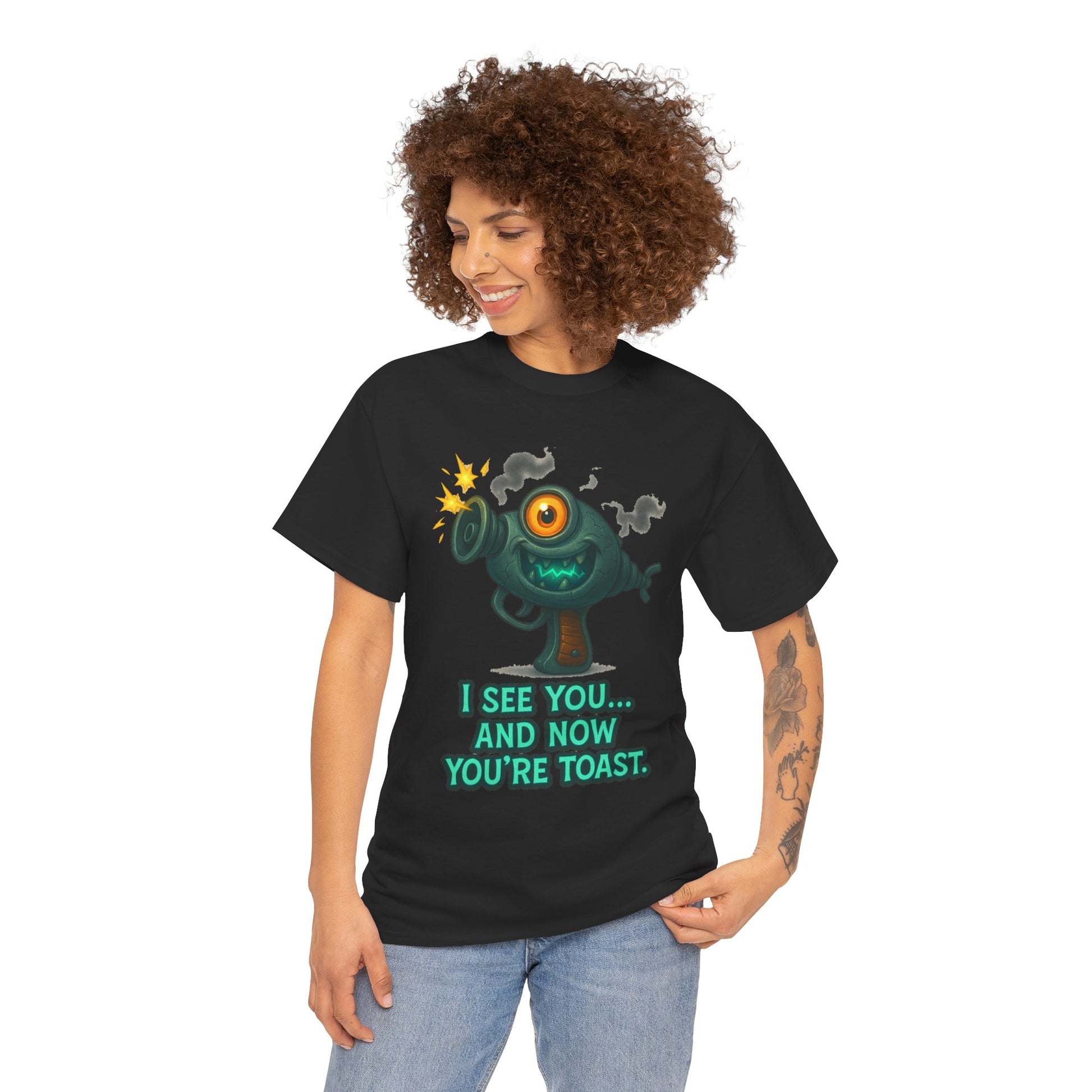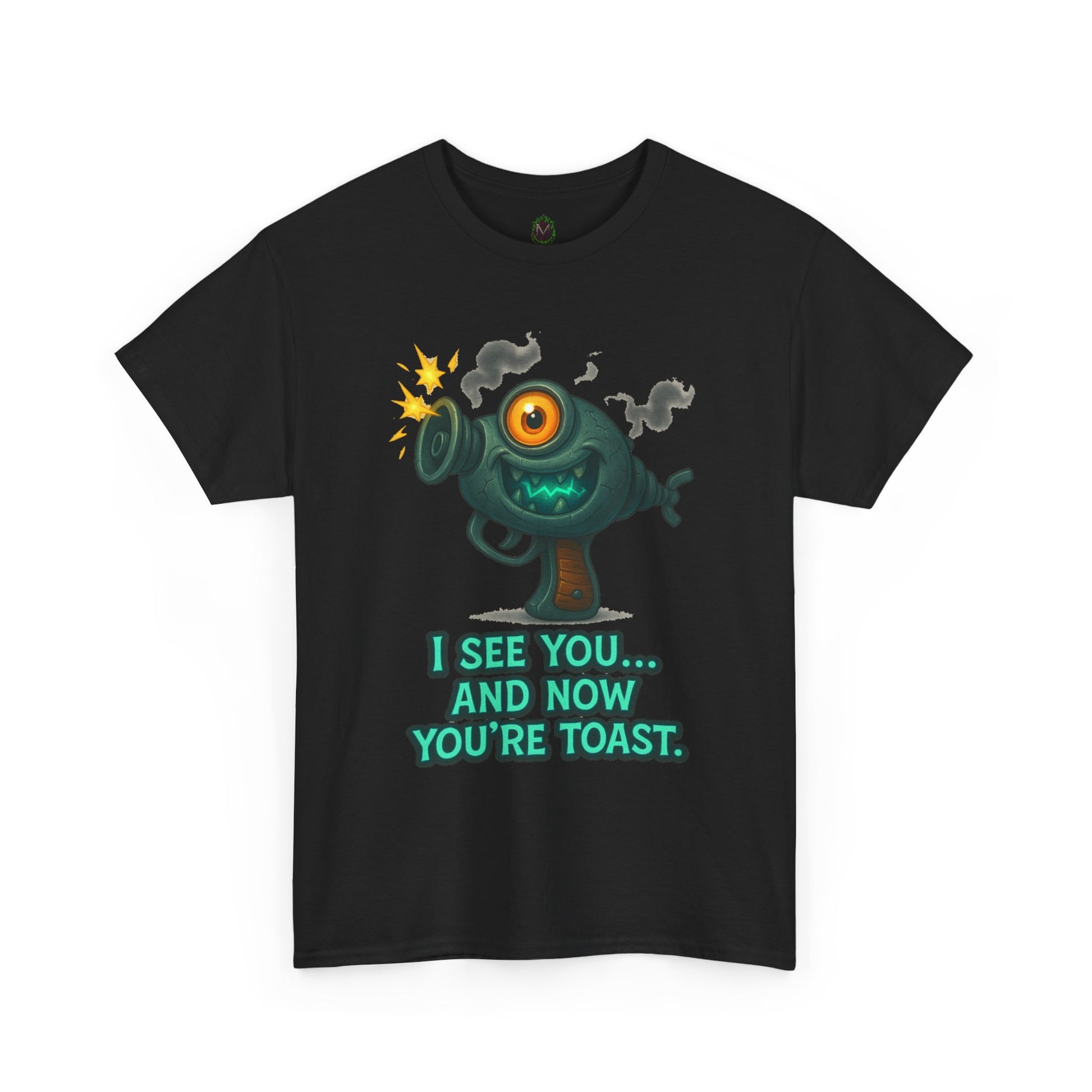 A playful, slightly spooky tee that brings cartoonish horror to everyday wear. The front art features a wide-eyed, one-eyed creature peeking through a cracked mask and holding a smoking, singed torch — beneath it, the line reads: “I see you... and now you're toast.” Short, vivid strokes of green and orange give the design a cheeky, mischievous energy. The shirt’s relaxed classic fit and soft, durable cotton make it comfortable for hanging out with friends, attending low-key Halloween meetups, or adding a tongue-in-cheek edge to casual days. Wear it to spark laughs, start conversations, or lean into a quirky, dark-humor style at game nights and seasonal gatherings.