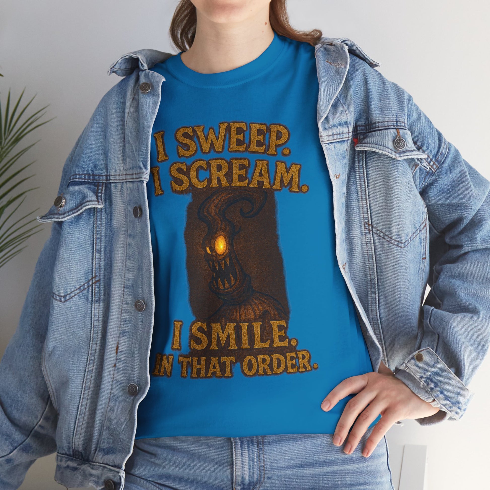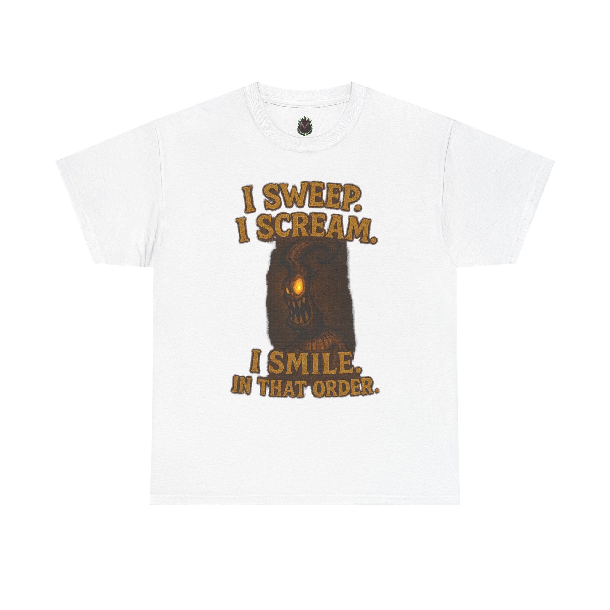 This tee carries a darkly playful energy — a soft, durable cotton shirt printed with a moody, lantern-lit tree creature and bold, tongue-in-cheek lettering: “I SWEEP. I SCREAM. I SMILE. IN THAT ORDER.” It feels like an inside joke for fans of spooky-still humor and late-night folklore. Wear it to hearthside story nights, small horror gatherings, or while you’re quietly cleaning up after a wildly chaotic game night. The fabric is comfortable against skin and sturdy enough for repeated washes, so the print’s warm, earthy tones stay rich and slightly weathered. Its relaxed, classic silhouette layers easily under jackets or stands alone as a statement piece when you want to lean into a low-key eerie vibe.
