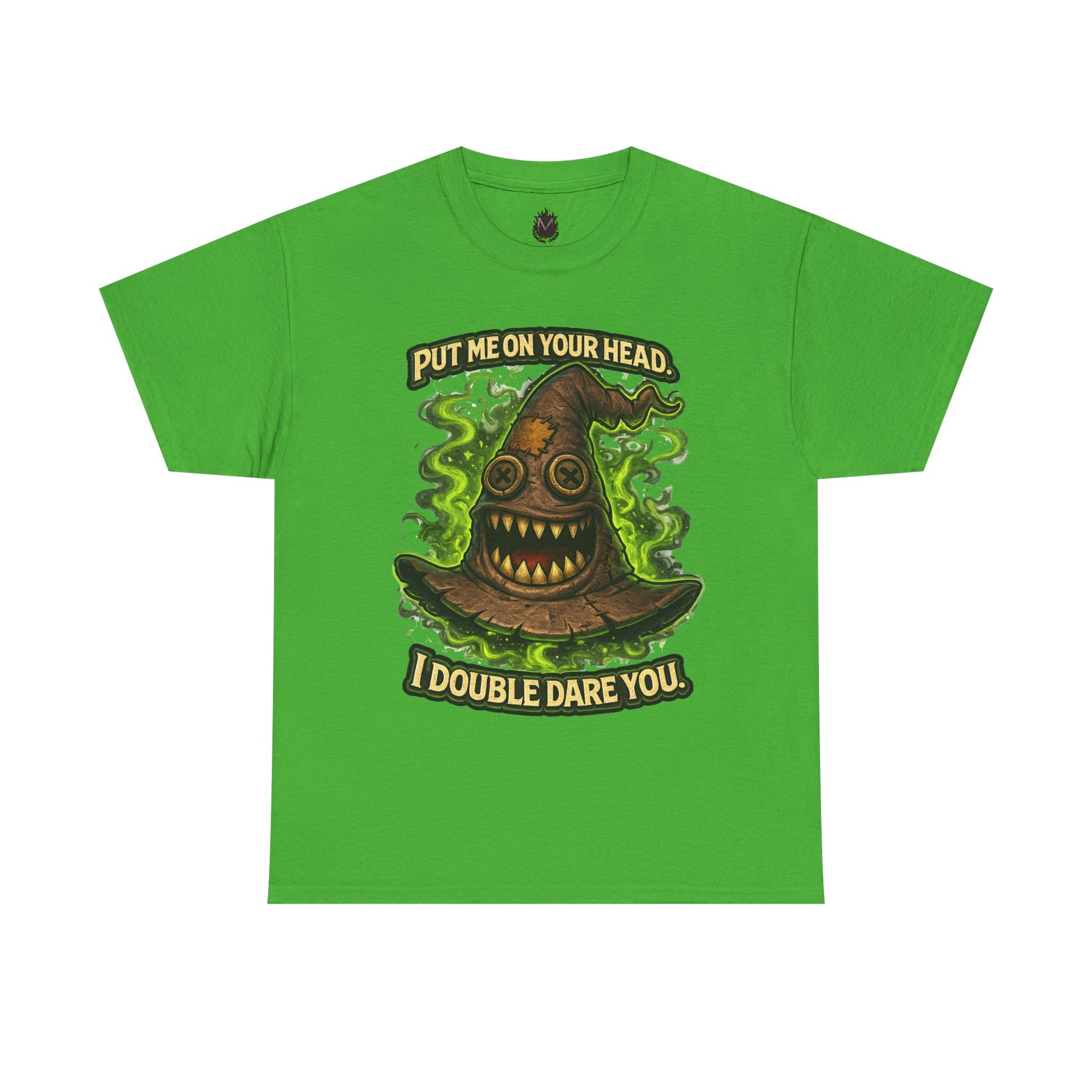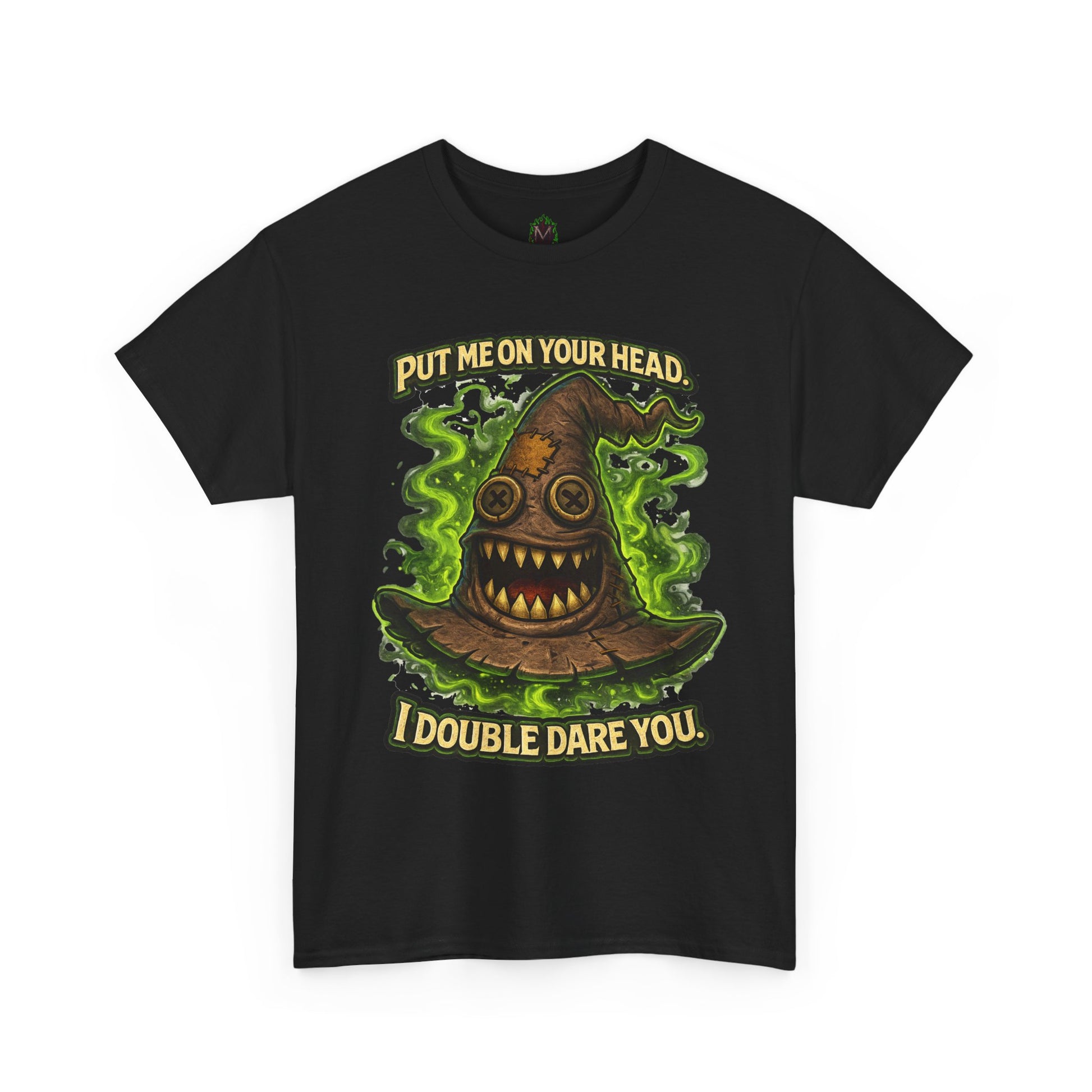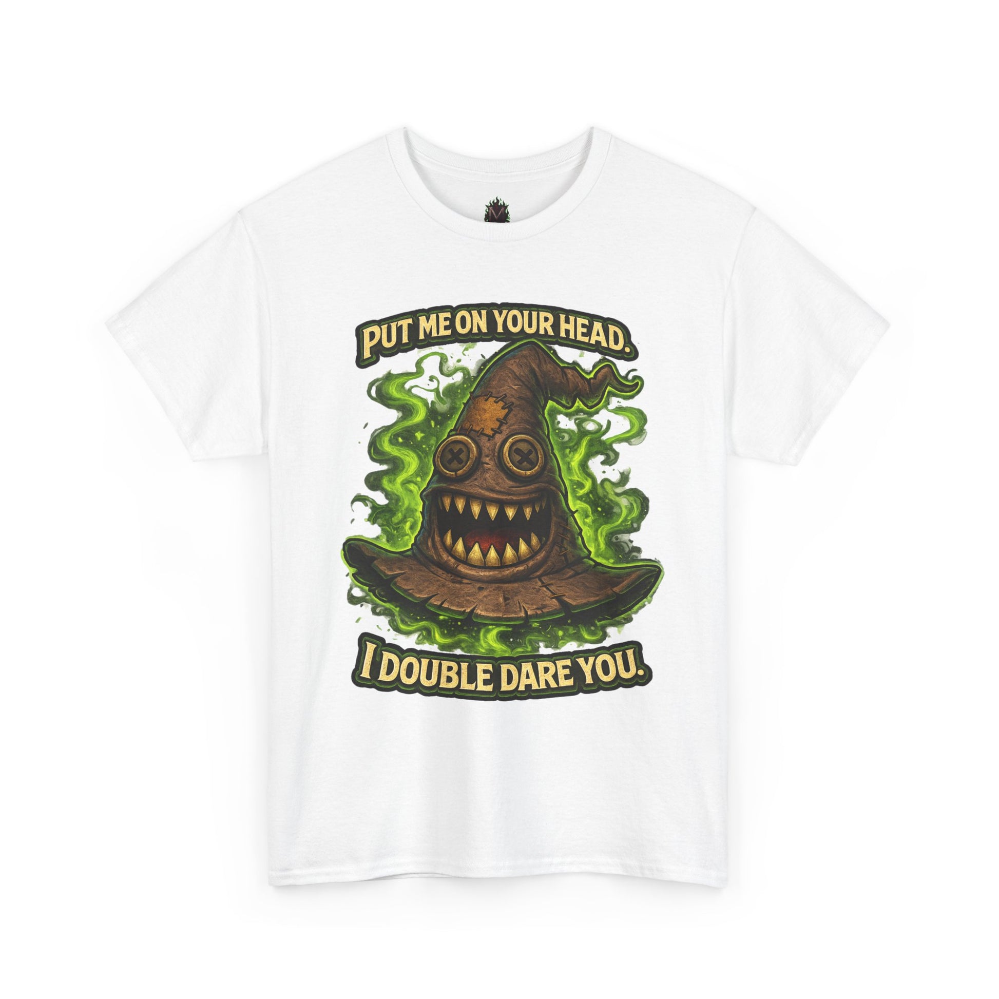Slip into something playful and a little wicked — this tee wears like a wink. The graphic centers on a mischievous, haunted-stump hat wreathed in ghostly green vapors, with the cheeky banner “Put me on your head. I double dare you.” The art pops with rich, earthy tones and crisp linework that stays vivid after washes thanks to DTF/DTG printing. It’s cut from a medium-weight, classic-fit cotton that hangs relaxed at the shoulders and keeps its shape with a ribbed collar and shoulder tape. Wear it while wandering late-night markets, at casual game nights, or whenever you want to spark a grin (or a dare) from the people around you.