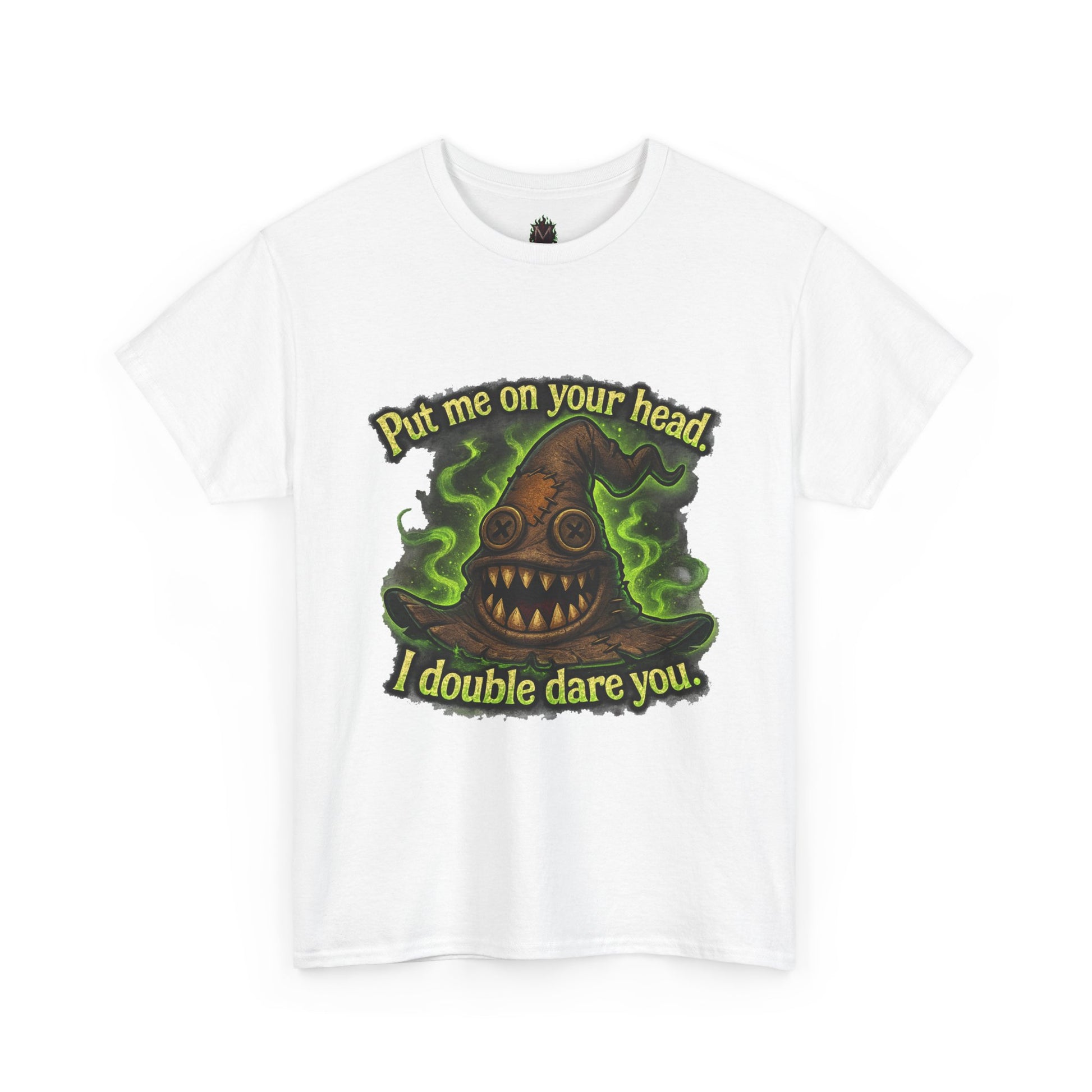 Wearable mischief for anyone who loves dark humor and witchy vibes. This classic cotton tee shows a grinning, sentient witch hat surrounded by sickly green smoke and the taunting line, “Put me on your head, I double dare you.” It reads like a challenge and settles into the kind of wardrobe that prefers sarcasm over subtlety. The medium-weight fabric and relaxed crew fit keep it comfortable from late-night game nights to wandering a Halloween market. The print sits boldly on the chest so the artwork and message stay front-and-center, sparking laughs, double-takes, and conversations wherever you go.