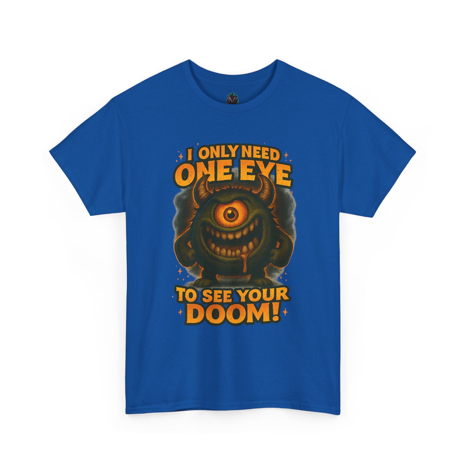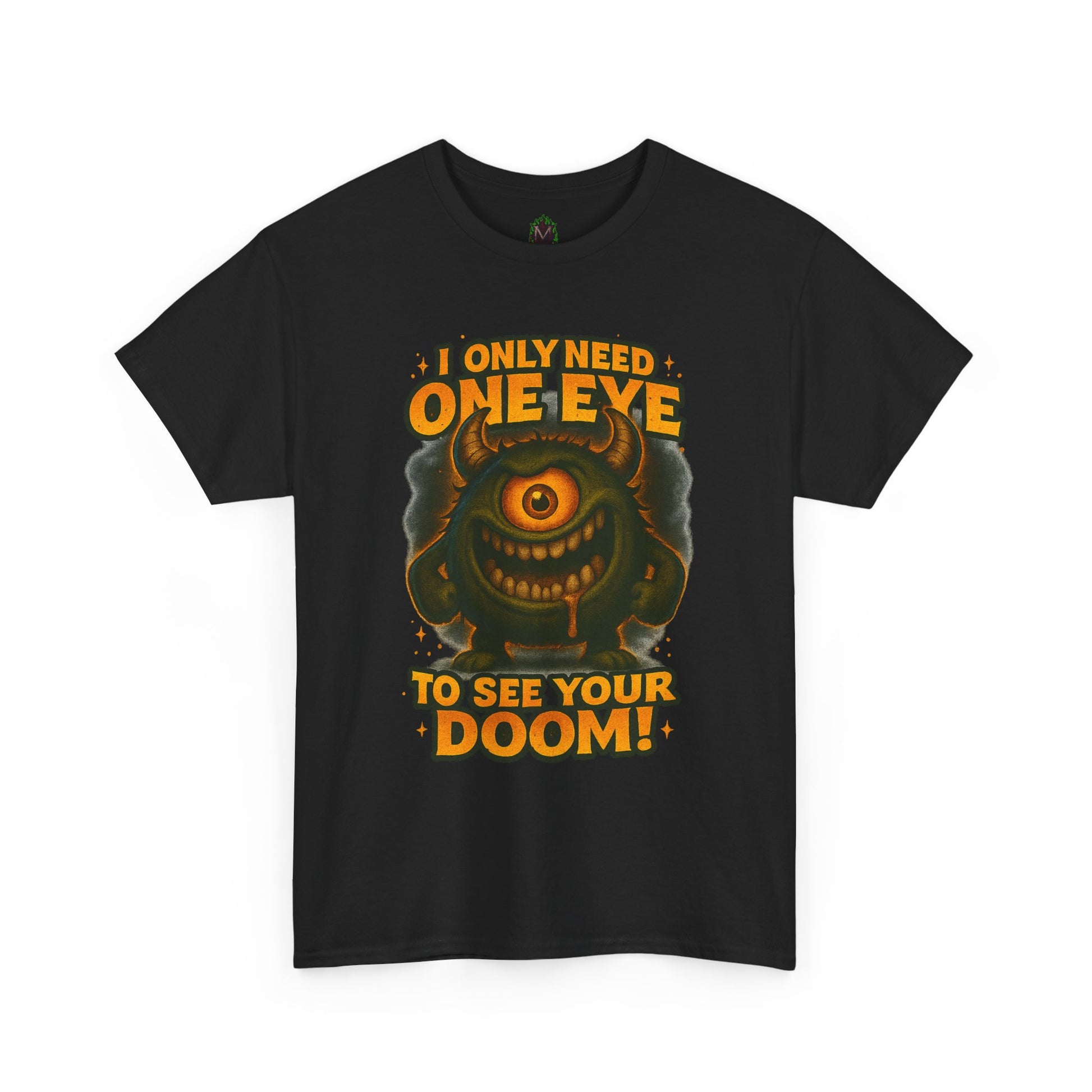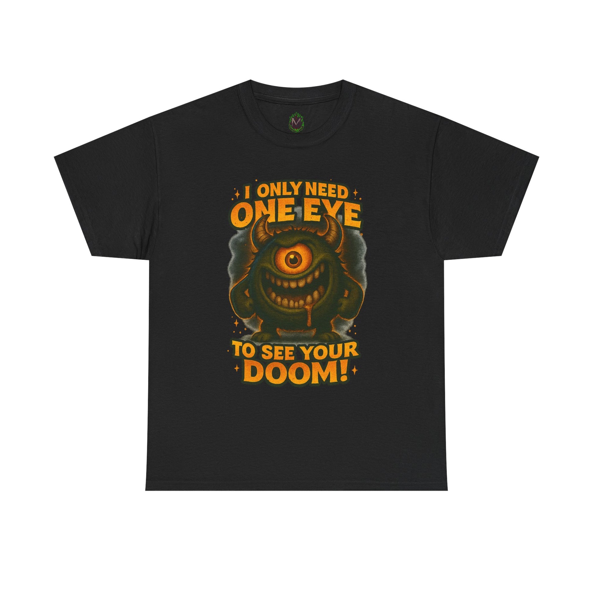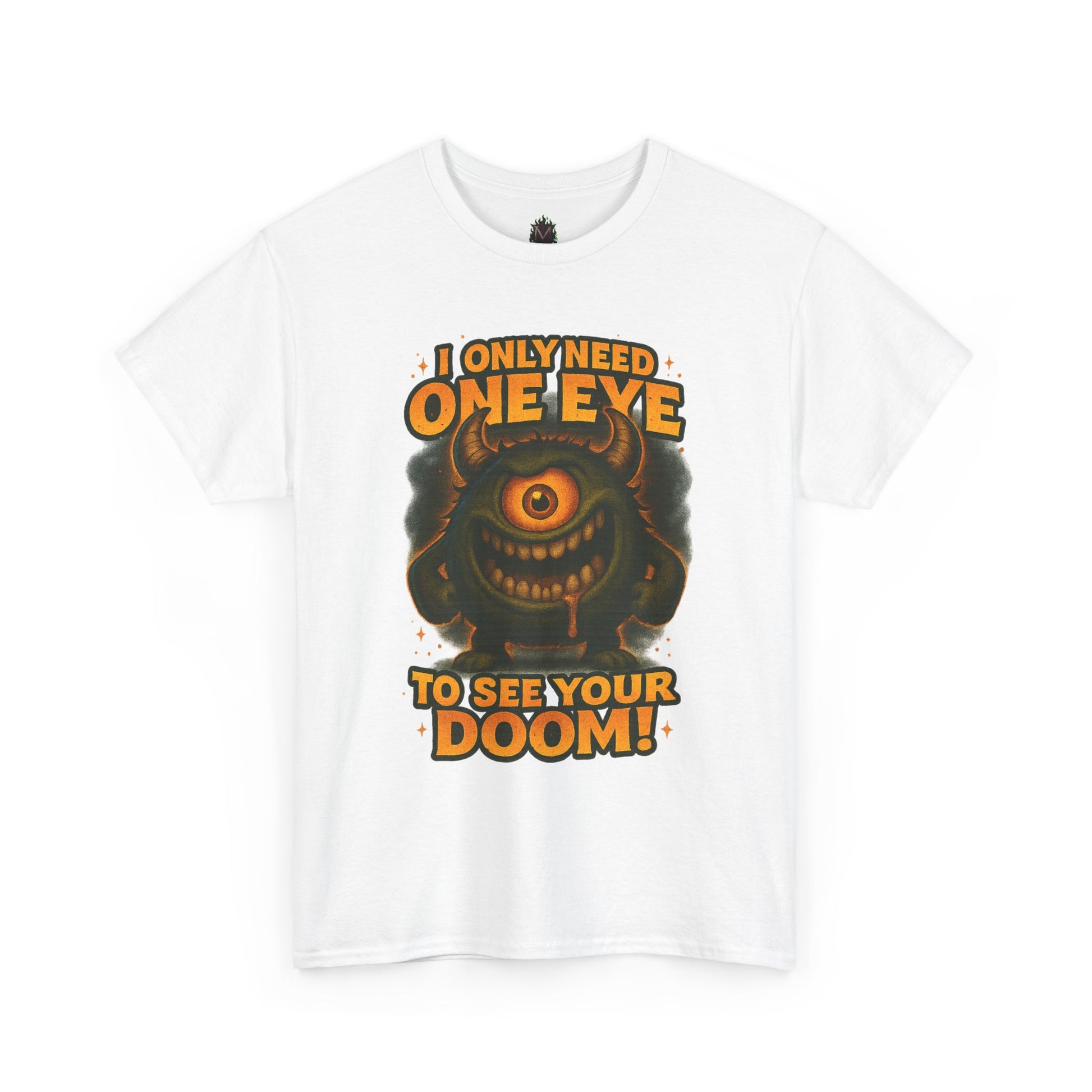 This classic cotton tee puts playful menace front and center — a grinning, single-eyed monster surrounded by bold, retro lettering that reads “I only need one eye to see your doom!” It feels like a page torn from a nostalgic arcade poster: loud, cheeky, and a little wicked. Lightweight but sturdy, the shirt’s clean white backdrop lets the orange and olive tones pop, making the illustration the focal point whether you wear it to a game night, a convention, or just out with friends. The roomy crew neck and relaxed fit make it an easy layer for everyday wear; it sits naturally with denim, hoodies, or under a jacket when you want the art to do the talking. Wear it when you want to bring a dose of dark humor and vintage monster energy to casual hangouts, themed events, or laid-back weekend adventures.