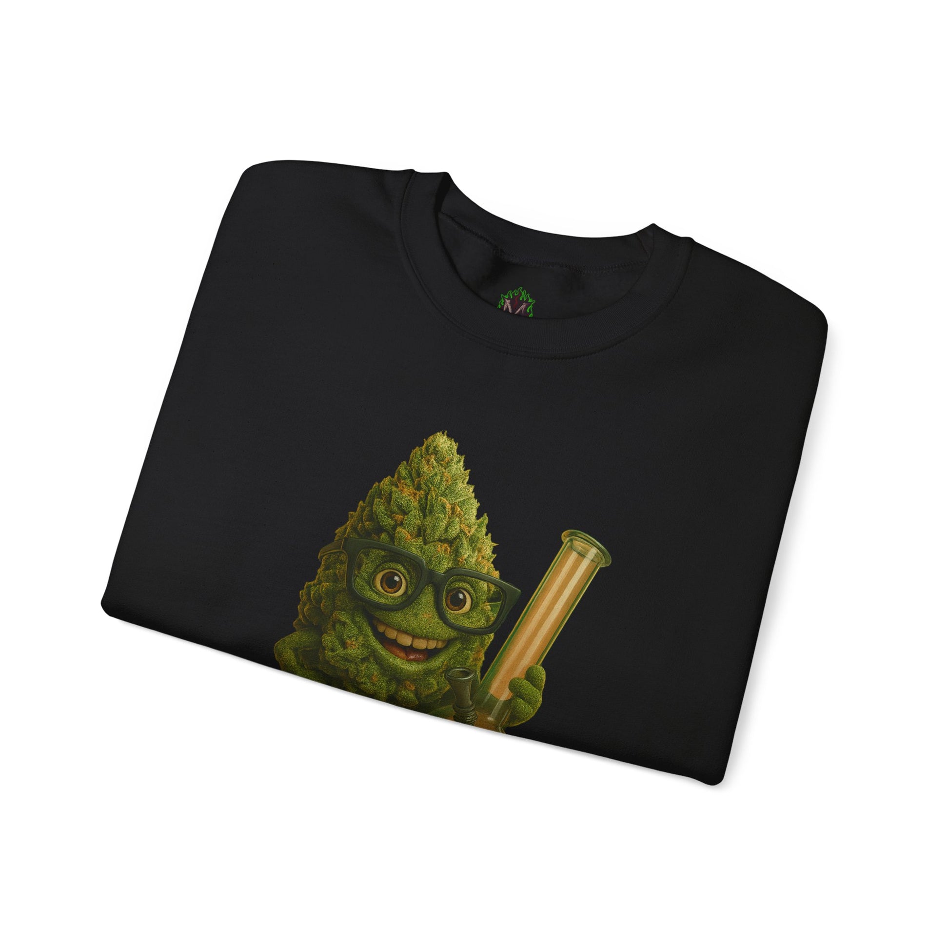 This white crewneck features a grinning green nug with thick glasses and a freshly packed bong.