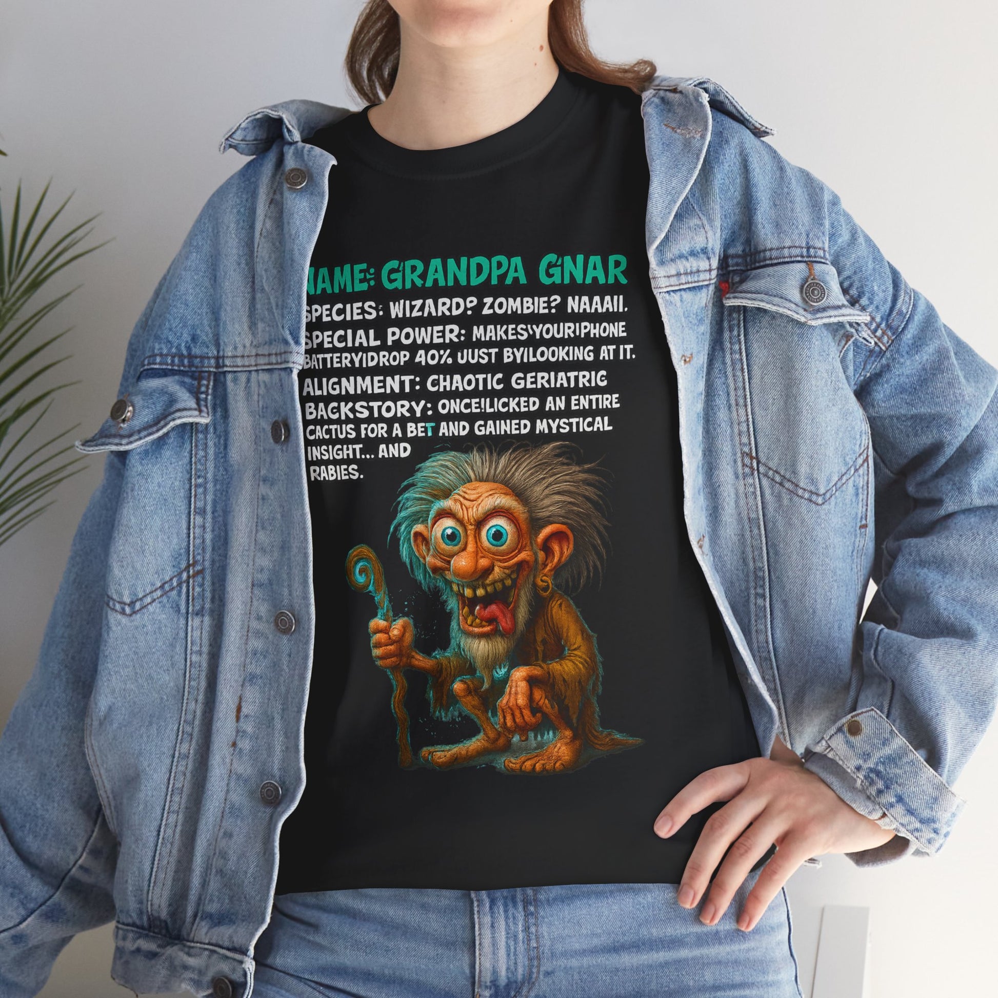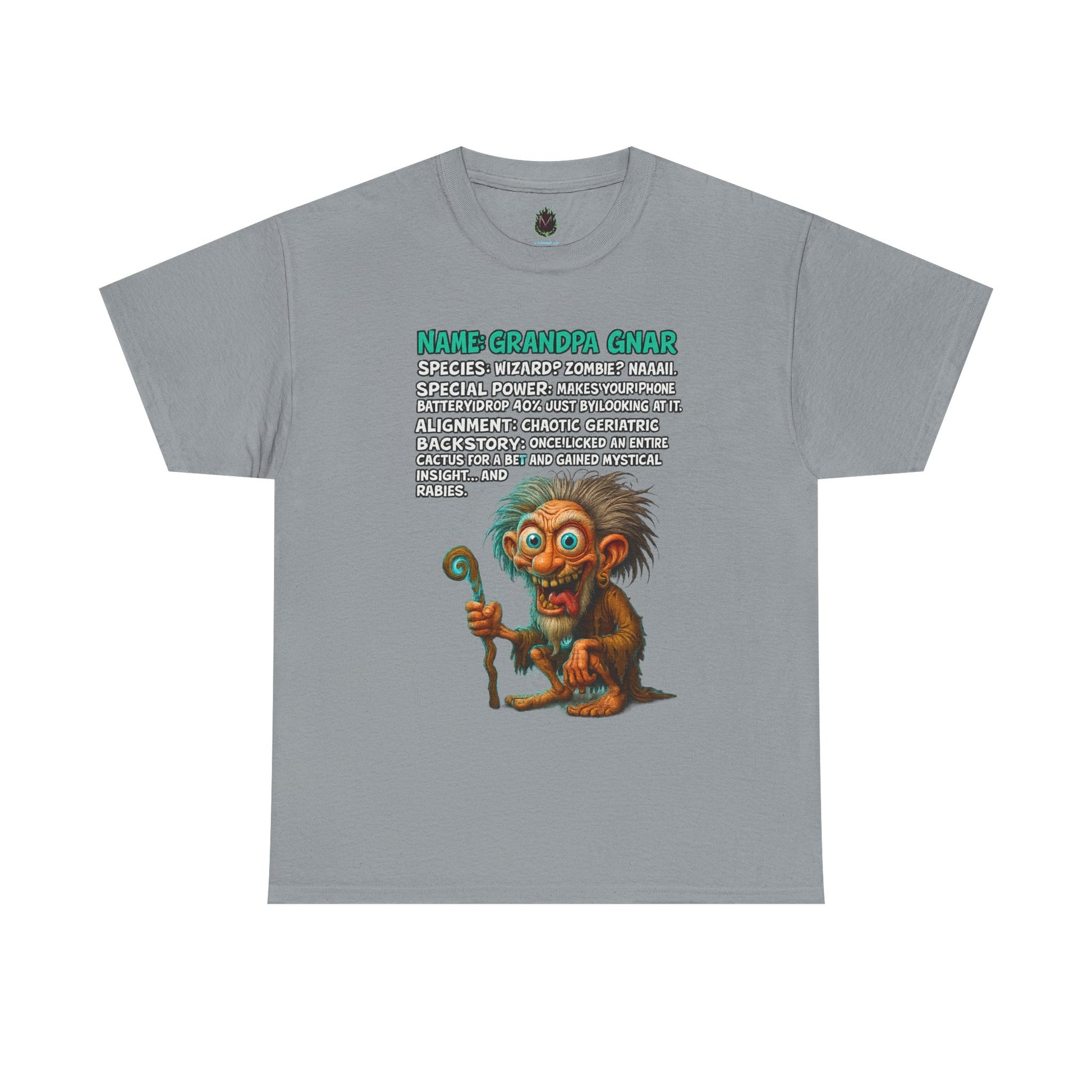 Behold Grandpa Gnar, the mystical menace who drains phone batteries with a glare and once licked a cactus for enlightenment.