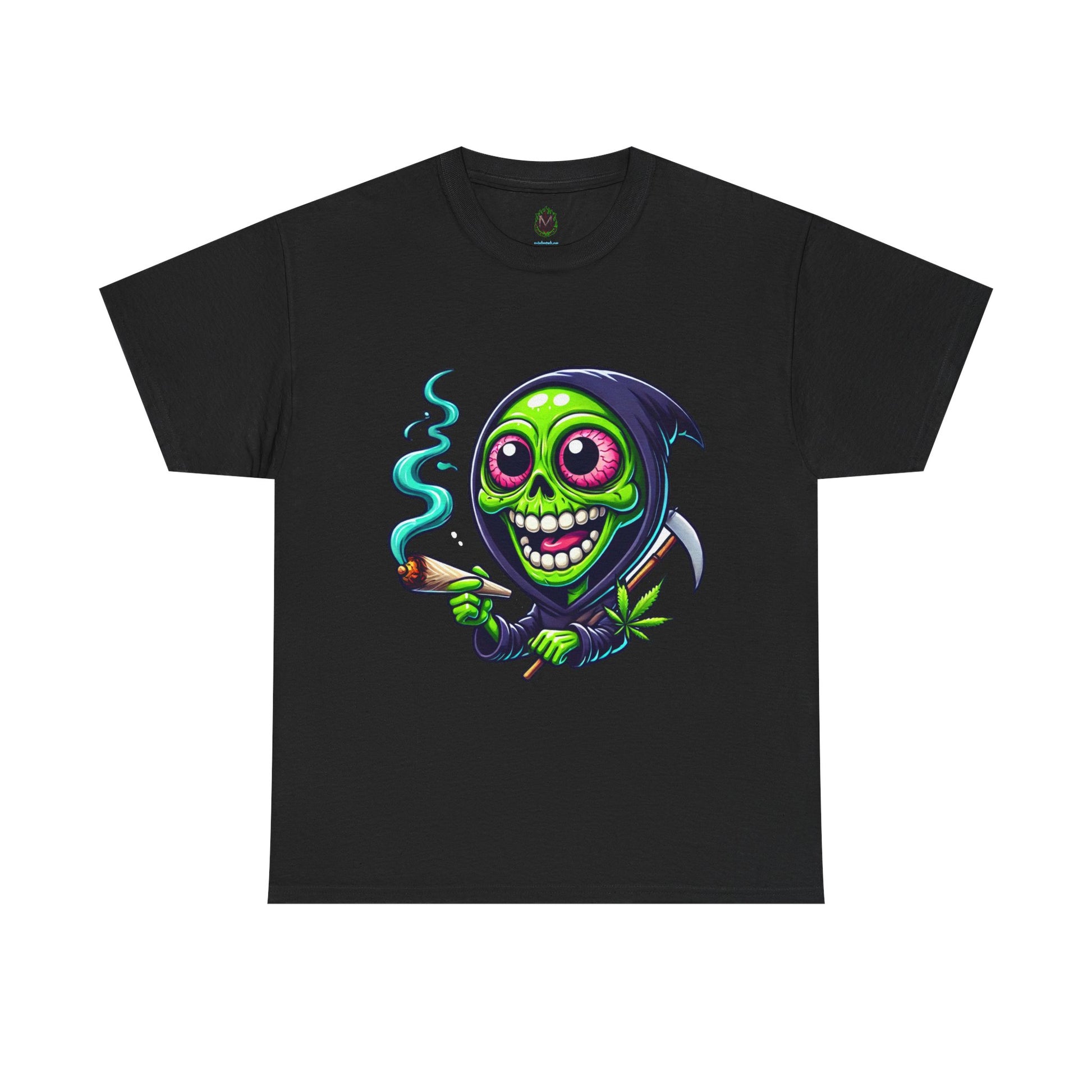 Kick back and relax with the "Grim Reefer" Funny Weed T-Shirt, featuring a humorous spin on the grim reaper character. This vibrant green skeleton, complete with bloodshot eyes and a wide, chill grin, holds a smoking joint and a scythe decorated with a cannabis leaf. Ideal for anyone who enjoys edgy humor, cannabis culture, and unique graphic tees.