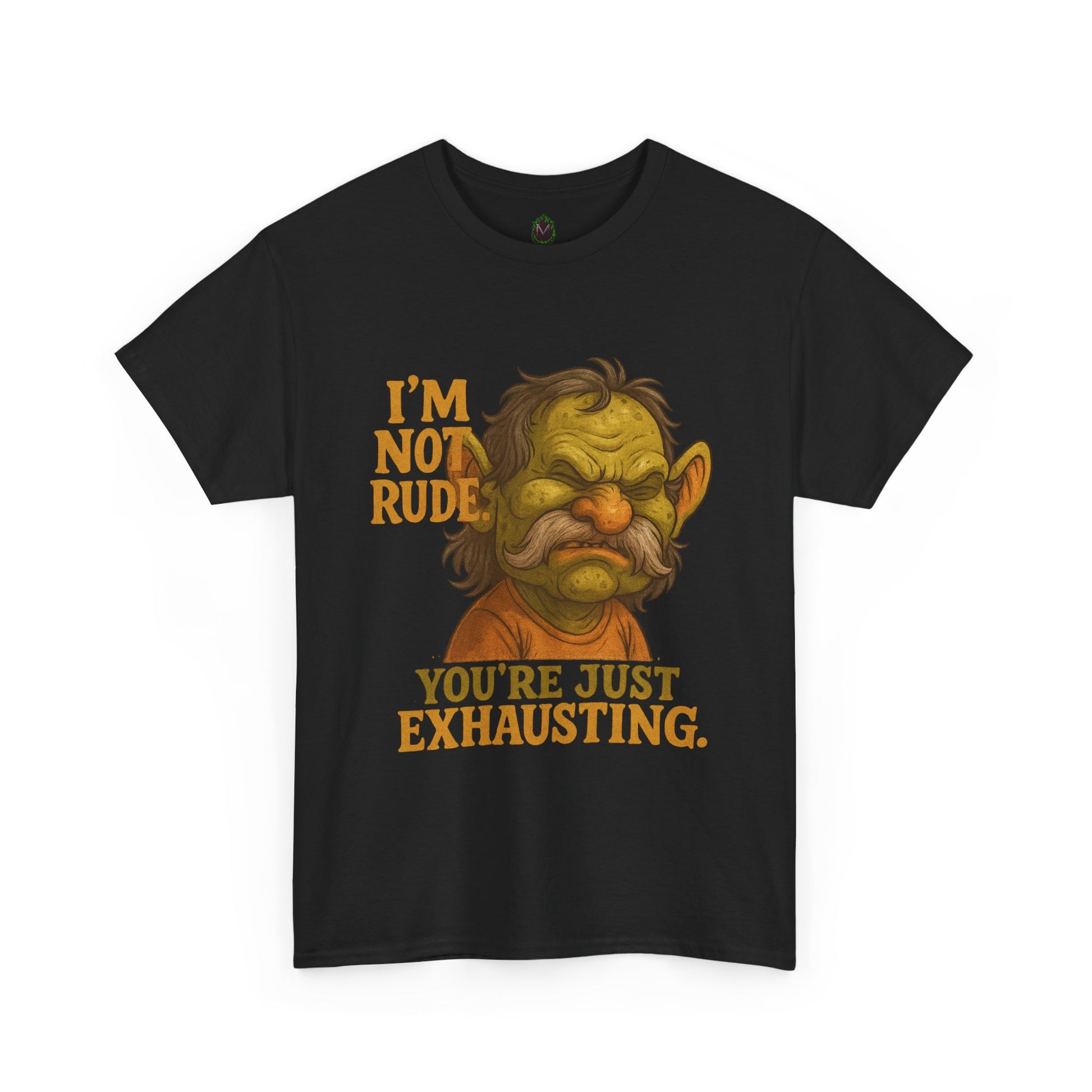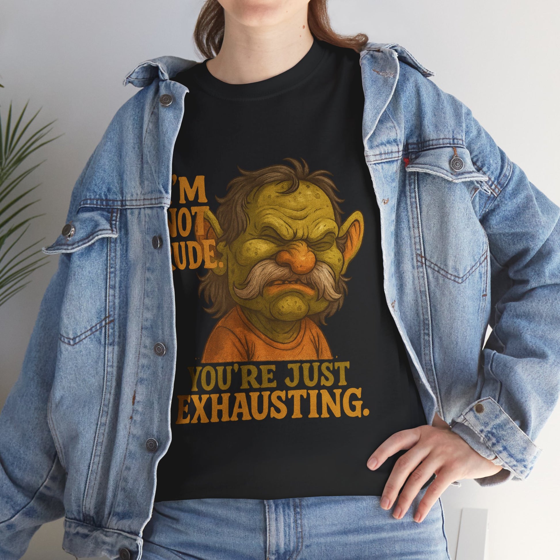 A relaxed, everyday tee that wears its attitude on the chest. Soft, sturdy cotton and a classic crew neckline create a comfortable base for a bold, illustrated face and the cheeky line: “I’m not rude — you’re just exhausting.” It feels like a wry exhale after a long day: sardonic, honest, and quietly protective. Slip it on when you want to signal that you value your peace, whether you’re grabbing coffee, running errands, or decompressing with friends. The illustration’s warm, earthy tones sit nicely on the natural white fabric, giving the design a vintage, hand-painted vibe that reads playful rather than mean. Built to last with stable seams and a tear-away label, this tee stays cozy and print-ready wash after wash.