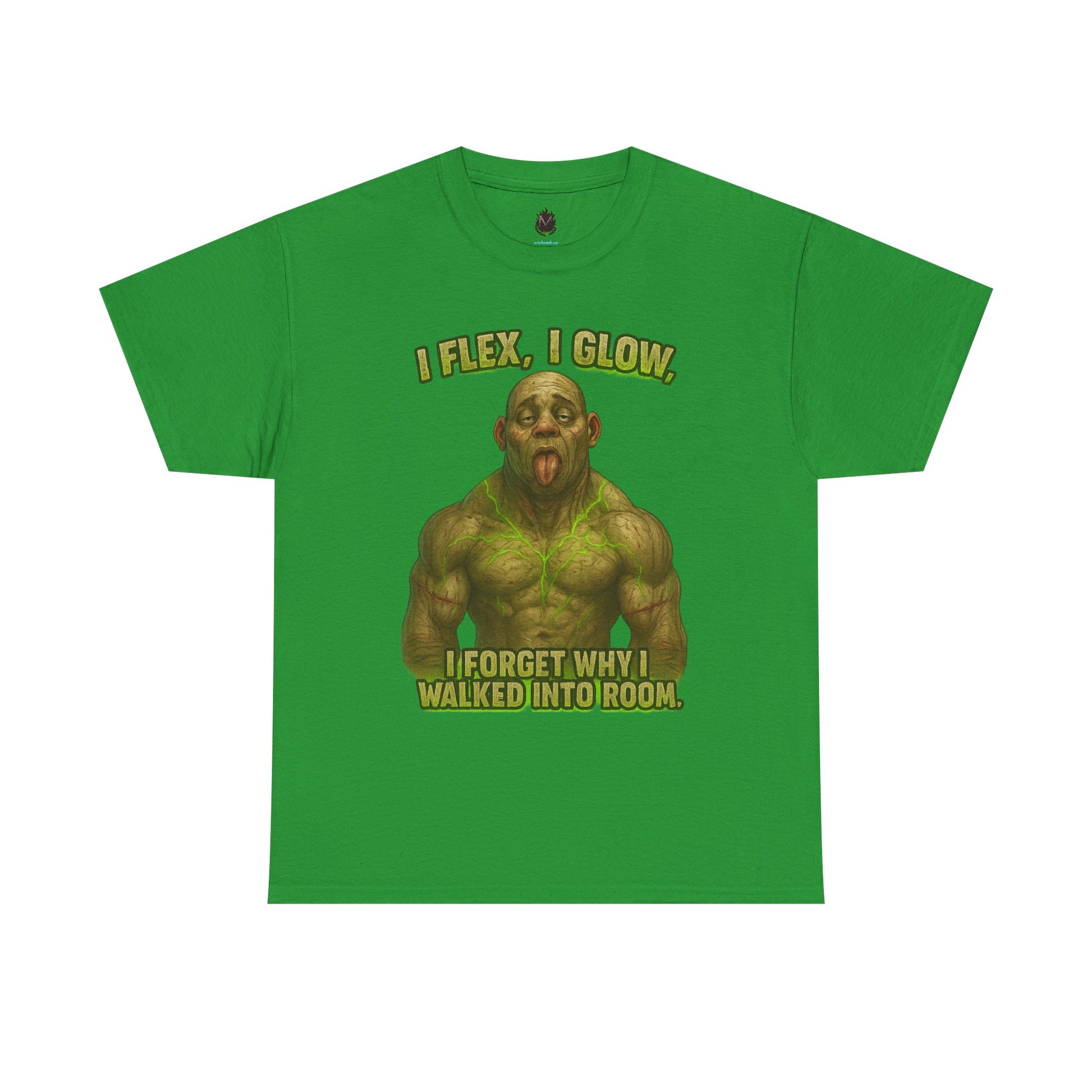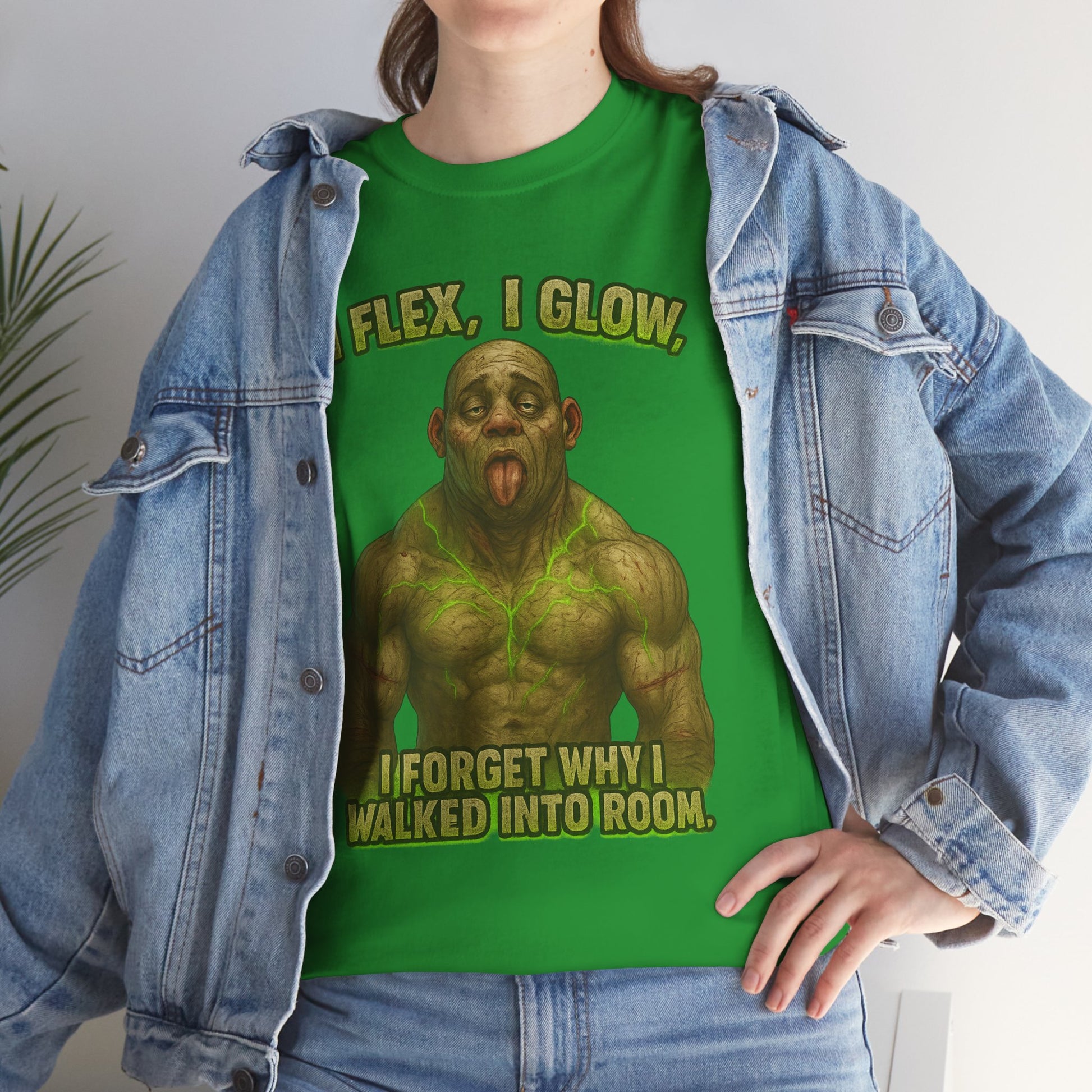 This relaxed cotton tee brings humor and personality to everyday wear. A bold, neon-green muscle figure with a goofy expression and the caption “I FLEX, I GLOW, I FORGET WHY I WALKED INTO ROOM” sits front-and-center, turning a simple shirt into a conversation starter. The medium-weight cotton feels sturdy yet breathable, so it moves with you during gym sessions, errands, or laid-back hangouts. Clean crew neckline and classic fit create a familiar silhouette that layers easily under jackets or wears solo. The playful design reads like a wink to anyone who’s ever walked out of a room wondering what they came for — it’s for people who don’t take themselves too seriously and like to wear that sense of humor on their sleeve (or chest). Durable printing methods ensure the image stays vivid wash after wash, while the tear-away label and reinforced shoulders keep the shirt comfortable day after day.