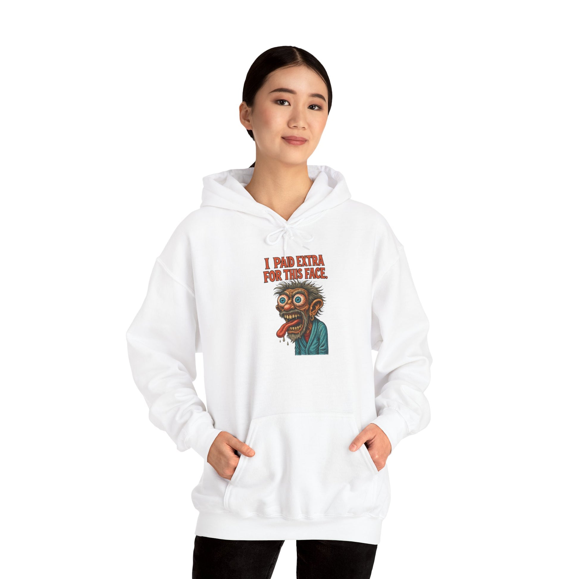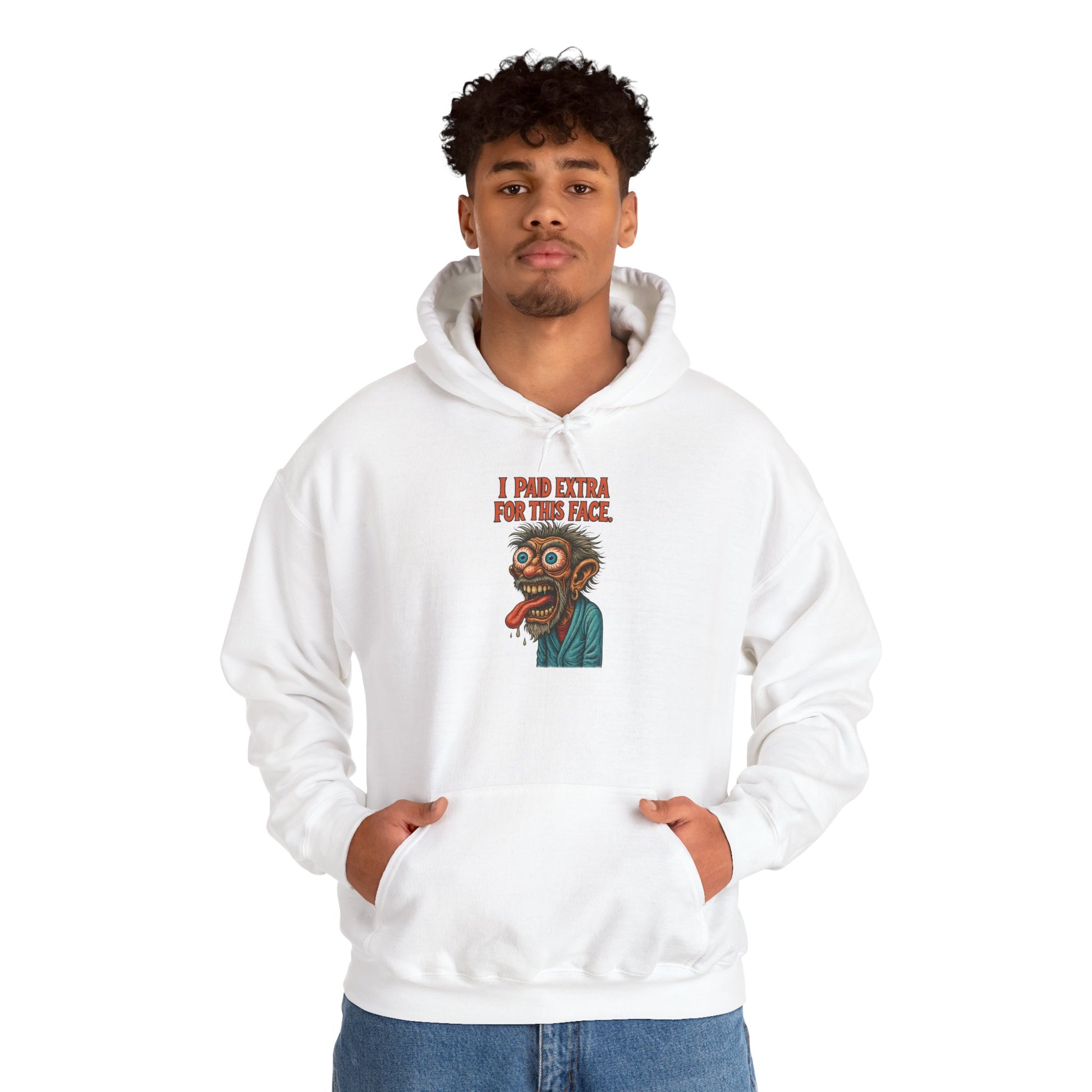 This hoodie features a delightfully deranged mug, complete with bugged-out eyes, a lolling tongue, and a grin that screams “no refunds.”