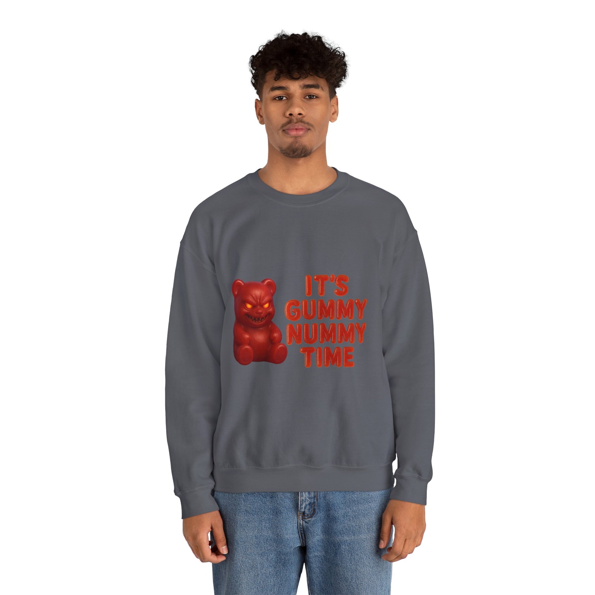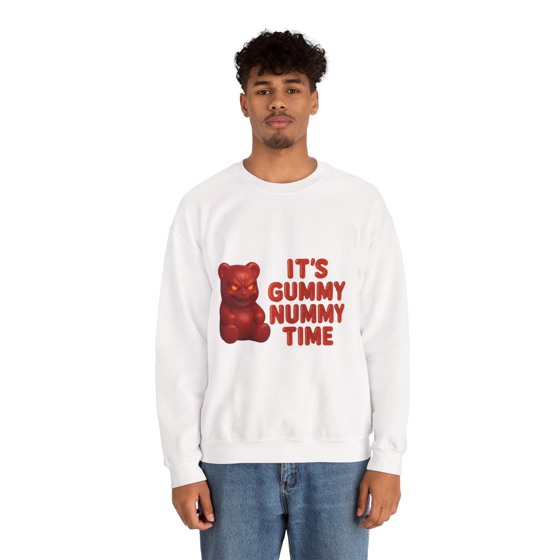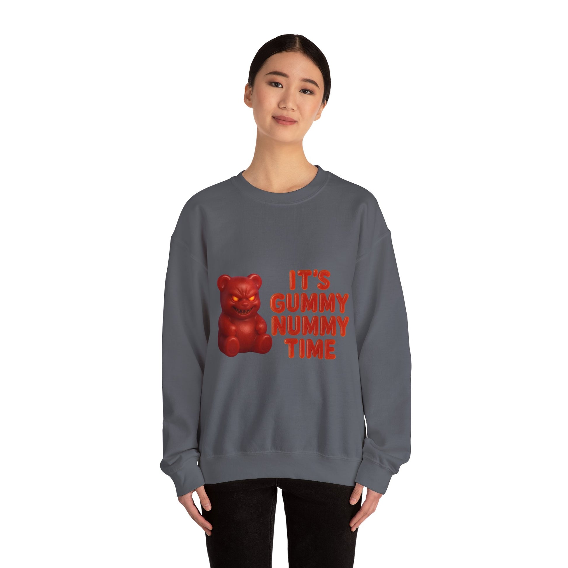 This sweatshirt features a devilishly grinning gummy bear and the bold text “It’s Gummy Nummy Time.” Perfect for candy lovers with a dark sense of humor, this piece blends innocent snack vibes with a mischievous twist.