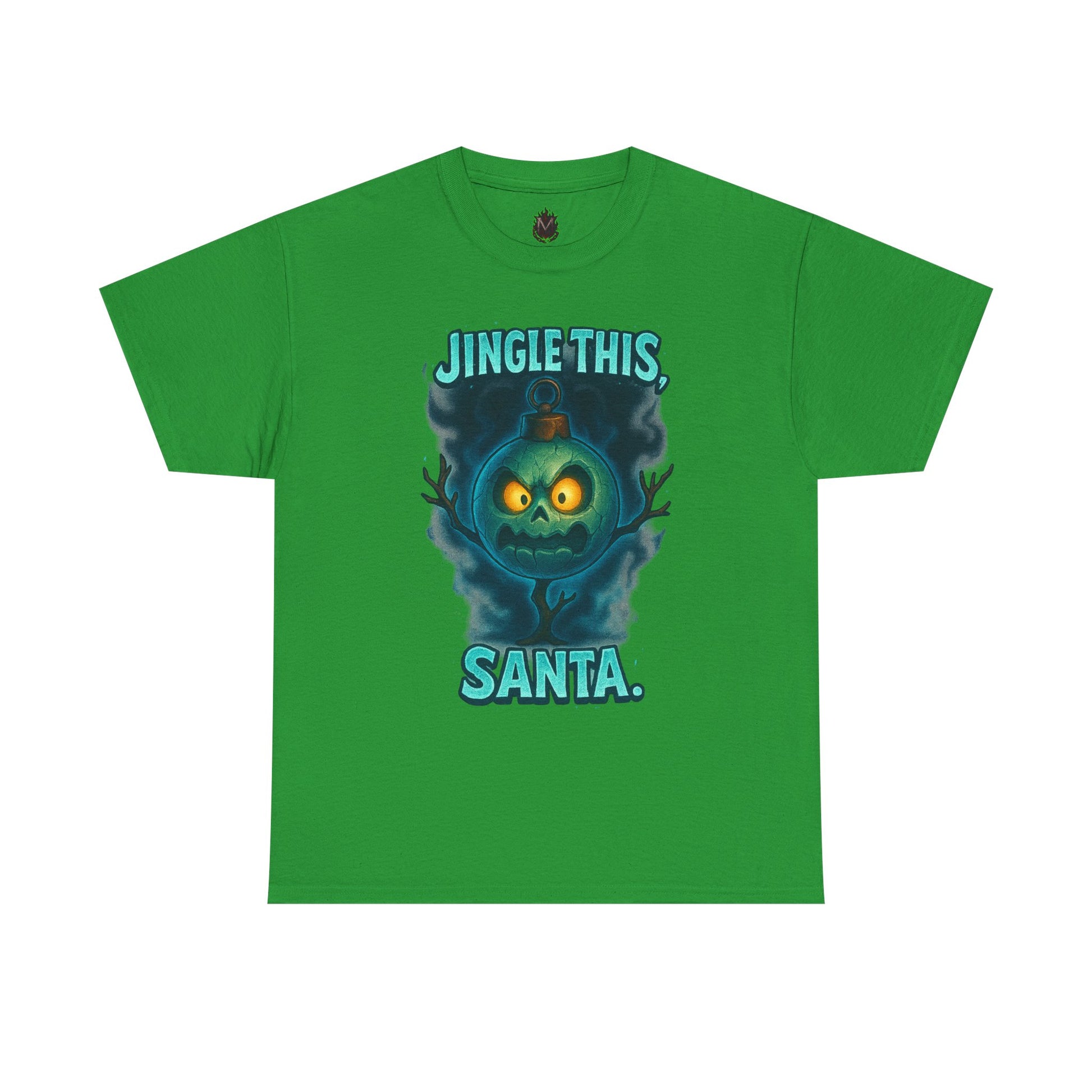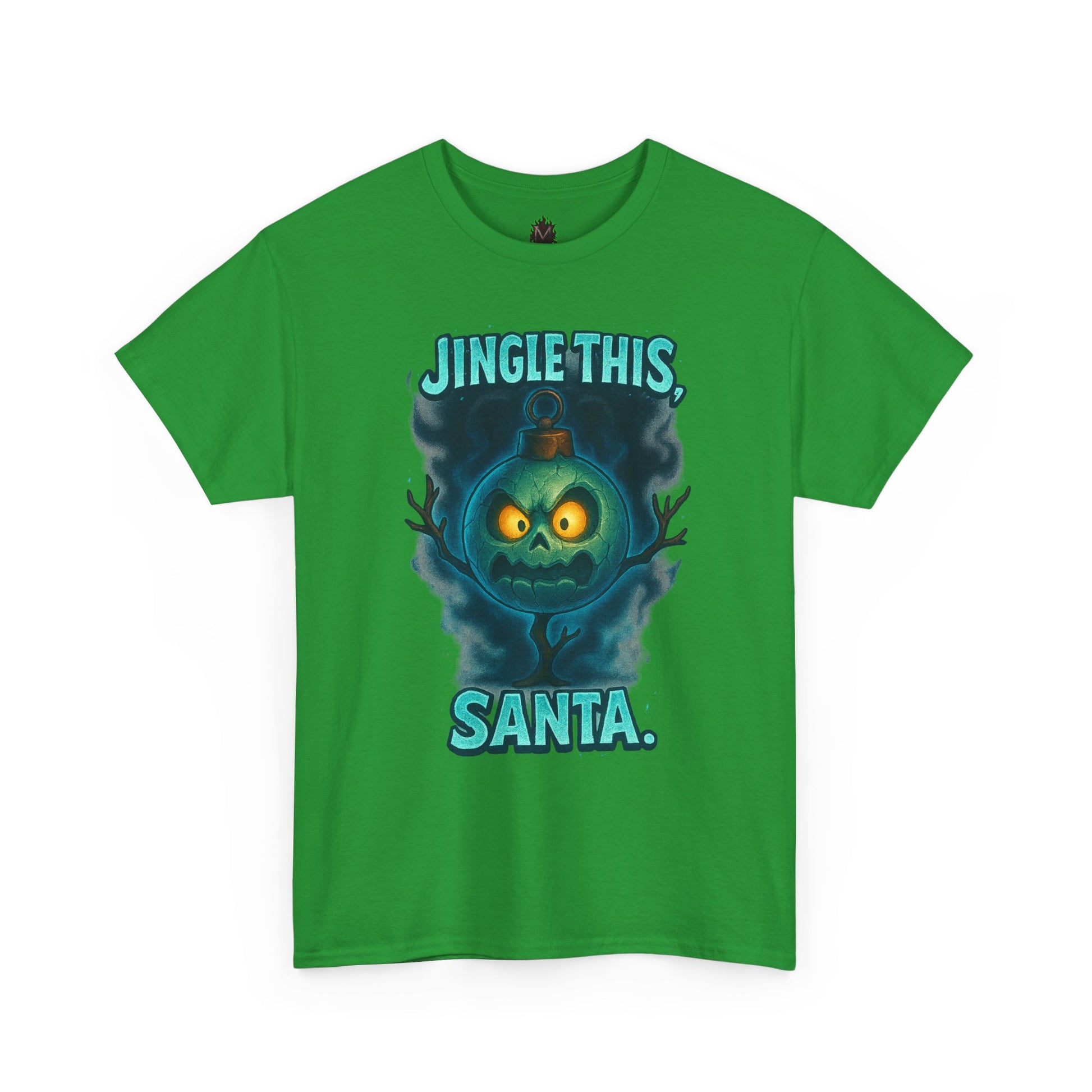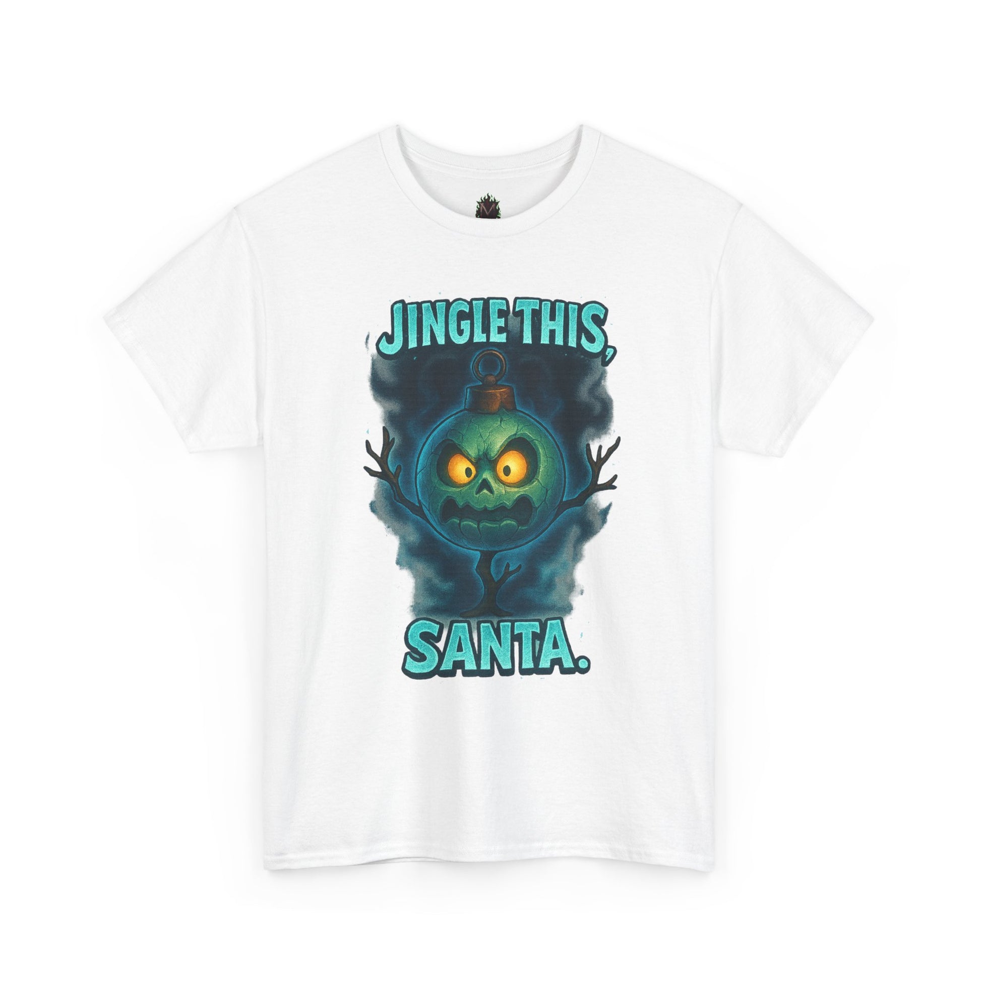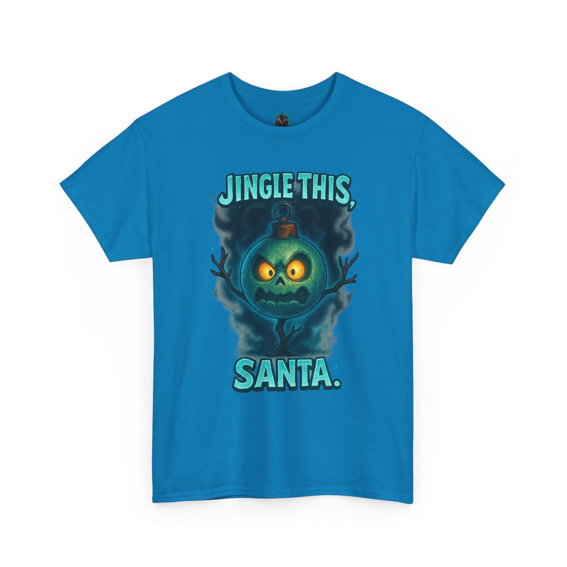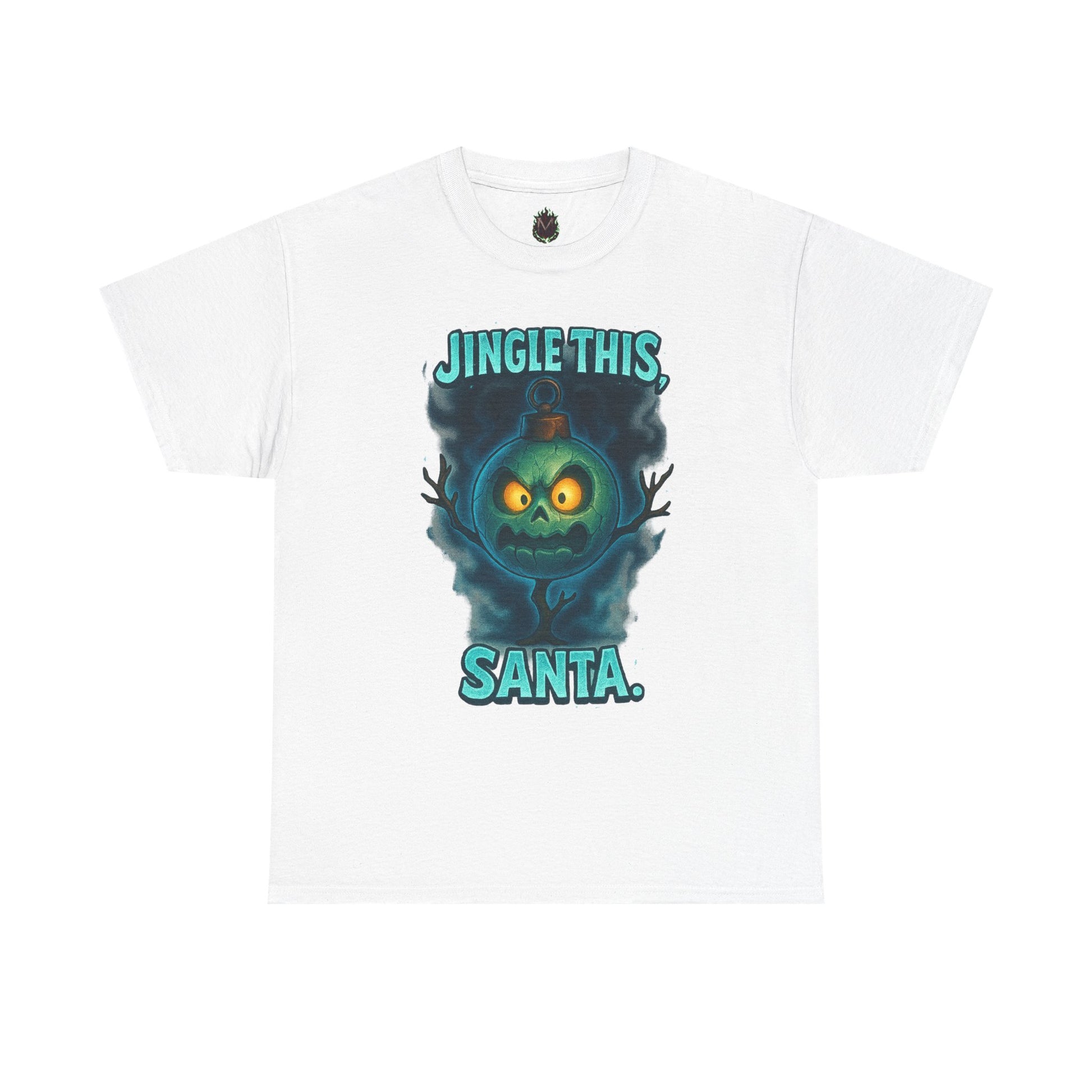 A bold, tongue-in-cheek holiday tee that flips festive cheer into cheeky attitude. The front shows a moody, glowing jack-o’-lantern-style face framed in smoky teal with the playful line “JINGLE THIS, SANTA.” It wears like a nod to dark-humor holiday lovers — cozy, relaxed, and made to be worn through chaotic wrapping nights, late-night carols, or rowdy holiday parties. The medium-weight cotton feels familiar and sturdy, and the clean crew neckline and classic fit make it easy to layer under a flannel or wear on its own. This shirt carries an offbeat seasonal vibe: it’s the kind of piece you reach for when you want to stir laughs, start conversations, and wear your mischievous mood proudly during winter gatherings.