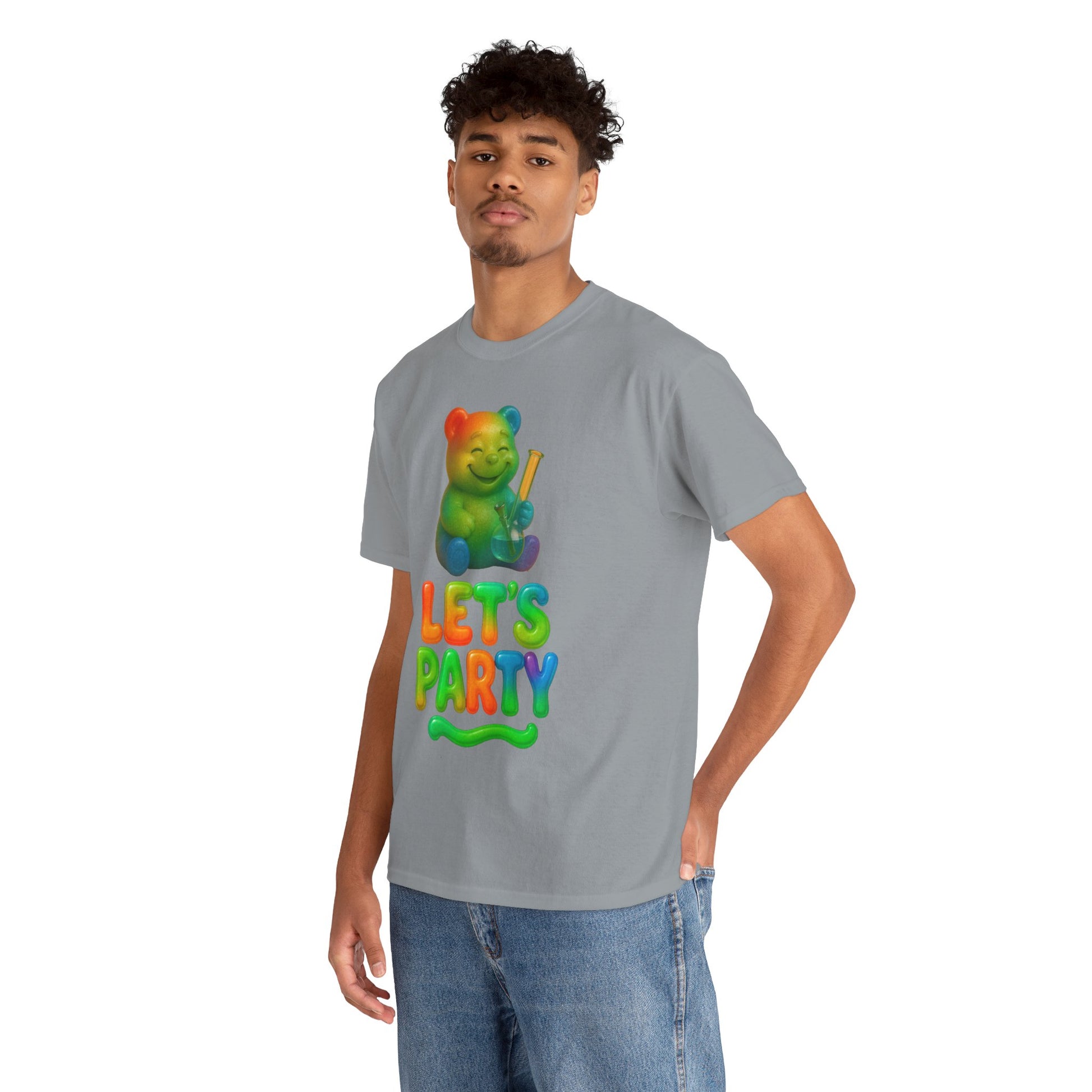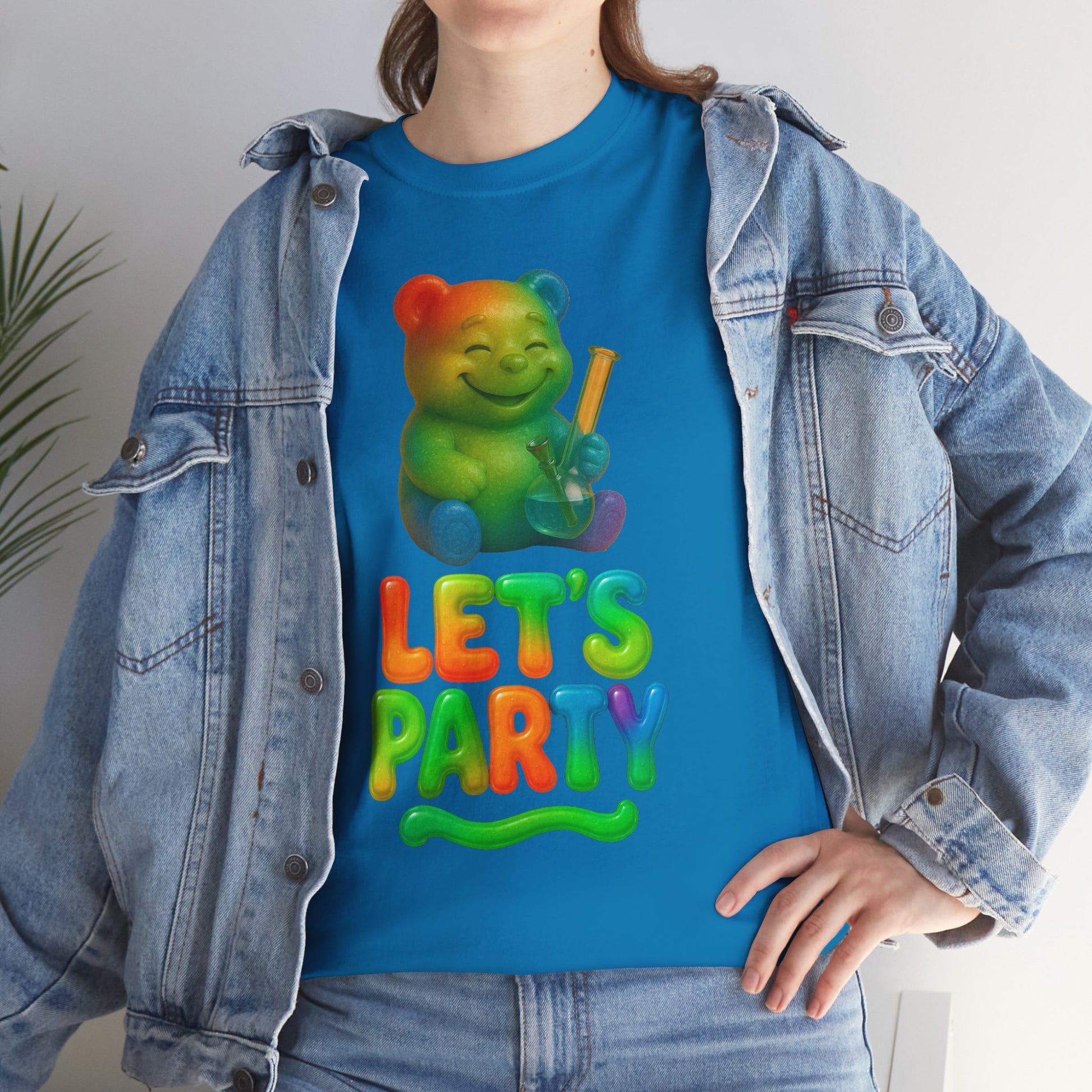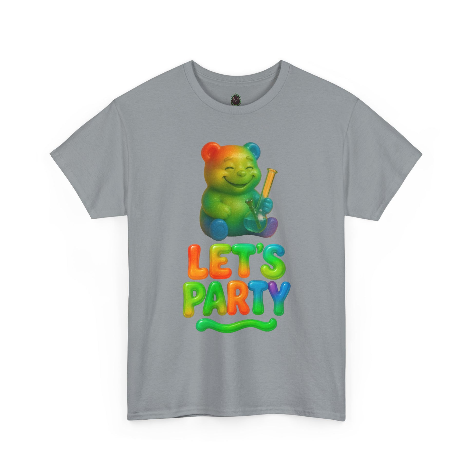 This gummy came to party—and brought the good stuff. Featuring a happy rainbow bear clutching a bong and bold, bubbly “LET’S PARTY” lettering, this shirt is your new uniform for vibing, blazing, or just being the weirdest snack at the function. It’s soft, bright, and unreasonably cheerful—just like any good party should be.