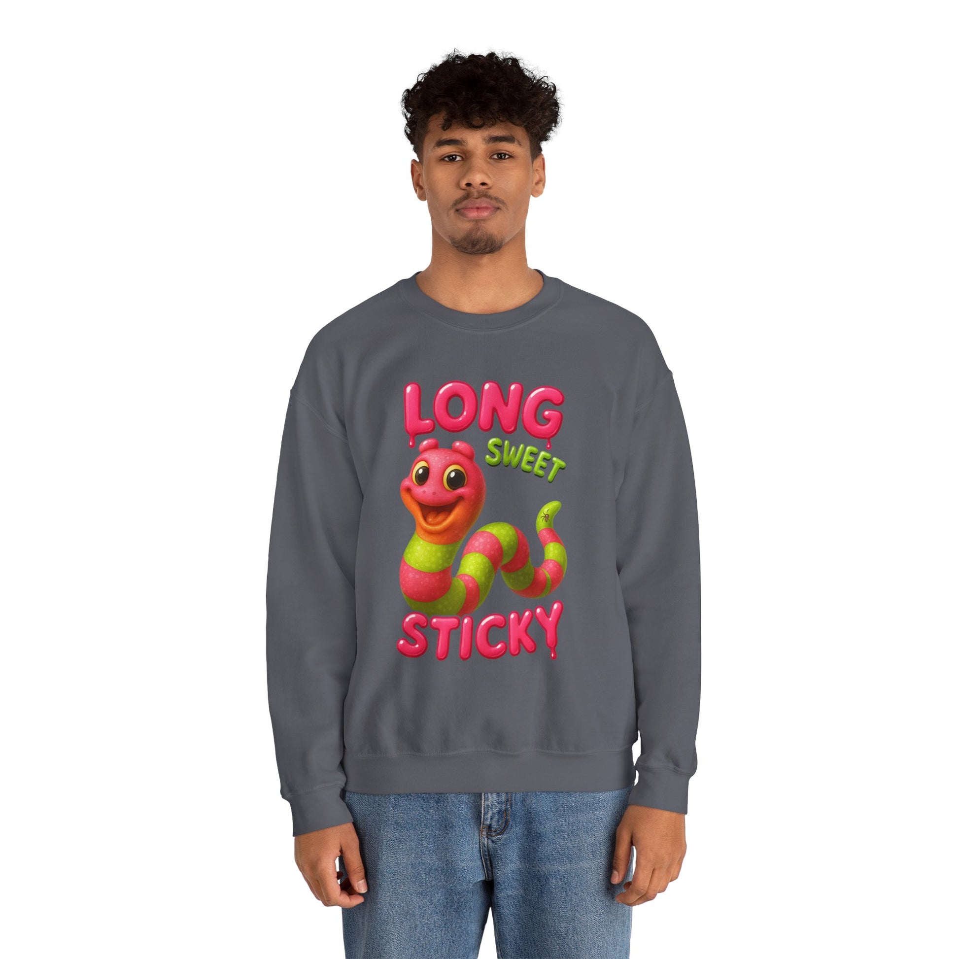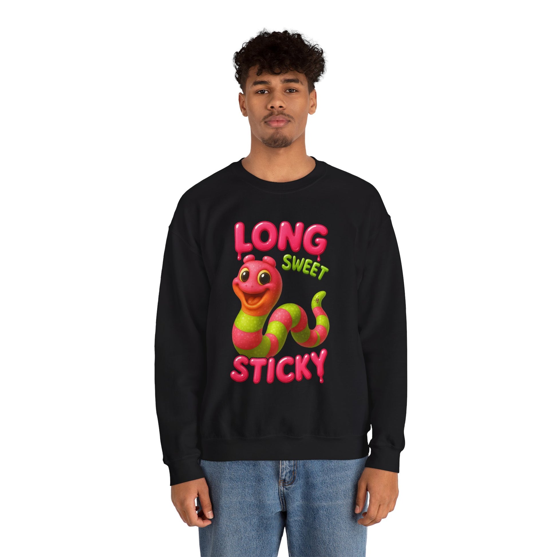 Playfully cheeky and sugar-coated, this crewneck is here to make a statement. Featuring a brightly colored gummy worm with the bold words “Long Sweet Sticky,” it blends candy-shop vibes with a knowing wink. Perfect for those who like their style fun, flirty, and just a little mischievous.