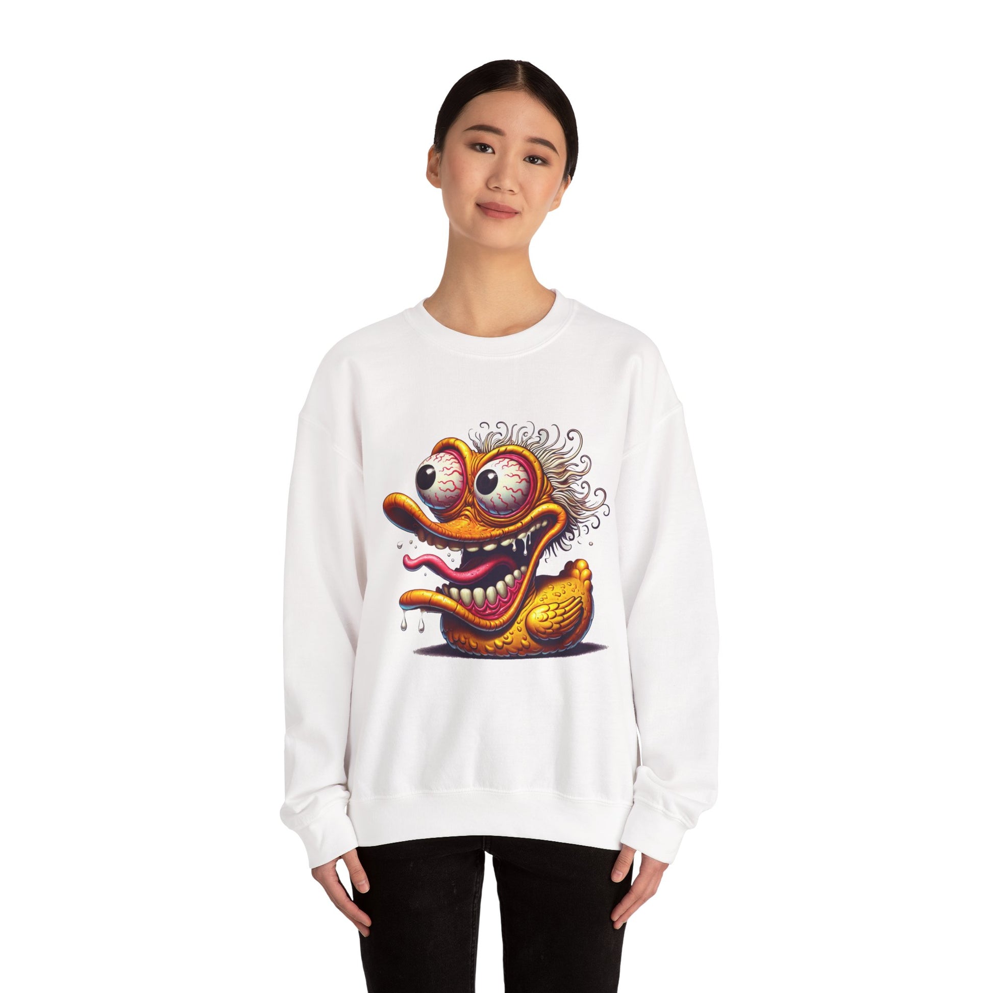 This unhinged bird isn’t here to play it safe. The Loony Loon crewneck features a bright yellow, wild-eyed cartoon duck with a deranged smile and dripping beak. Perfect for anyone who likes their humor loud, chaotic, and impossible to ignore.