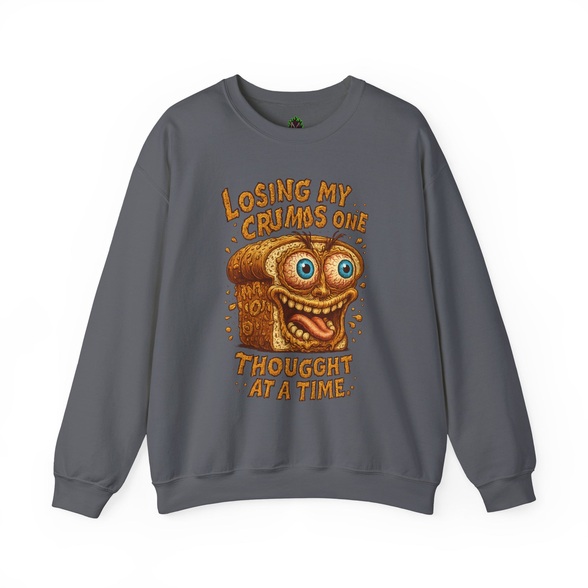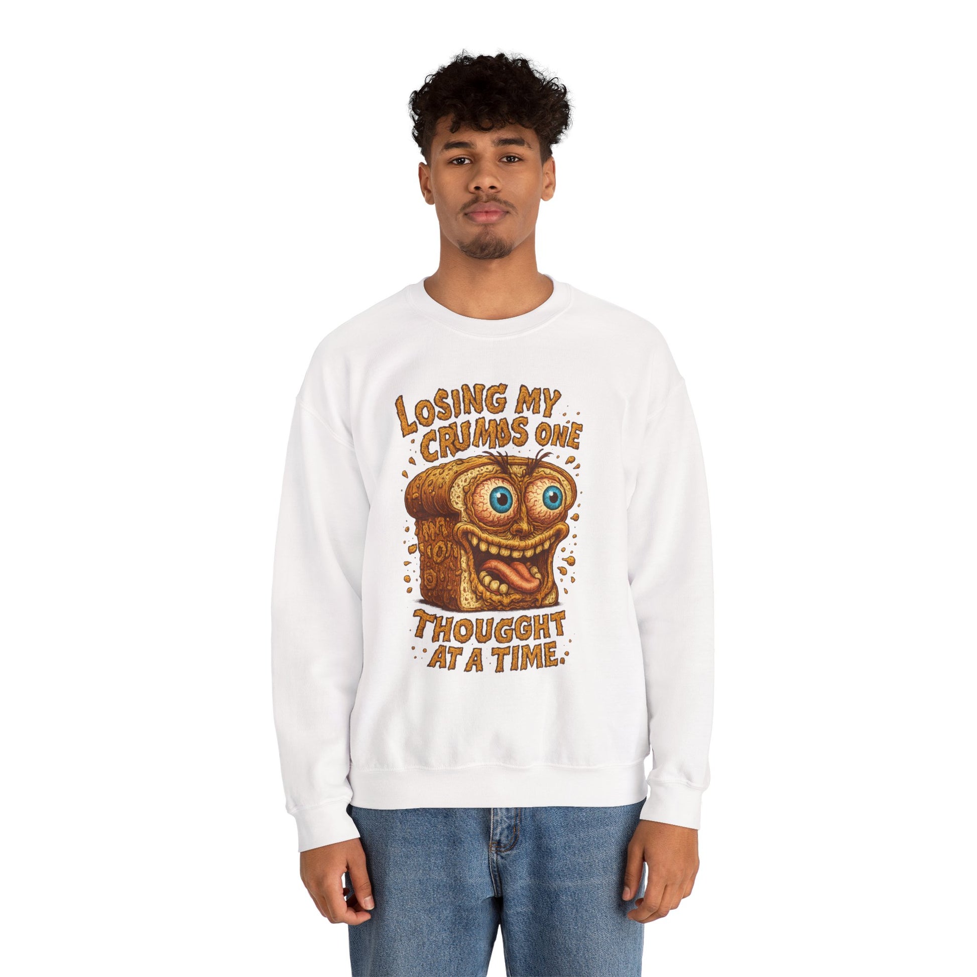 This loaf is toast—and so are your brain cells. Featuring a wild-eyed slice of bread slowly losing its mind, this crewneck captures that beautifully crumbling mental state we all know too well.
