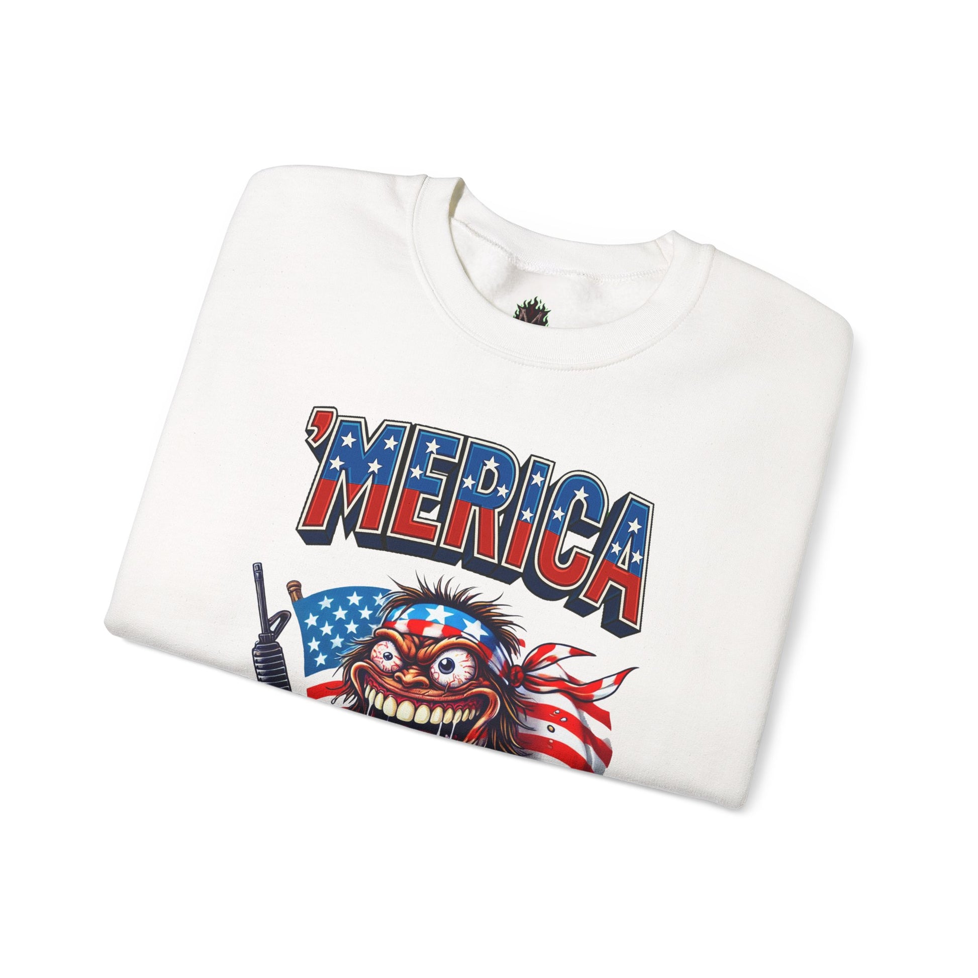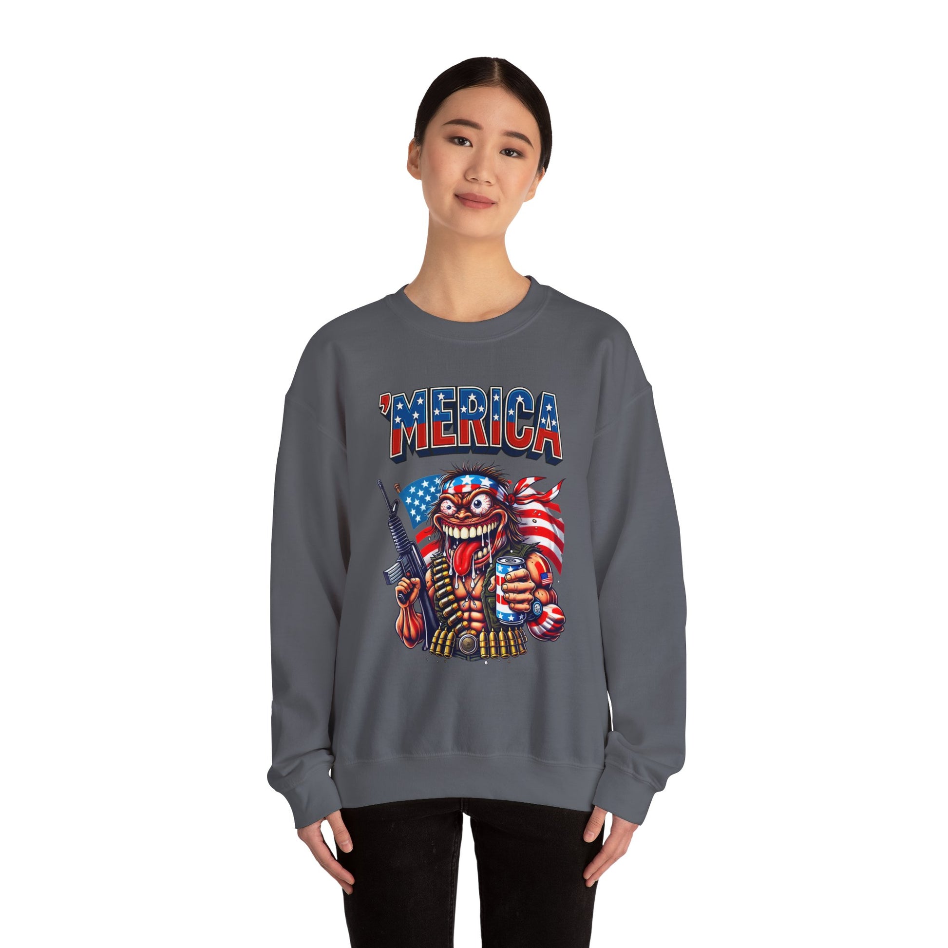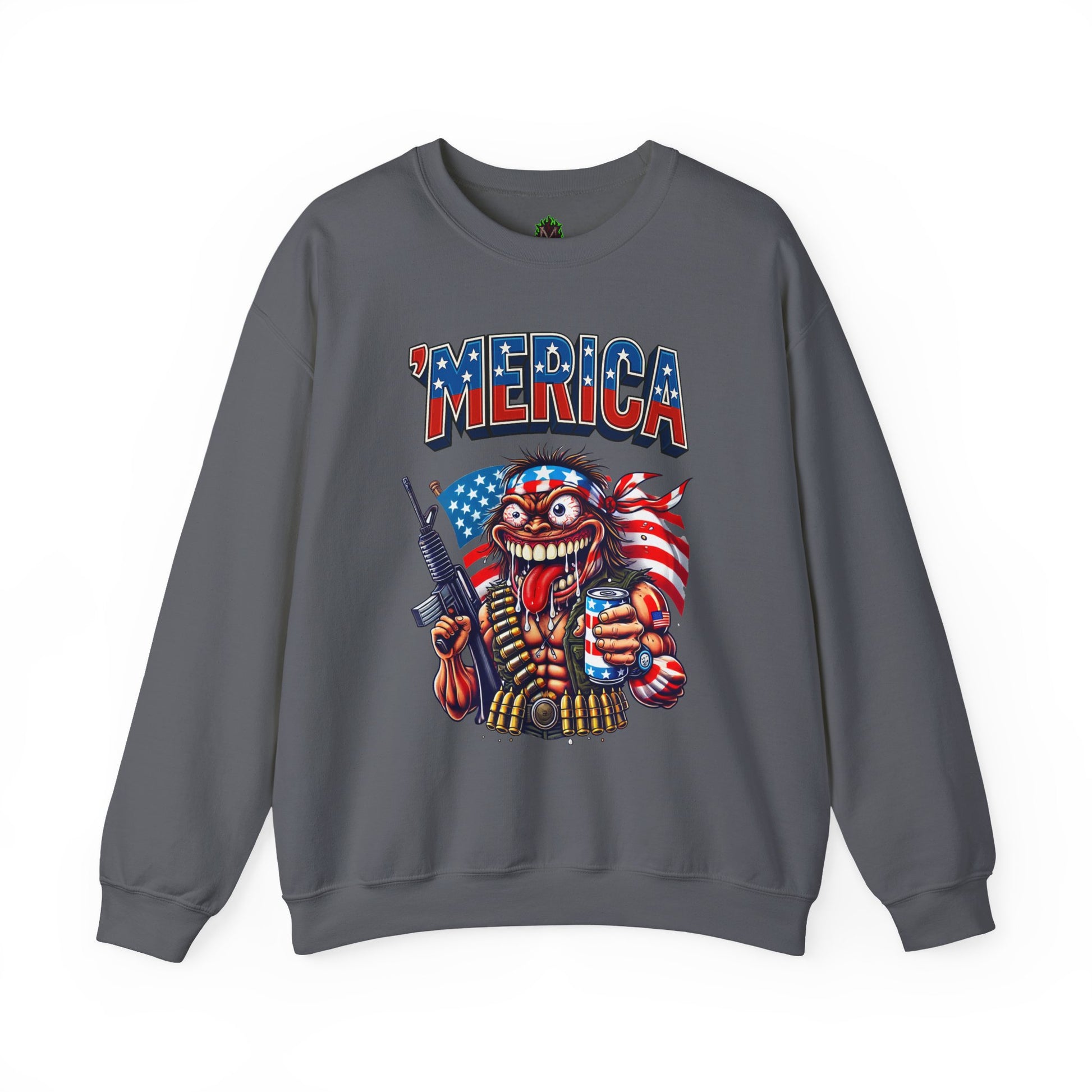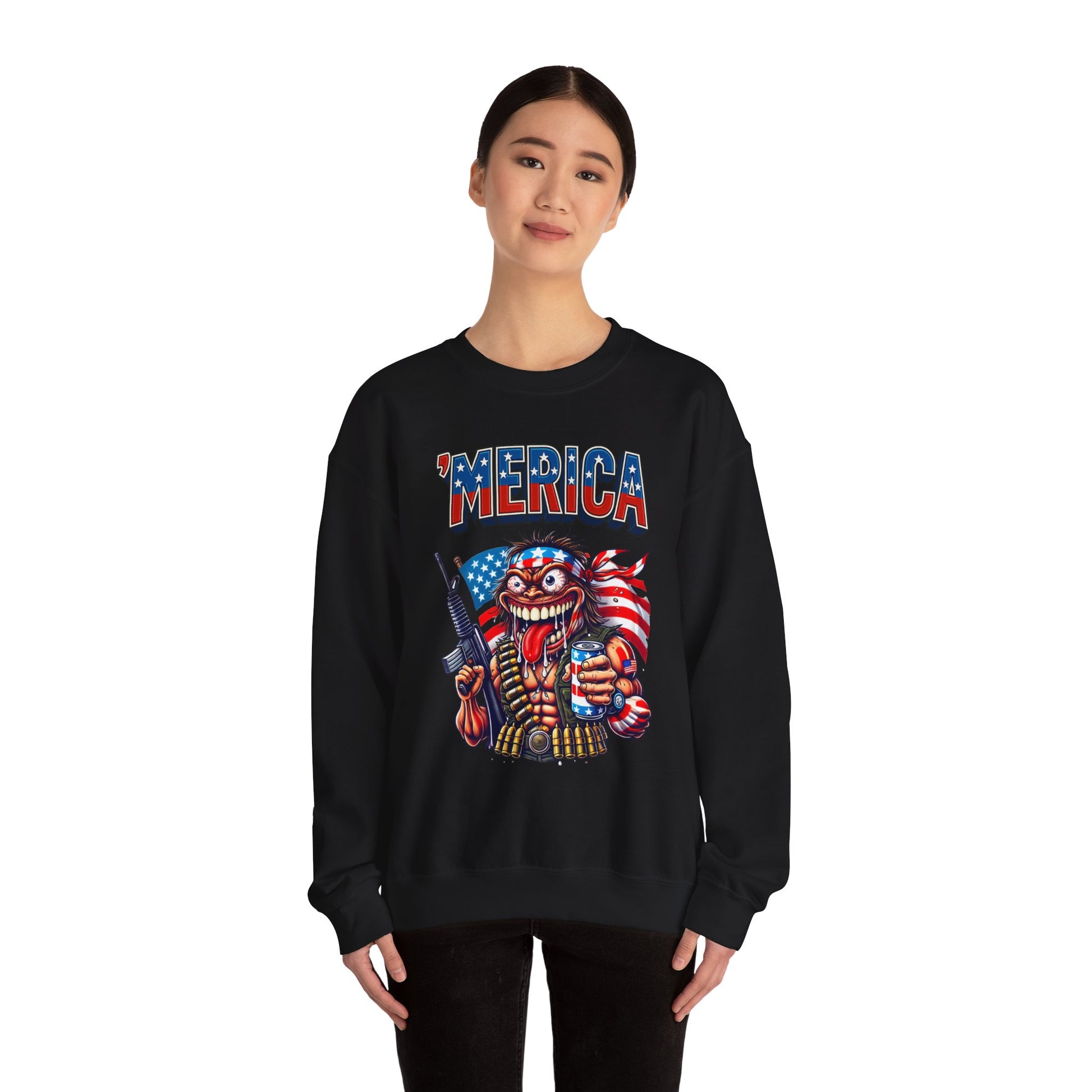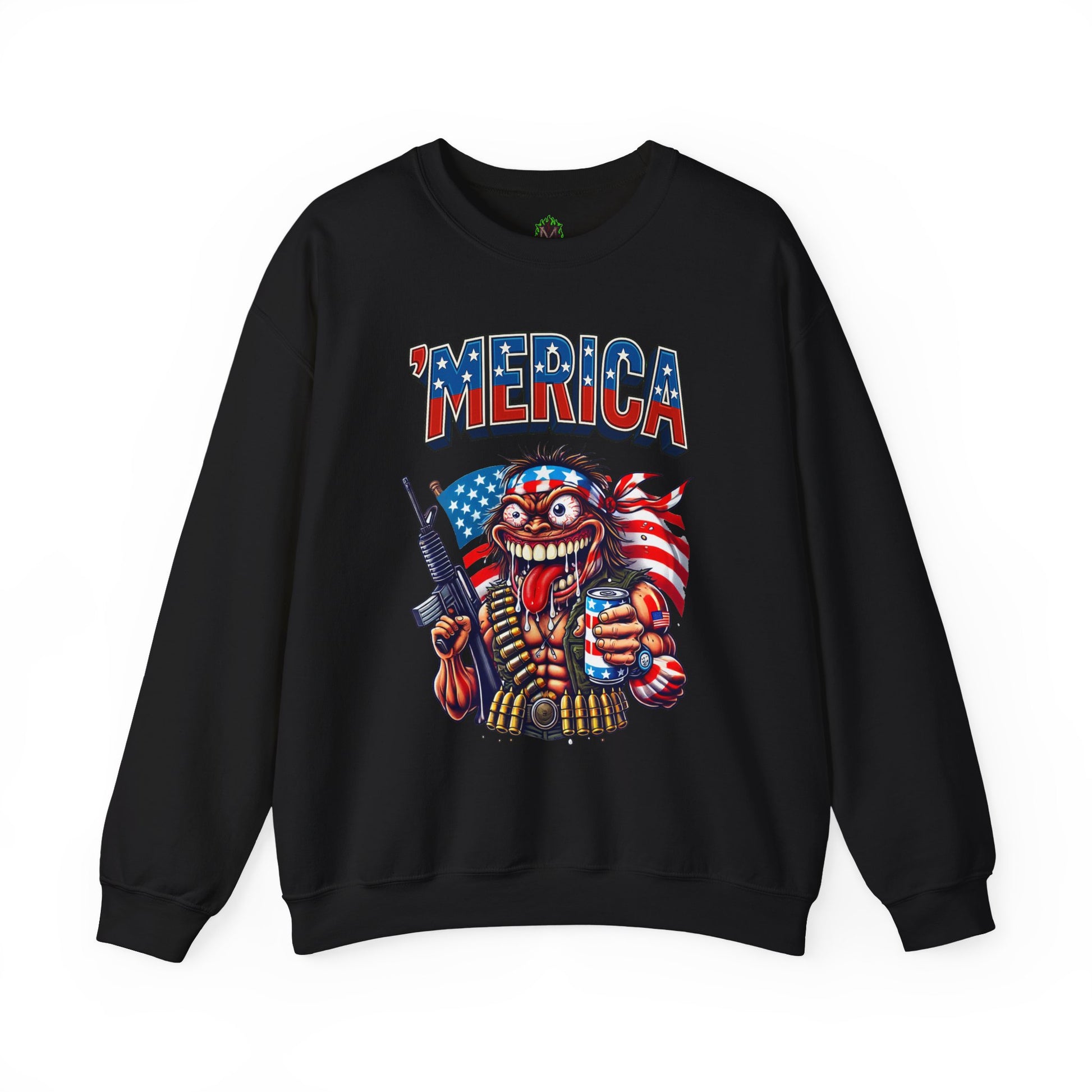 Loud, proud, and unapologetically over the top—this crewneck brings pure patriotic chaos. Featuring a wild, grinning character with a rifle, ammo belt, beer can, and waving American flag backdrop, all under the bold title “’Merica.” Perfect for anyone who celebrates freedom with a wink and a laugh.