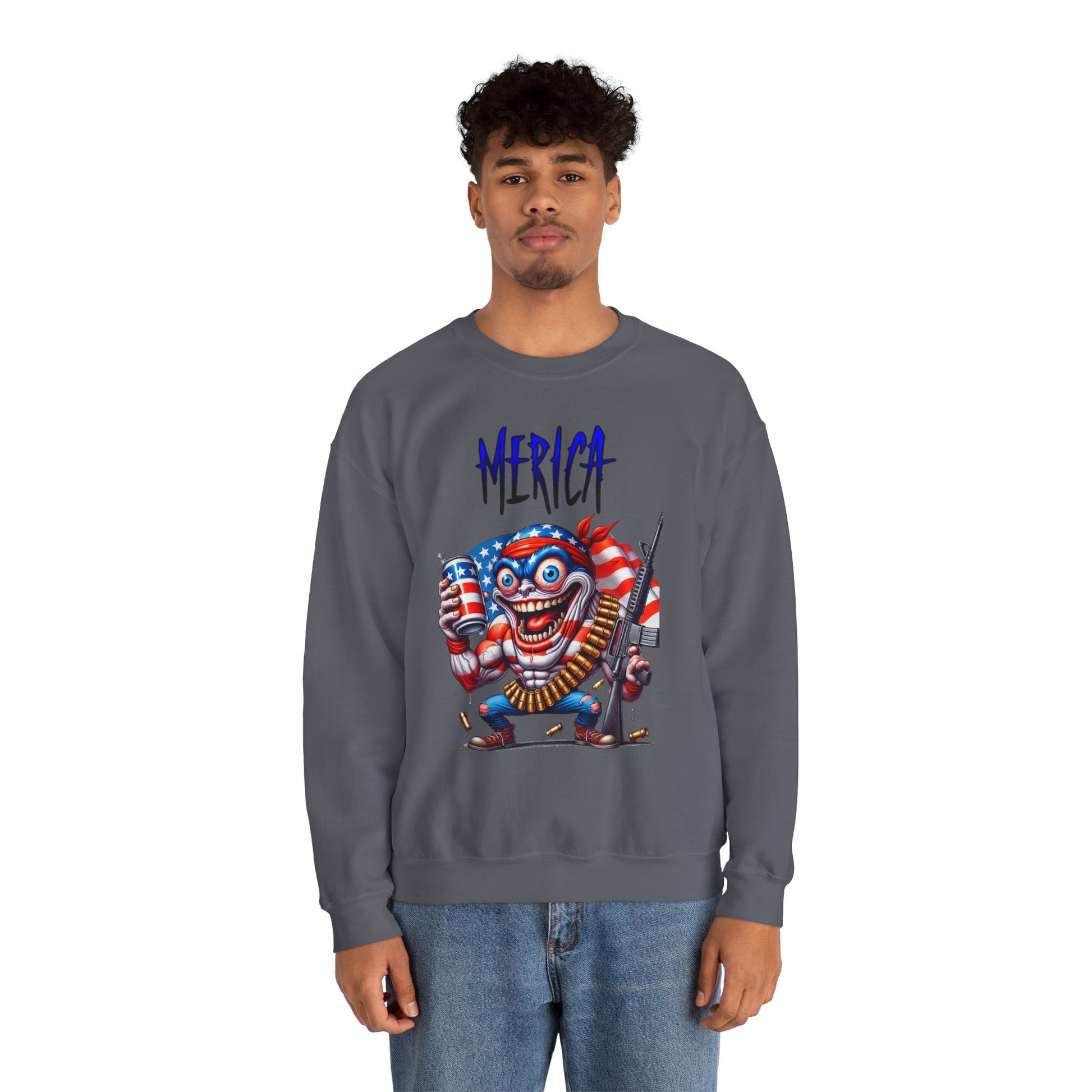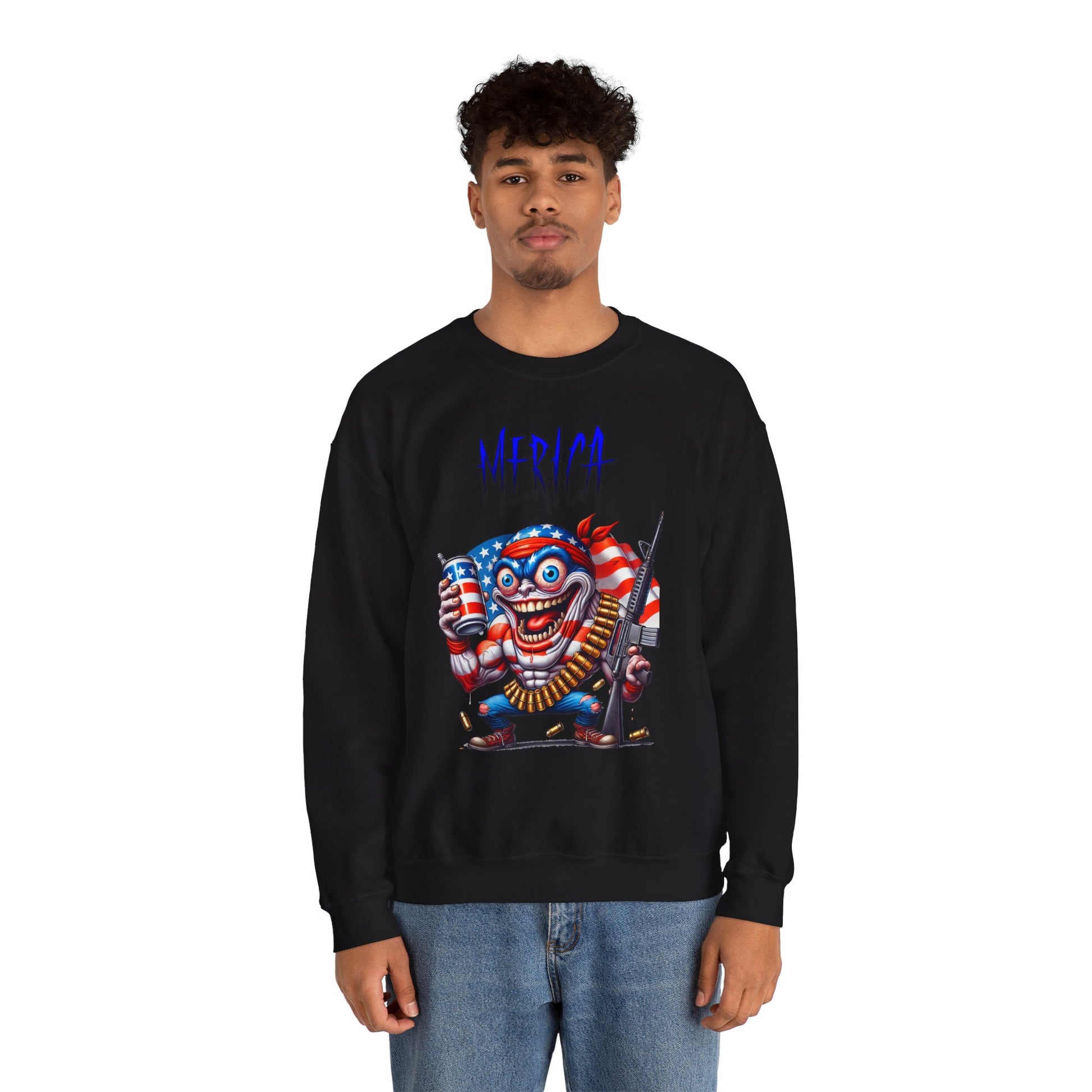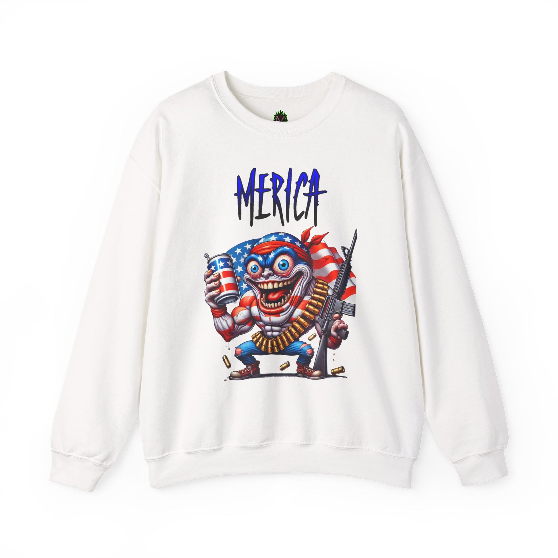 The ultimate expression of over-the-top American pride. This wild-eyed, muscle-bound character is draped in the Stars and Stripes, clutching a beer and a rifle, with ammo slung across his chest. Bullets fly, the flag waves, and “’Merica” is emblazoned above in bold, jagged letters. Perfect for anyone who celebrates freedom loud and proud.