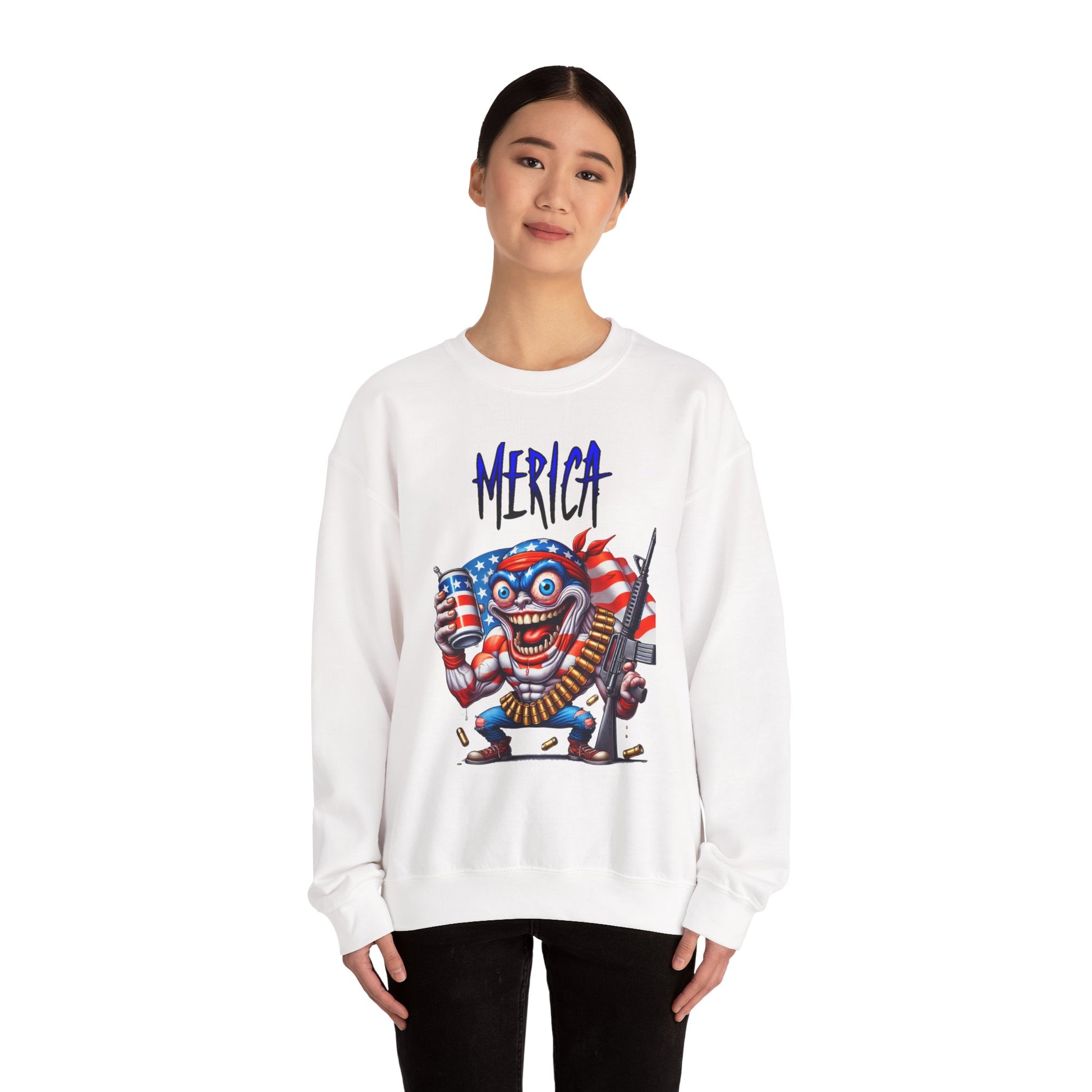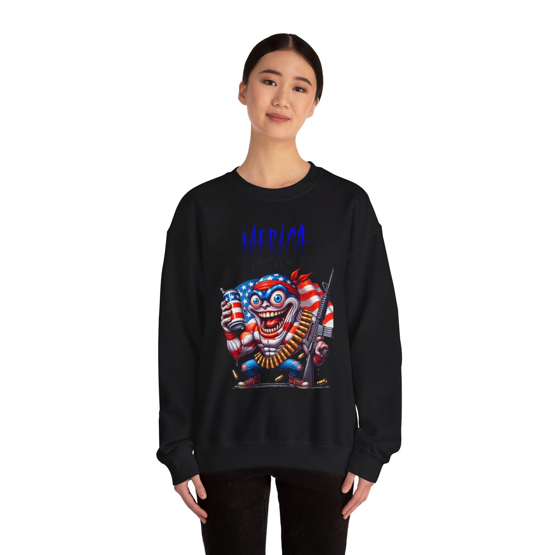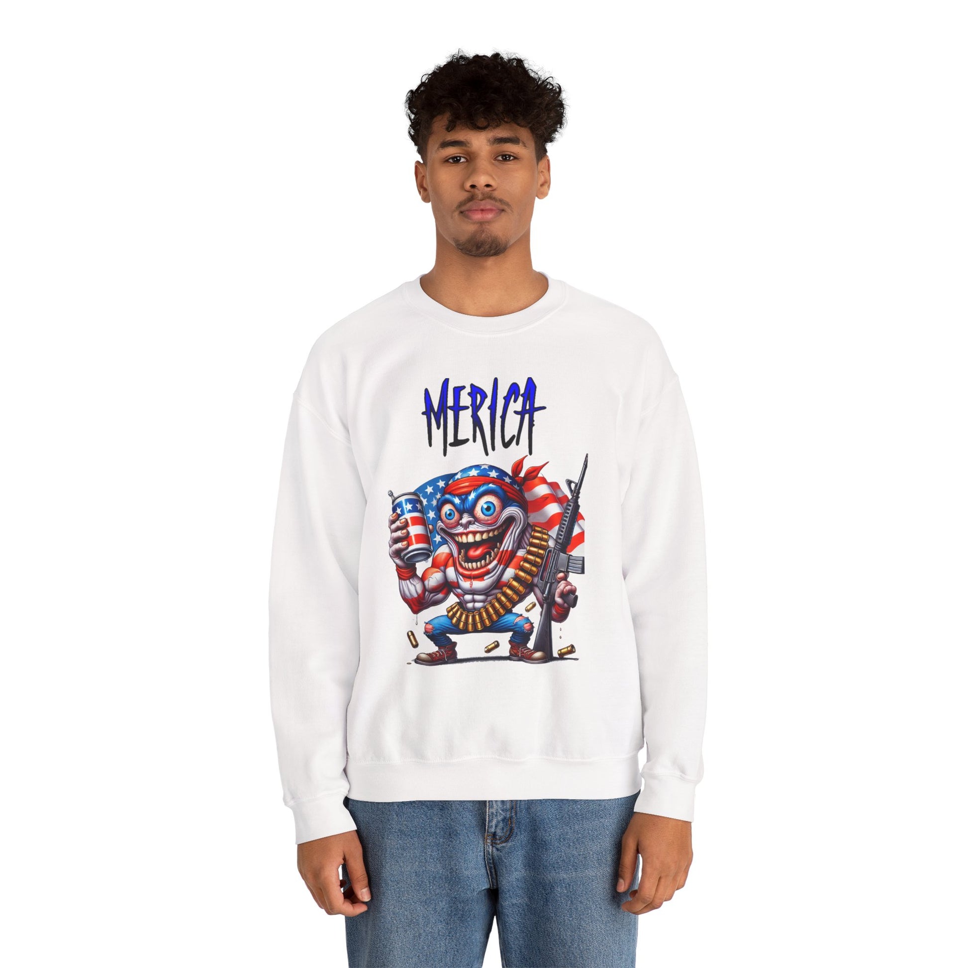 The ultimate expression of over-the-top American pride. This wild-eyed, muscle-bound character is draped in the Stars and Stripes, clutching a beer and a rifle, with ammo slung across his chest. Bullets fly, the flag waves, and “’Merica” is emblazoned above in bold, jagged letters. Perfect for anyone who celebrates freedom loud and proud.