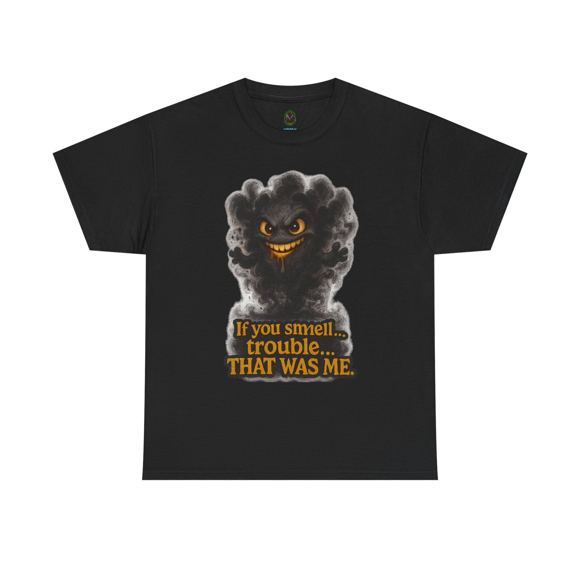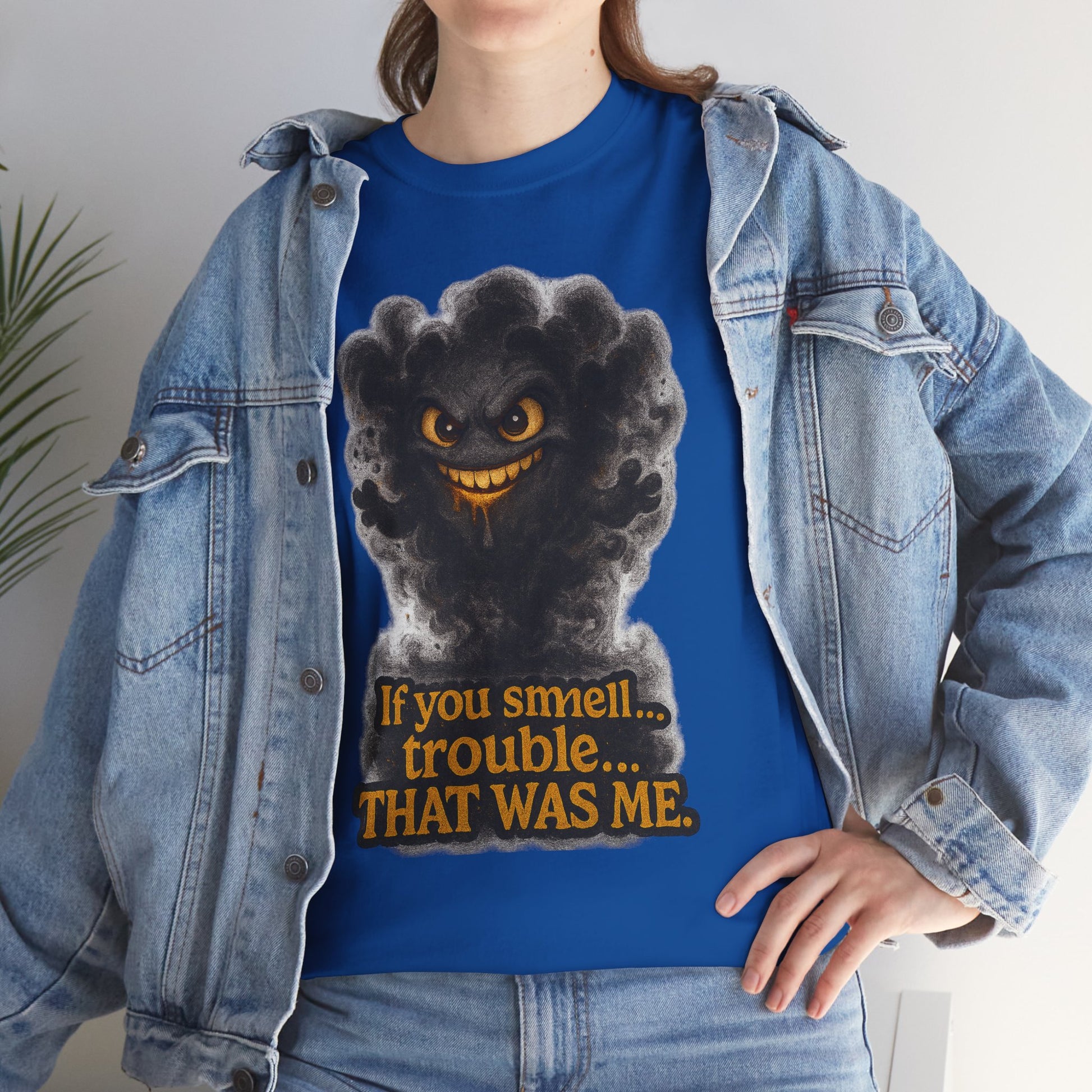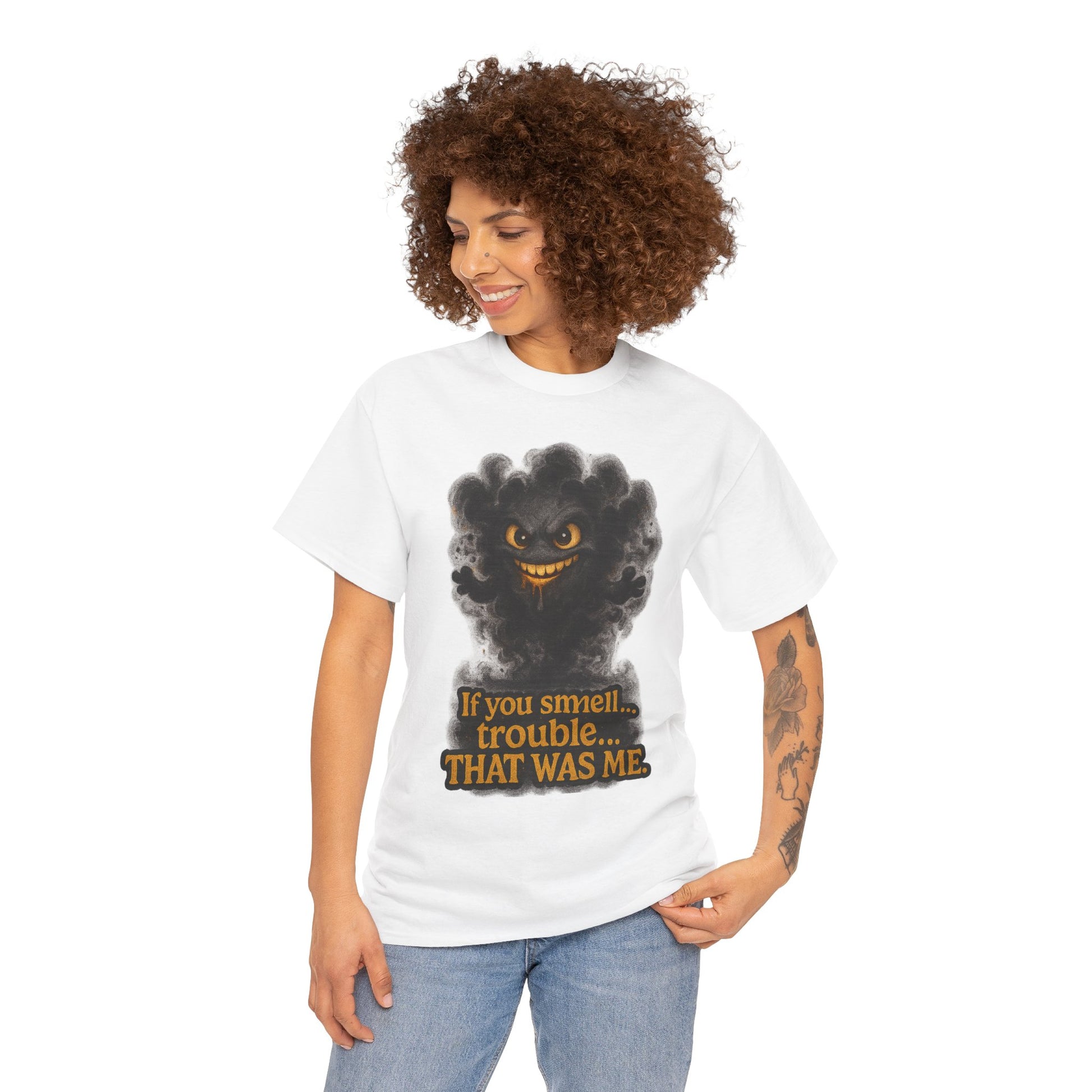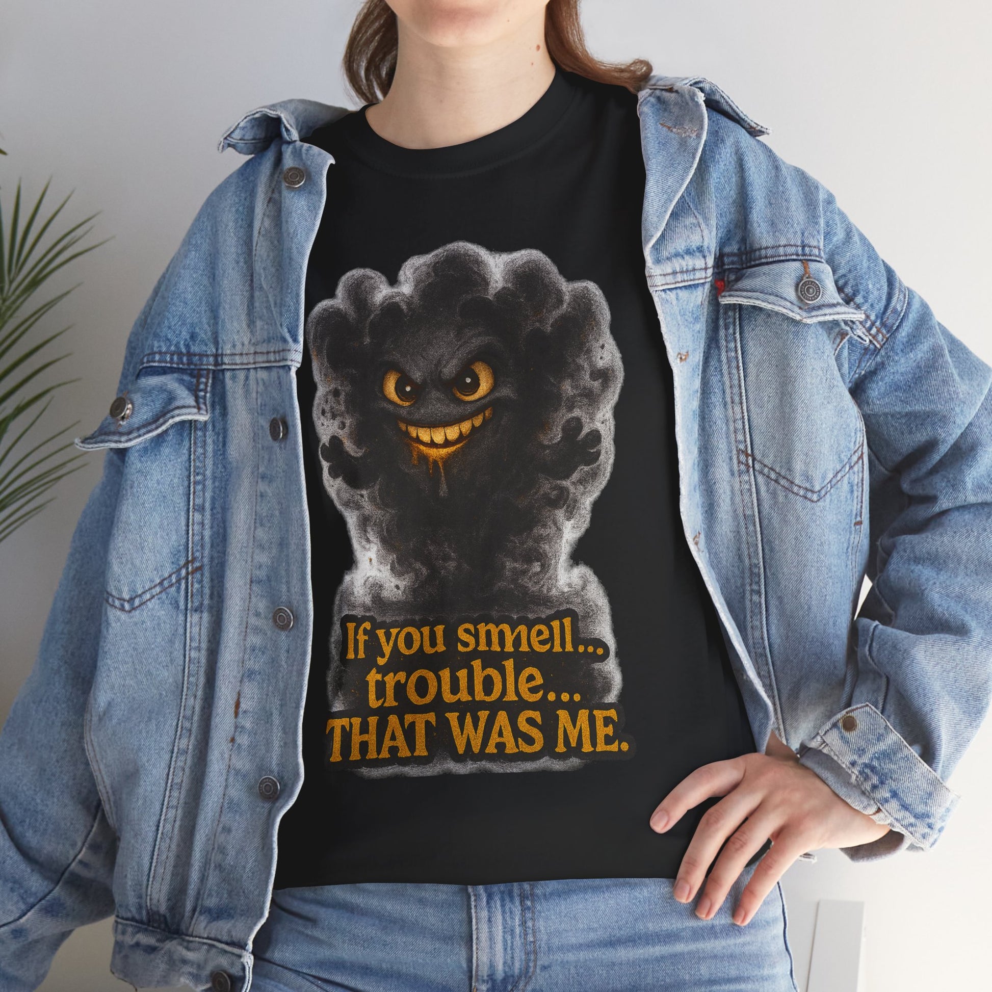 This soft, durable cotton tee brings a wink of mischief to everyday wear. A playful, smoky character rises from the chest with a sly grin and the tongue-in-cheek line—If you smell... trouble. THAT WAS ME.—rendered in warm, vintage-inspired tones. The medium-weight fabric and classic crew cut lay flat and relaxed, so the design sits cleanly and reads well whether layered under a jacket or worn solo. It feels like the shirt you grab when you want to be a little cheeky — lighthearted, bold, and just a bit rebellious.