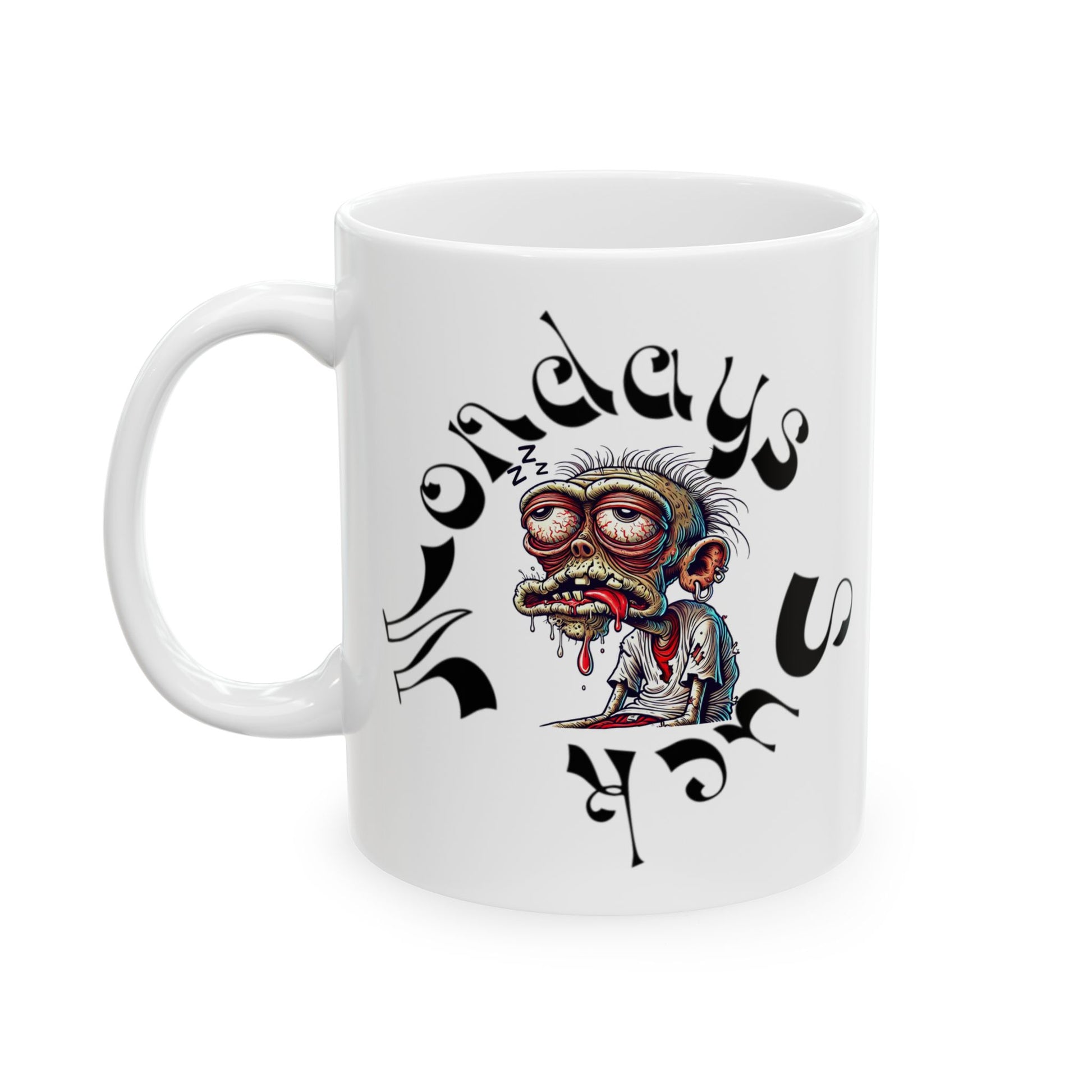 Meet your new Monday morning companion: the mug that perfectly captures that brutal beginning-of-the-week energy. Featuring a half-dead, drooling zombie of a man slumped in exhaustion, surrounded by warped gothic lettering that spells out the universal truth: Mondays F**k Us All.