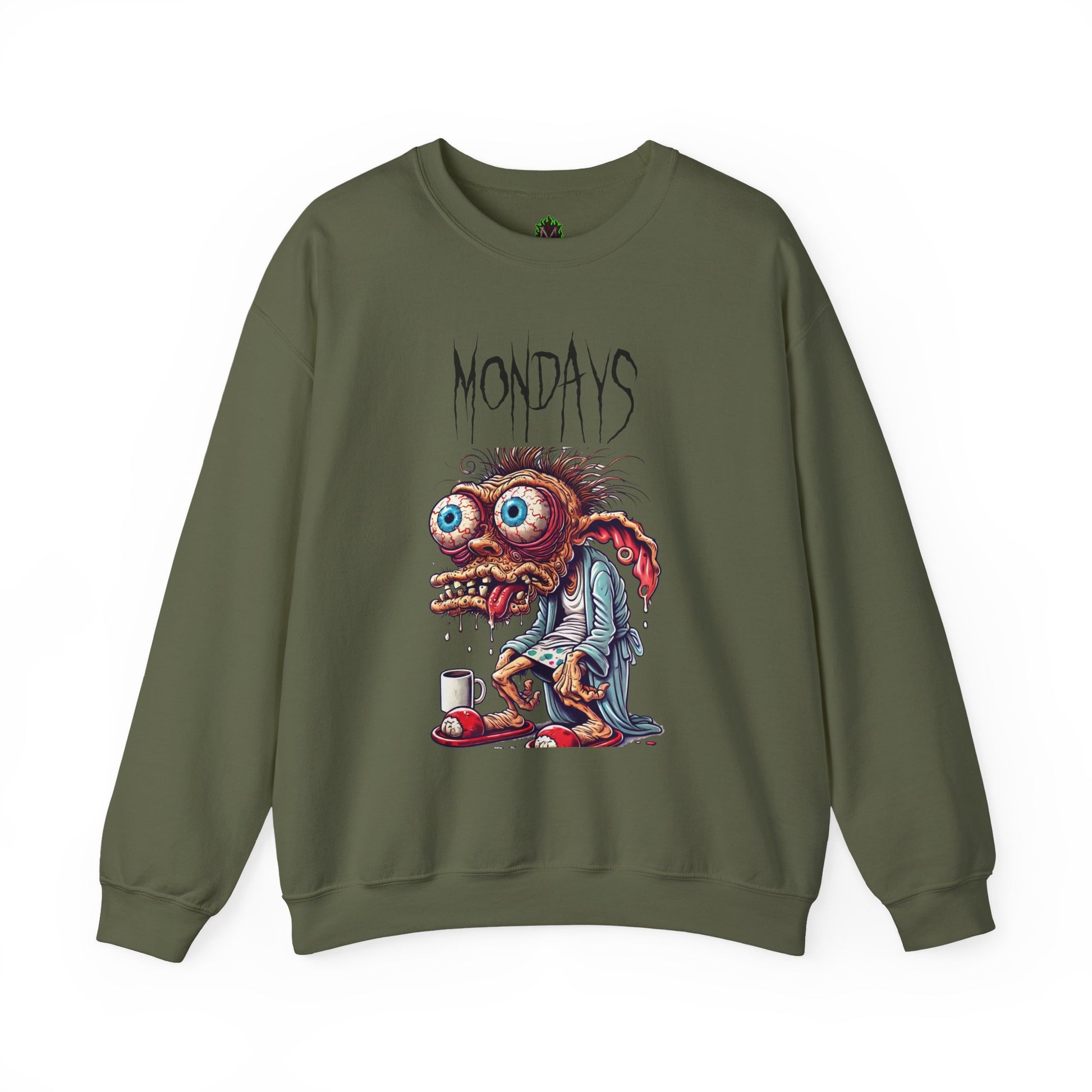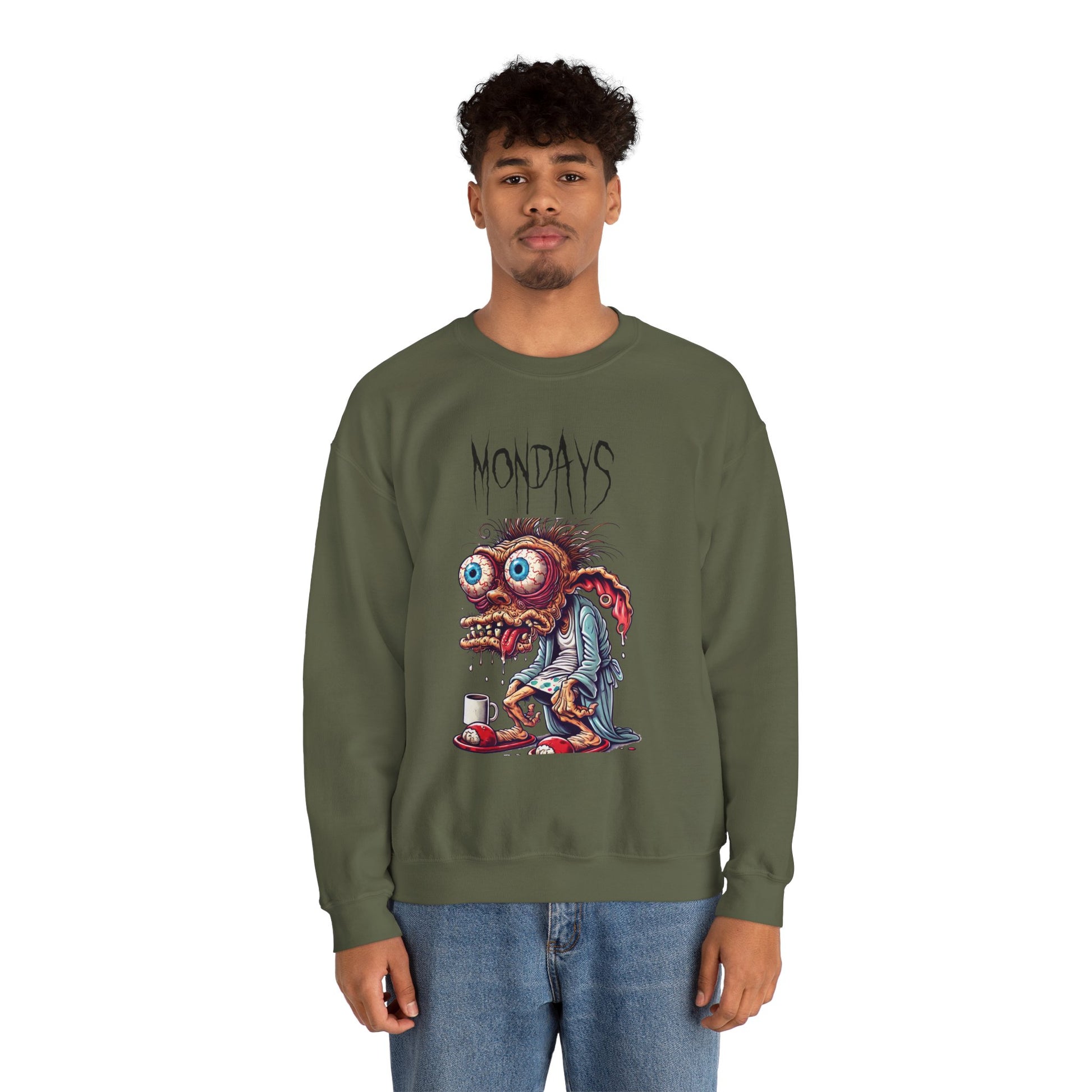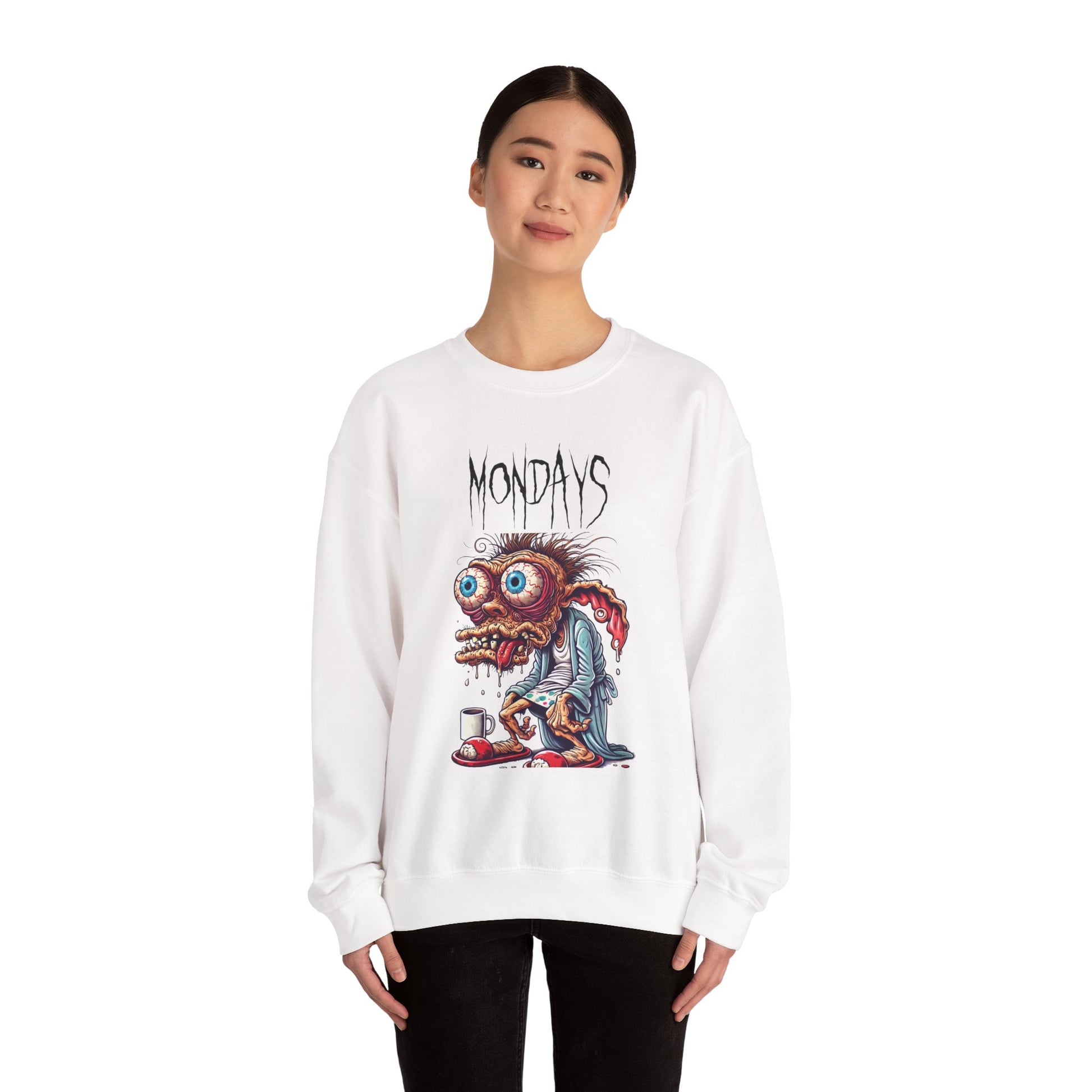 Start your week looking exactly how you feel—half-dead and in desperate need of caffeine. This crewneck features a wild-eyed, zombie-like creature clutching a coffee mug under the jagged text “Mondays.” Perfect for workweek warriors and anyone who needs humor to survive the start of the week.