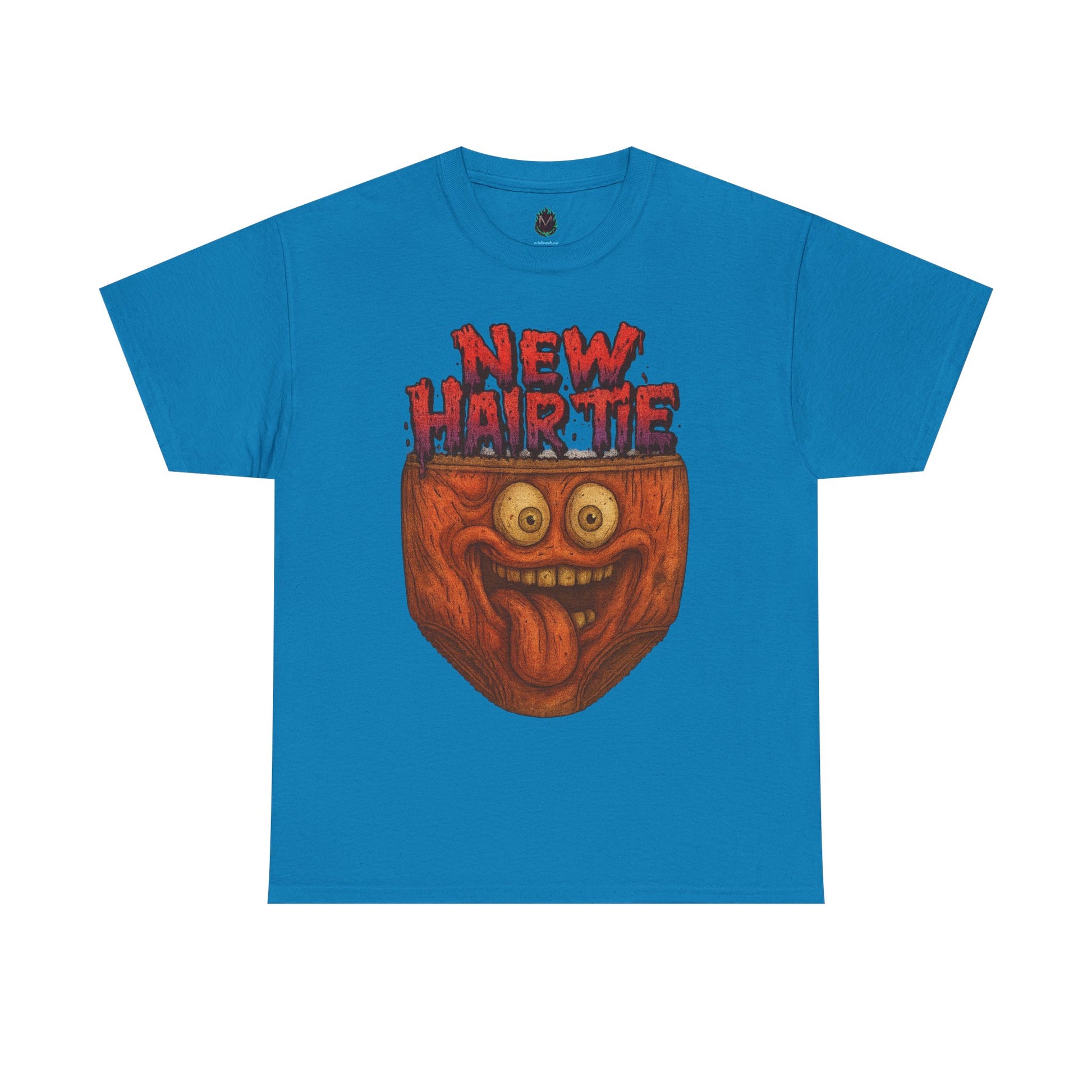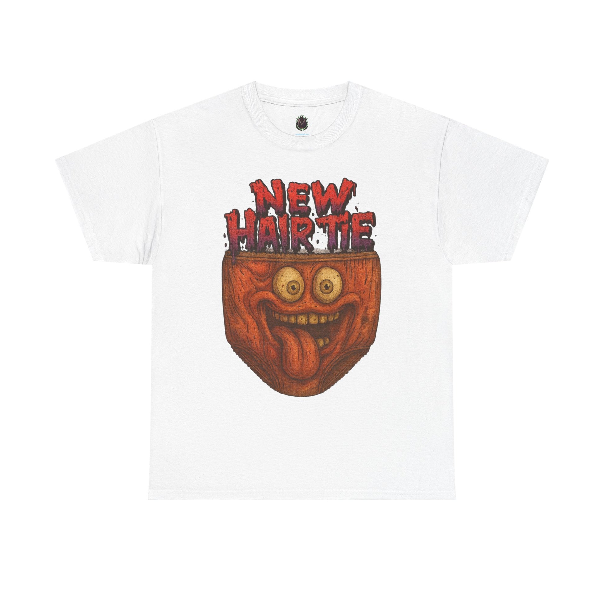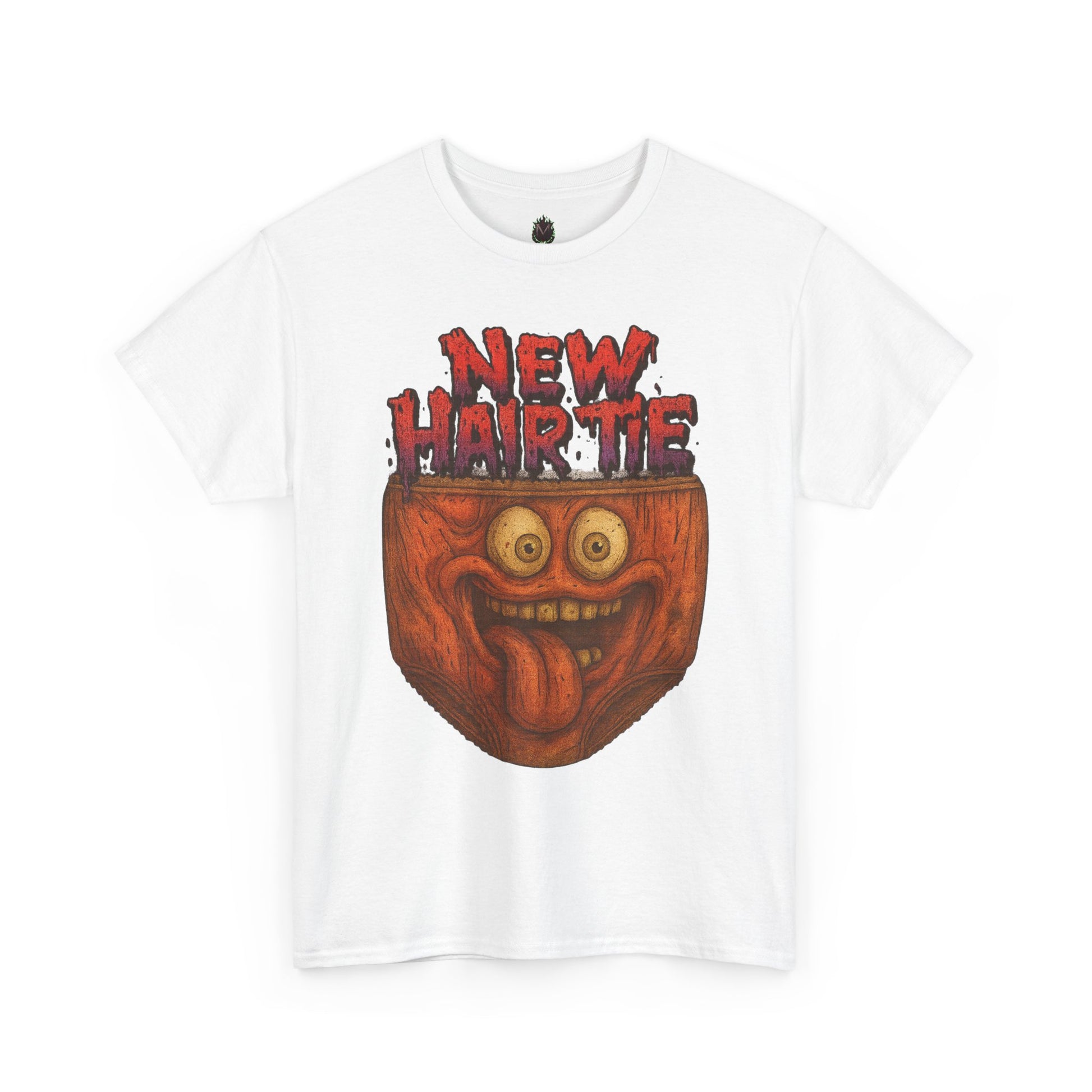 This wildly funny tee features a grinning, bug-eyed face popping out of a pair of underwear with the phrase “New Hair Tie” in blood-red letters. It’s chaotic, creepy, and guaranteed to turn heads.