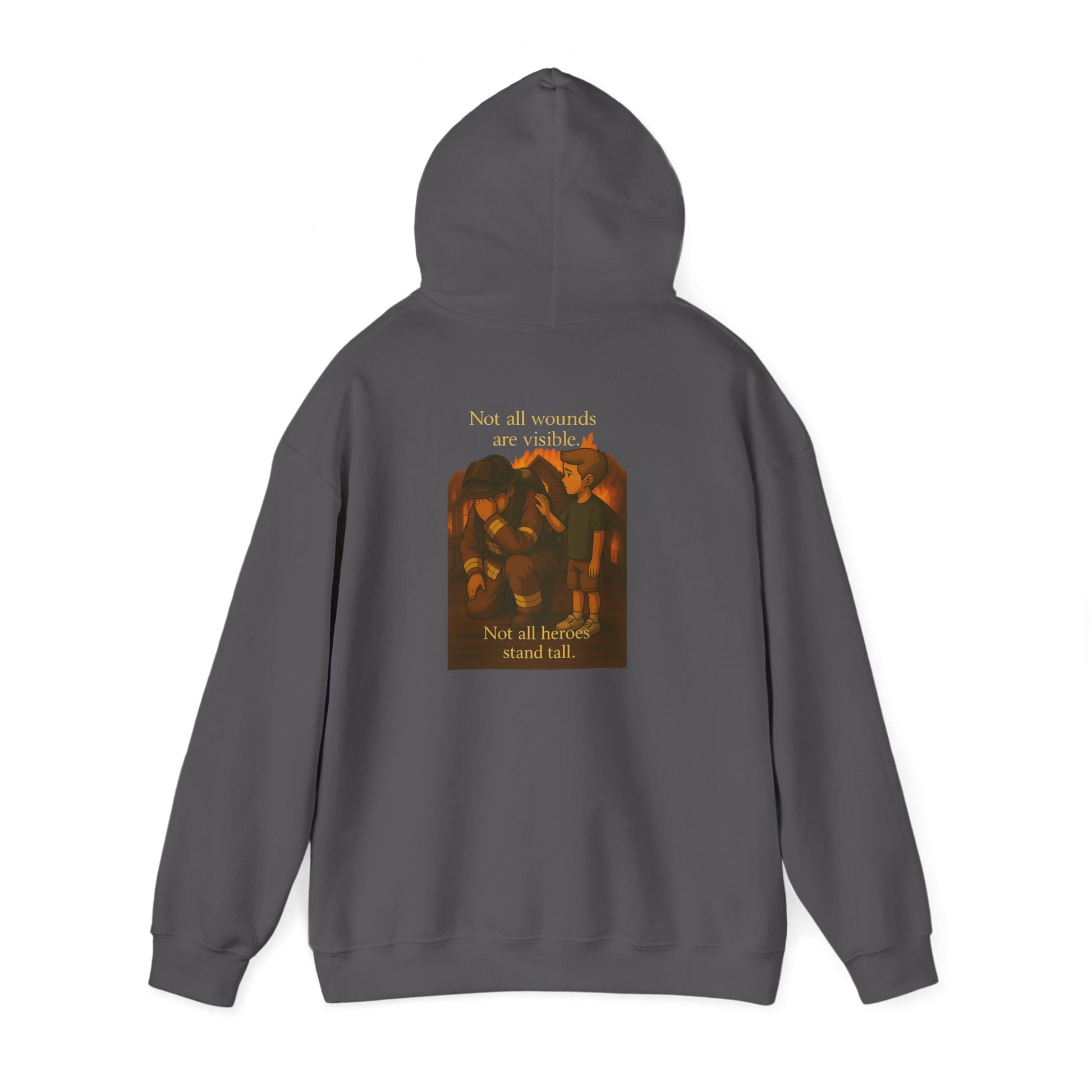 This design honors the quiet battles of our heroes. Featuring a firefighter in pain and a child offering comfort, it’s a powerful message of strength, empathy, and unseen scars.