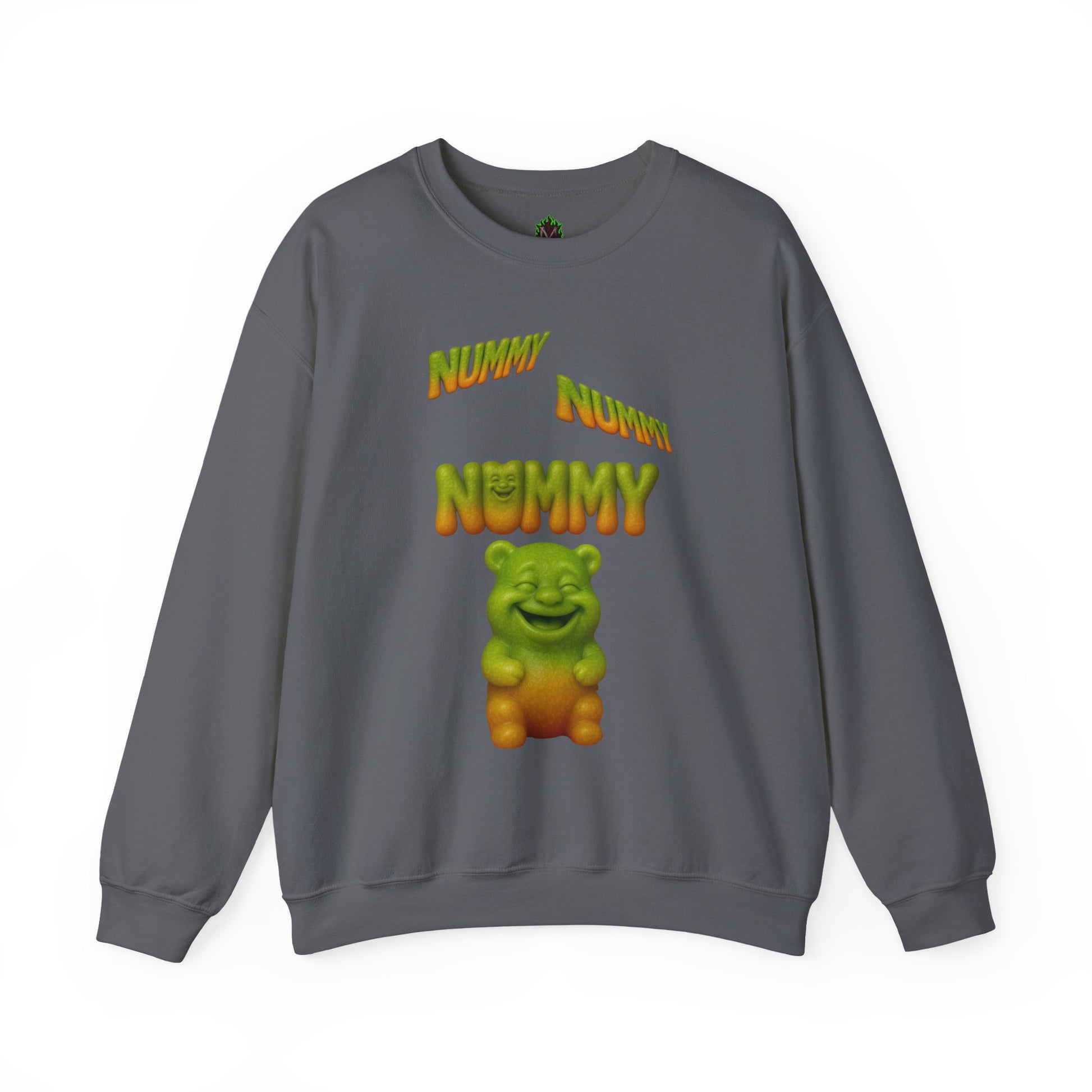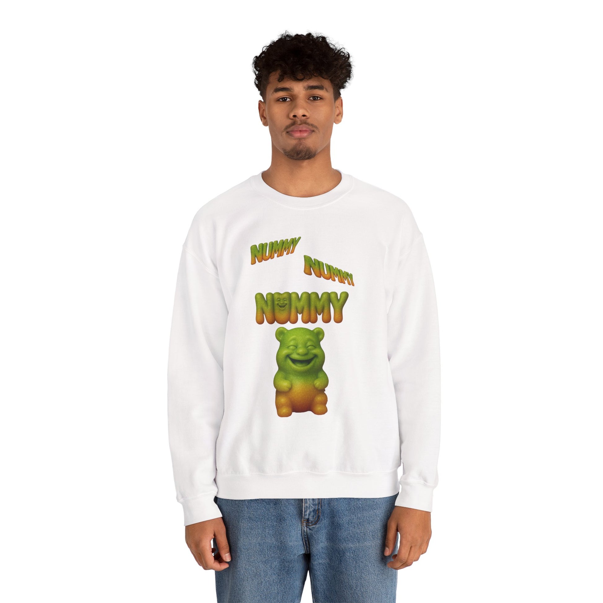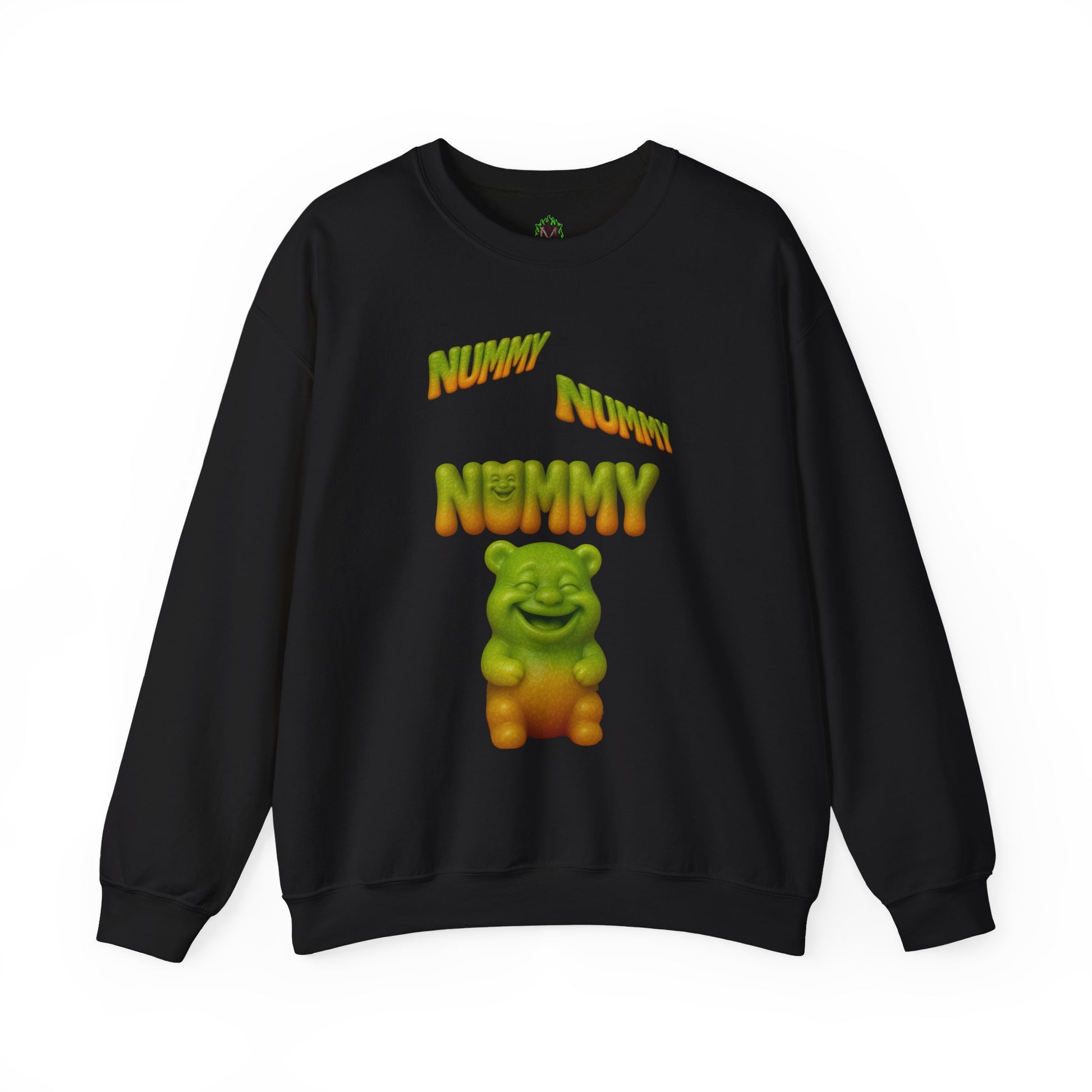 Sweet, silly, and guaranteed to get a smile—this crewneck features a chubby green-and-gold gummy bear under the playful words “Nummy Nummy Nummy.” Perfect for candy lovers, humor fans, and anyone who likes their style with a sugar-coated twist.