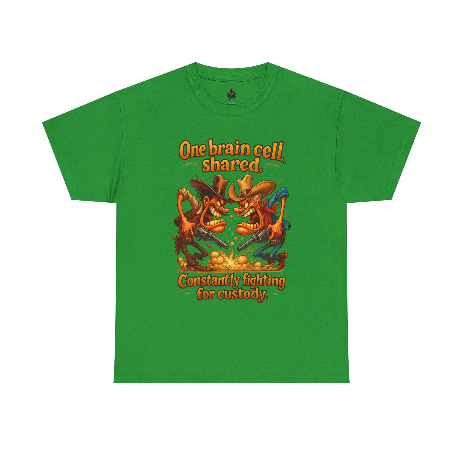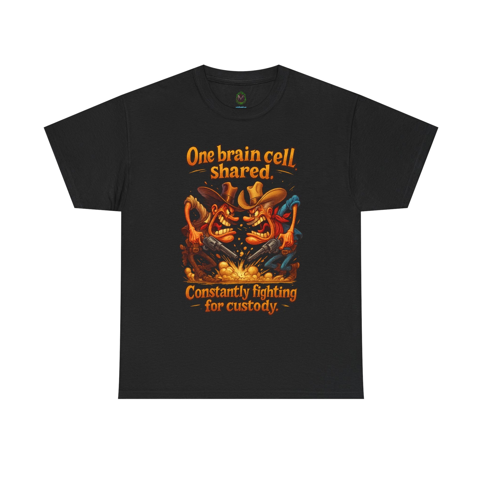 This soft, classic-fit tee wears like a trusted companion for days when sarcasm and shared chaos are your mood. The front art — a playful, slightly surreal scene of two creatures battling over a single brain cell — carries a dry, witty voice: “One brain cell shared. Consistently building the chemistry.” It sits bold on a clean white backdrop, letting the warm, vintage-inspired tones of the illustration pop. Lightweight but sturdy cotton drapes comfortably, while thoughtful construction details (twill shoulder tape, ribbed collar, tear-away label) keep the shape intact and the neck comfortable. Wear it to low-key hangouts, late-night study sessions, or when you want to let your sense of humor do the talking.