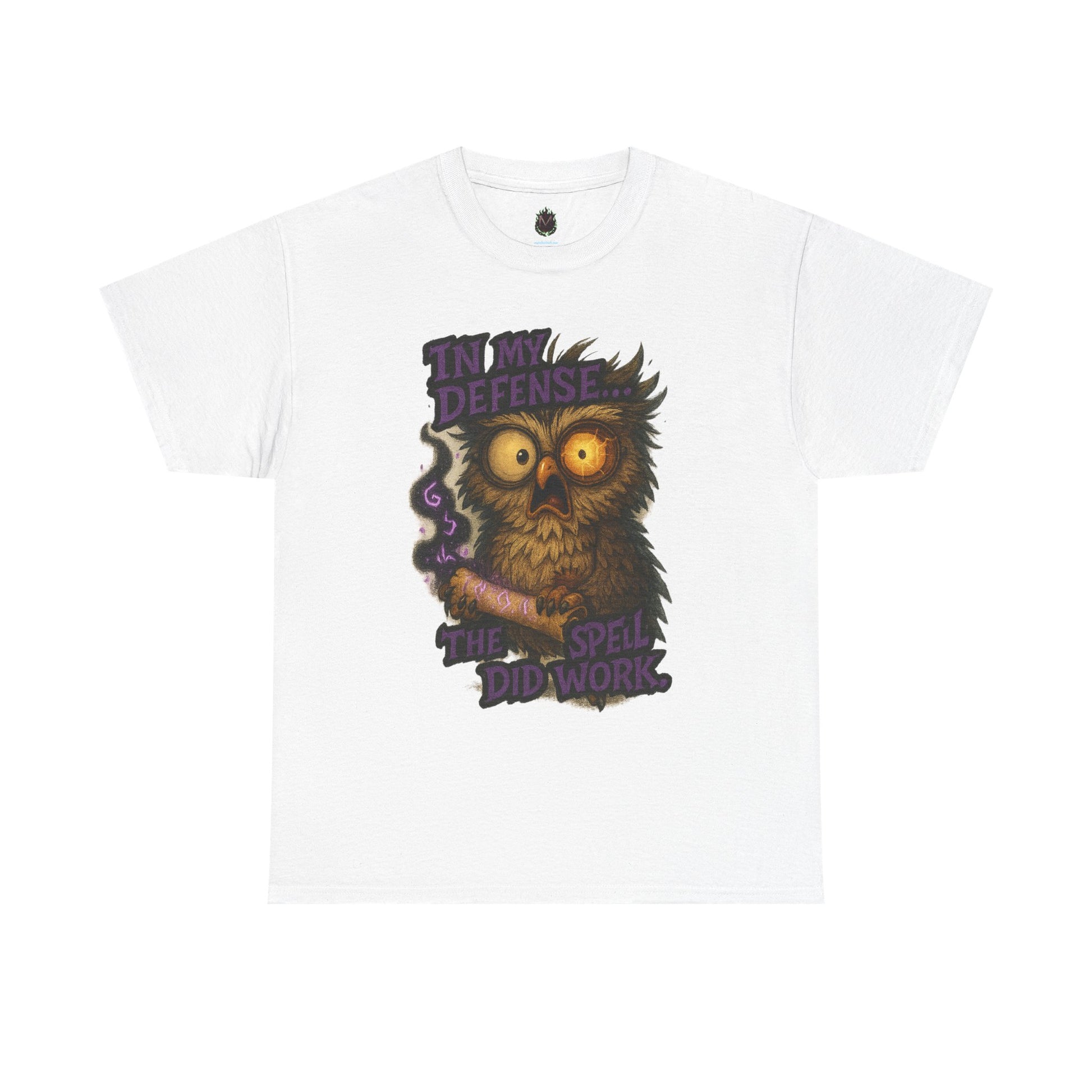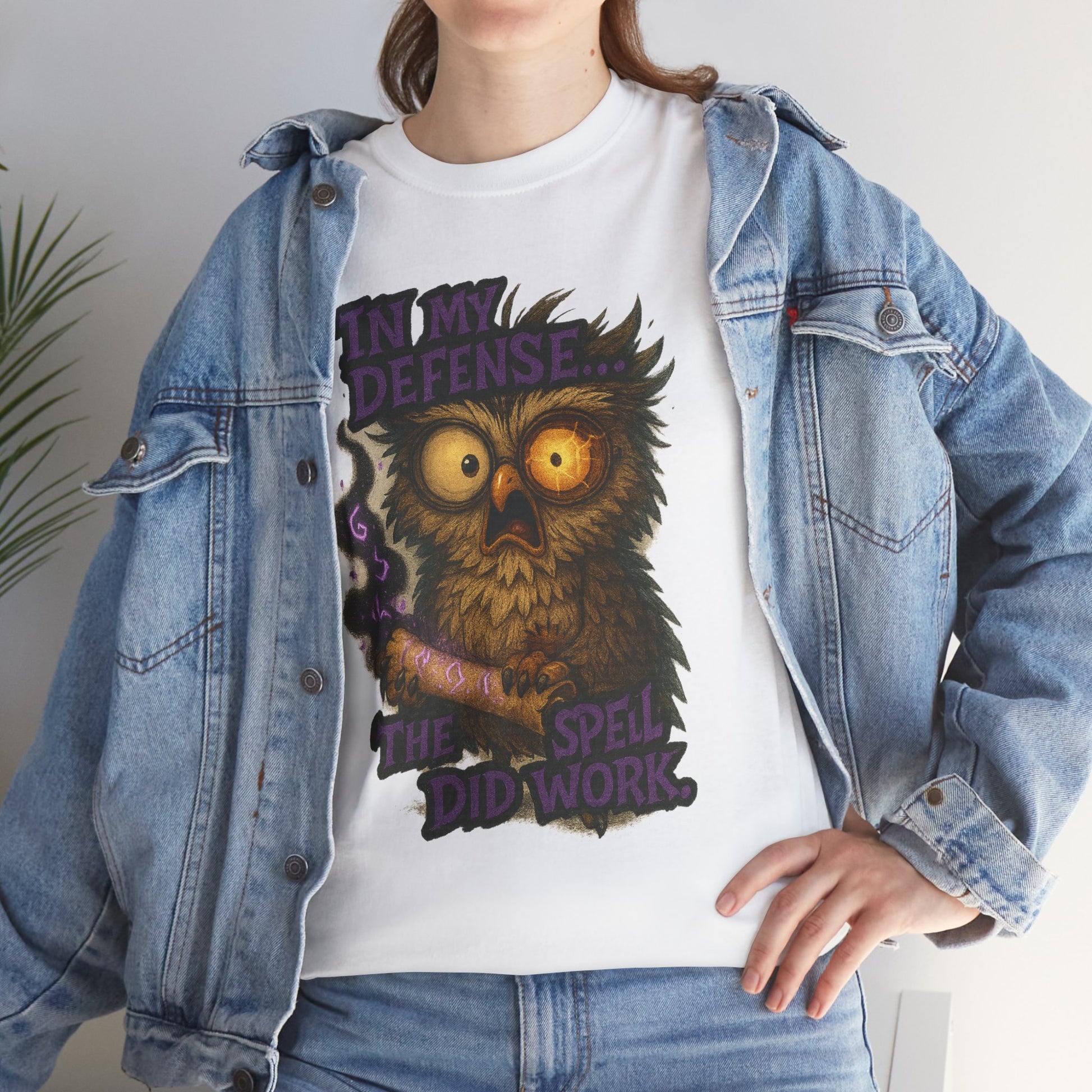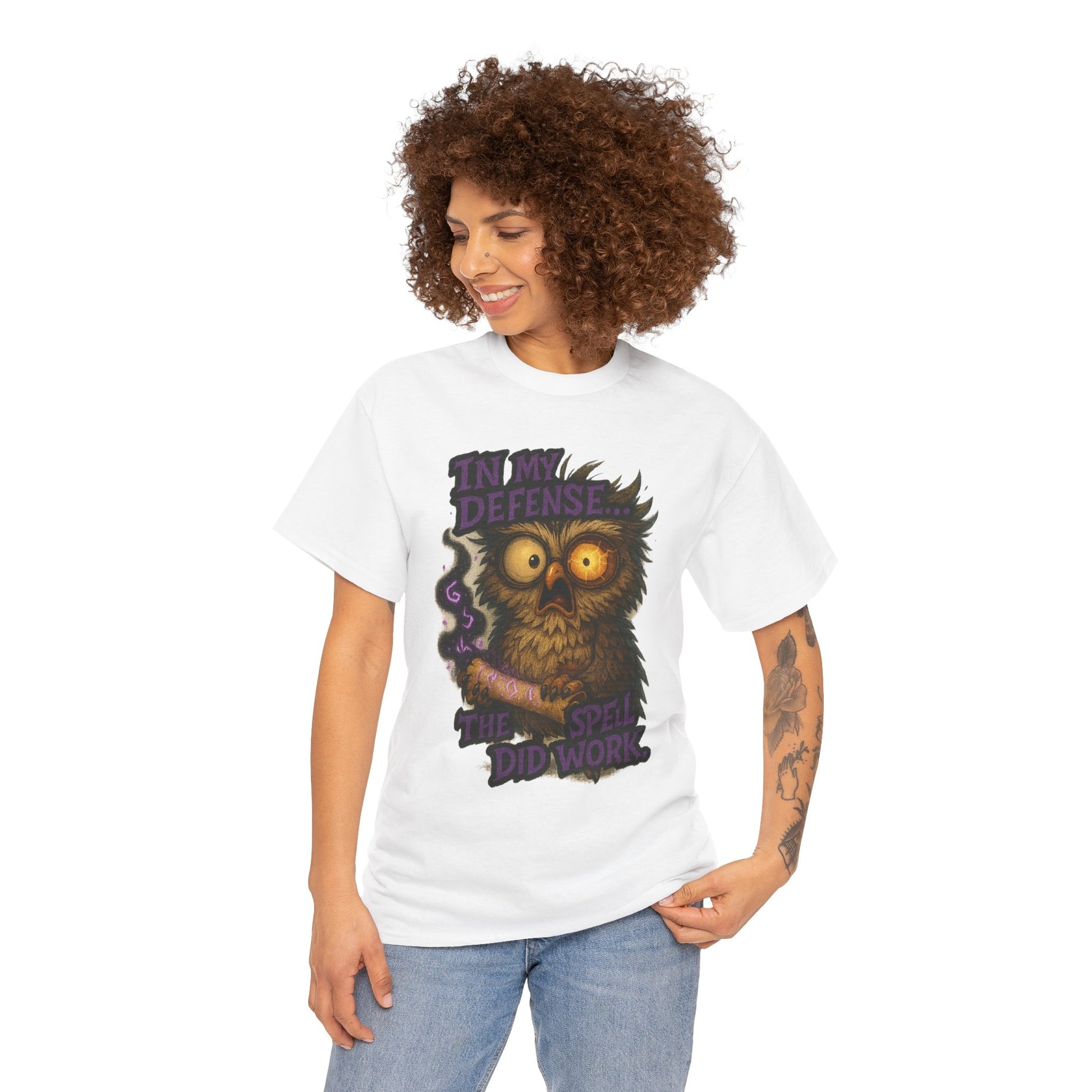 Soft, breathable cotton with a hand-drawn, slightly spooky owl illustration—this tee carries a quirky, late-night charm. The design shows a wide-eyed owl clutching a wand with the phrase “In my defense the spell did work,” blending humor and a touch of witchy mischief. Wear it on chilly evenings at a coffee shop, to a low-key Halloween hangout, or when you want to lean into playful, cozy vibes. The relaxed crew-neck silhouette layers easily under jackets or over long sleeves, and the durable print keeps the artwork crisp wash after wash. It feels like slipping into a familiar joke shared among friends who appreciate whimsical, nerdy humor and a little nocturnal magic.