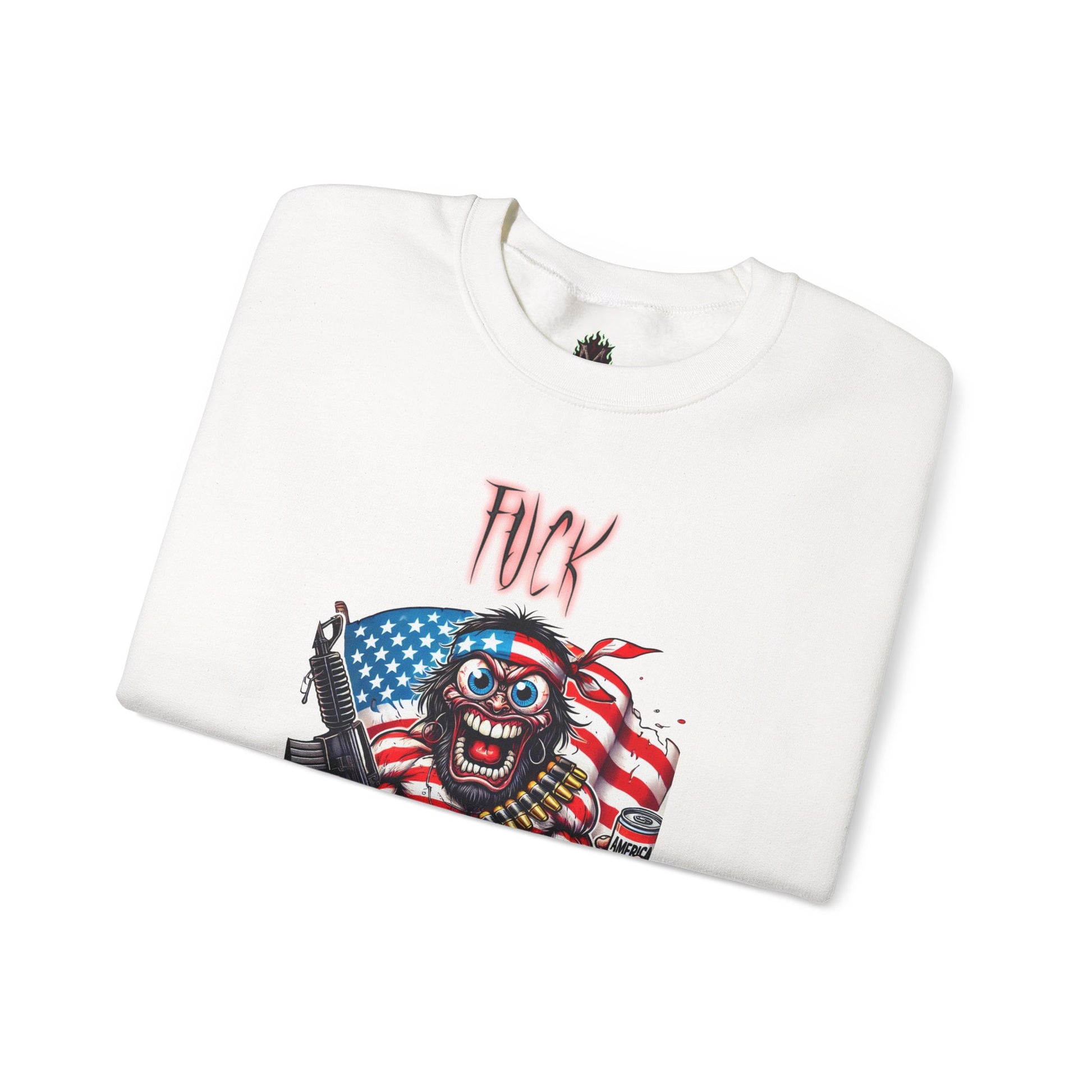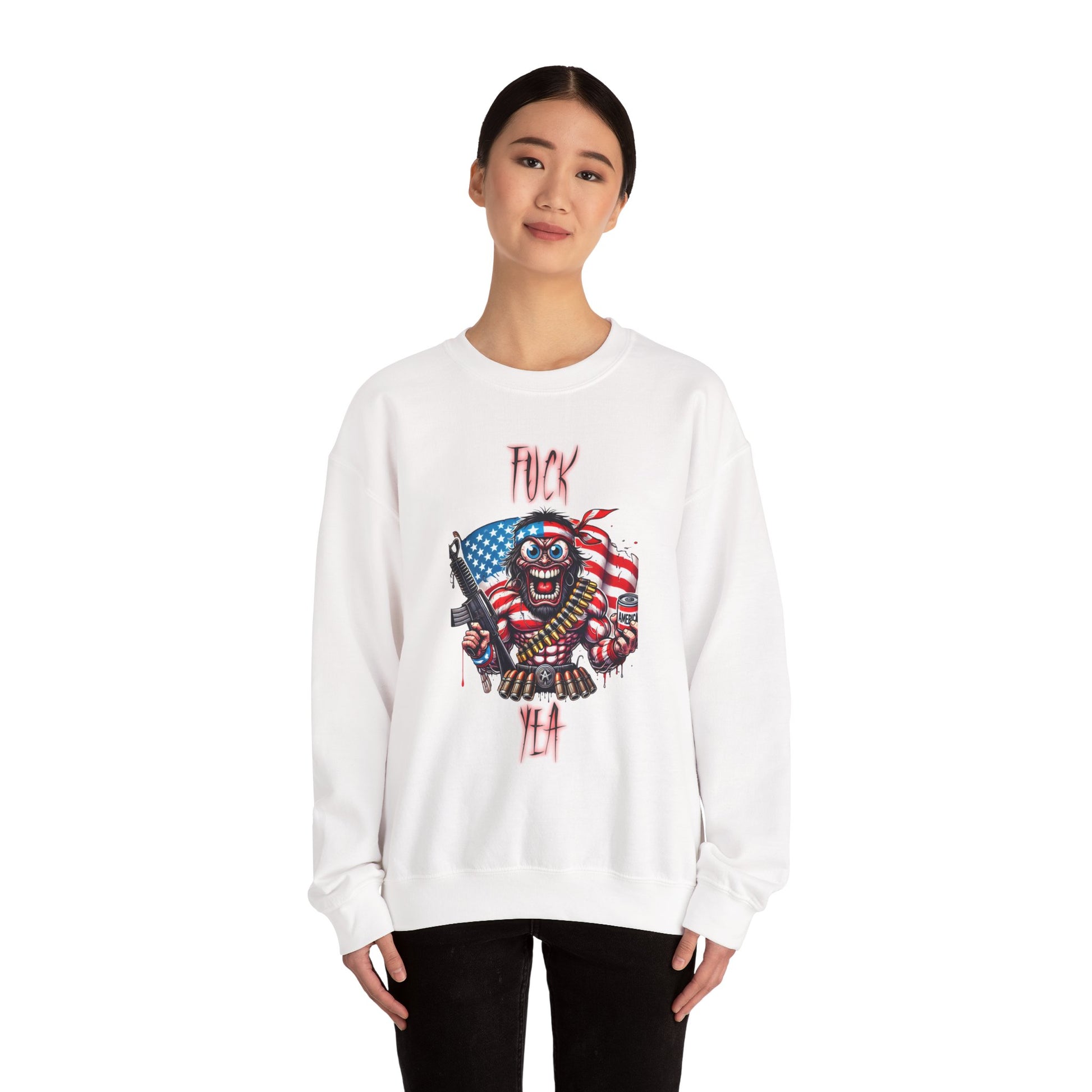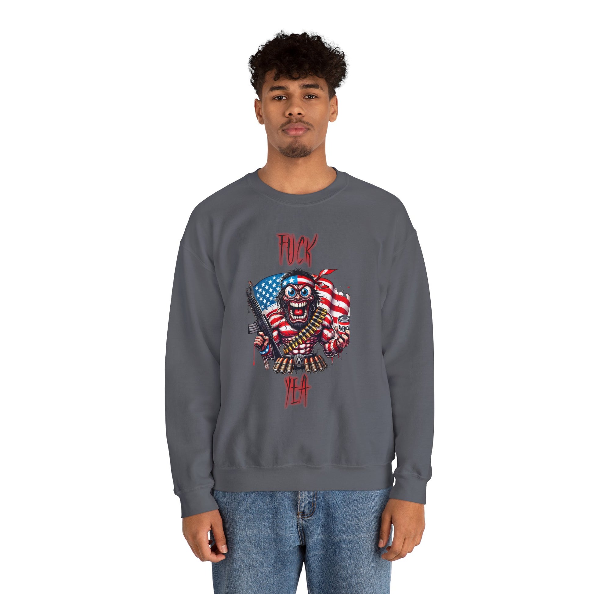 Loud, proud, and unapologetically American. This crewneck features a wild-eyed, grinning character wrapped in the Stars and Stripes, armed with an assault rifle and a belt of bullets, beer in hand, and “F*** Yea” boldly above and below. For those who believe patriotism should be as bold as their wardrobe.