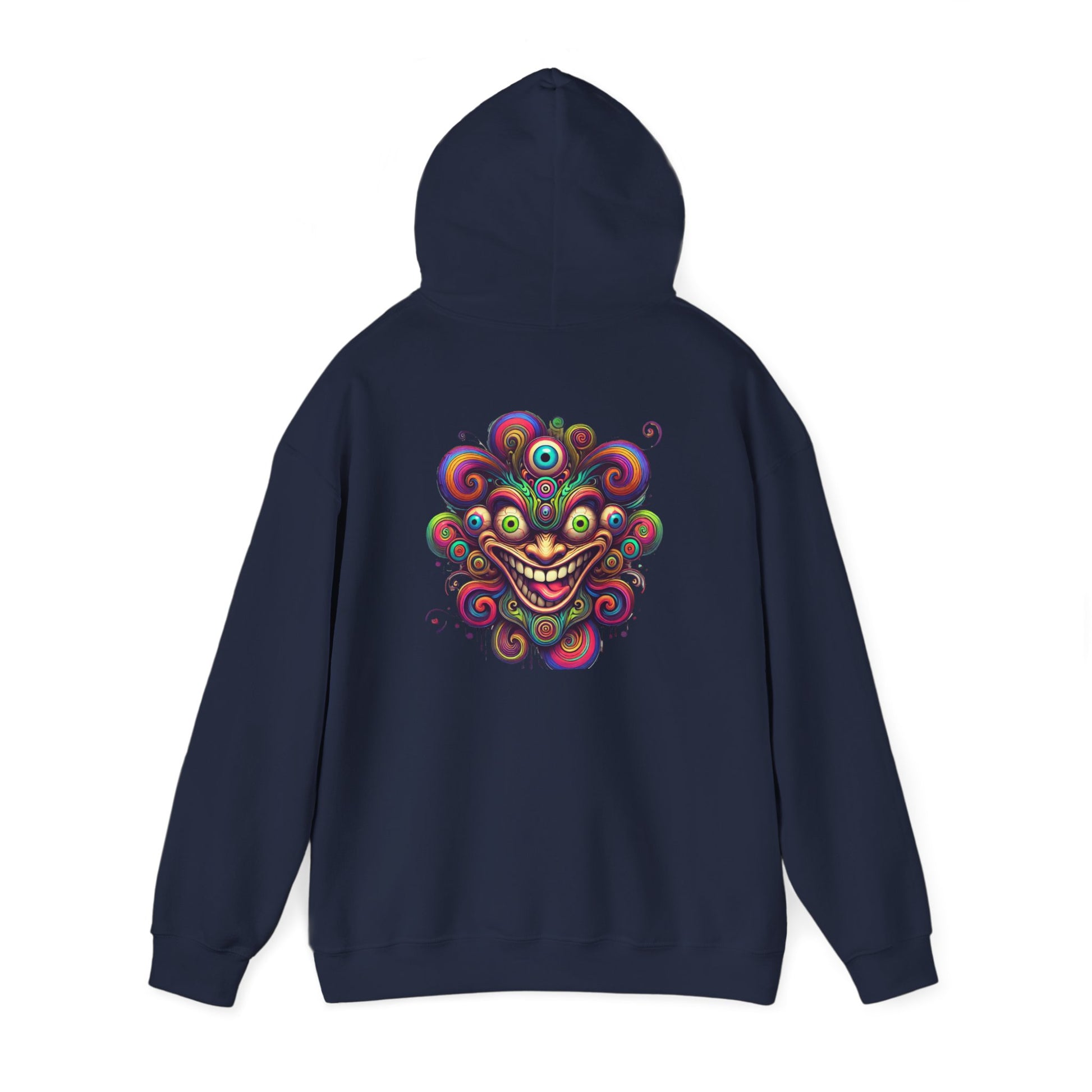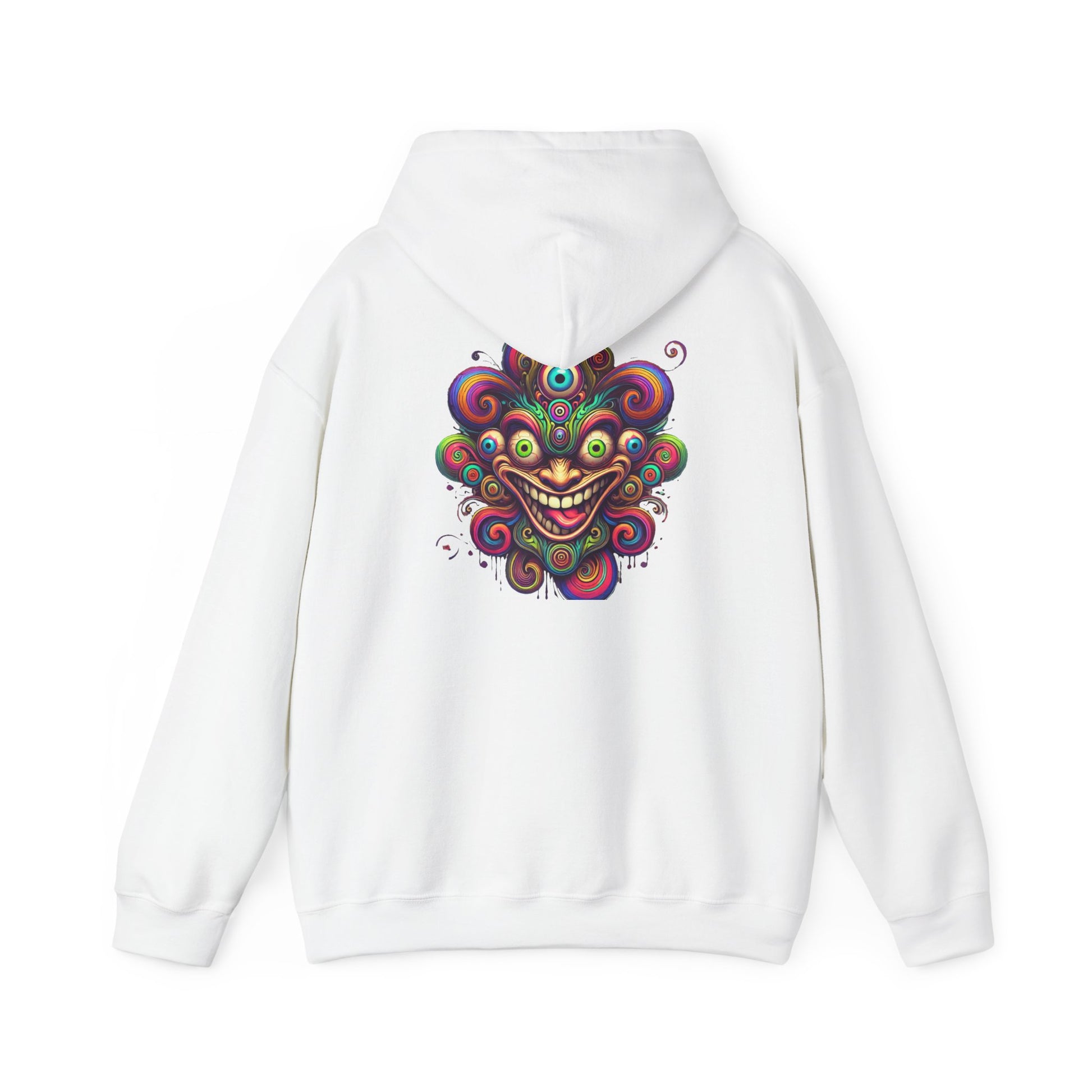 A soft, mid-weight hoodie built to carry bold art and long days. The smooth 50/50 cotton-poly blend feels warm without weight, and the tubular knit construction keeps the silhouette clean. The roomy kangaroo pocket and double-lined, color-matched hood make it a cozy companion for evening walks, art shows, or late-night studio sessions. This version features vibrant DTF artwork across the back — a swirling, surreal face that pops against the clean white ground — with DTF inner neck label and options for chest or wrist embroidery if you want to add a subtle signature. Durable stitching and OEKO-TEX certified dyes mean it wears well and ages with the same mischievous energy as the design.