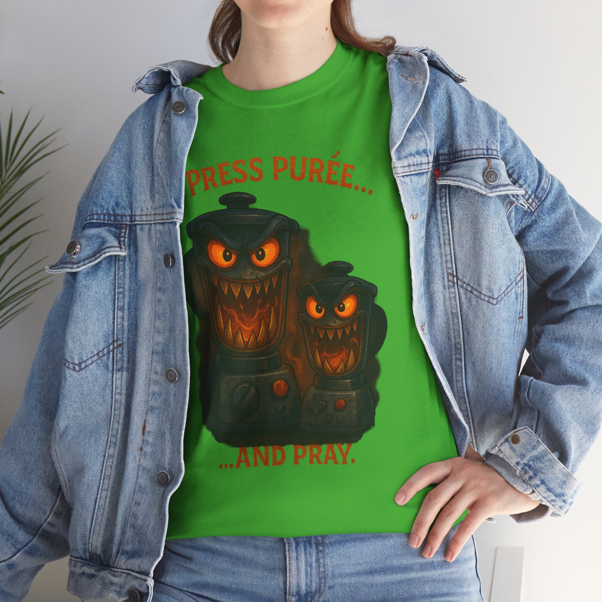 A soft, sturdy tee that wears like a cozy kitchen-side ritual. This classic crew-neck shirt features a spooky, vintage-style illustration of two sinister pumpkins—one large, one small—glowing with orange eyes and jagged mouths above the tongue-in-cheek caption: “Press purée...and pray.” The art sits front-and-center on a clean white canvas, printed with crisp, detailed techniques that keep the shadows deep and the highlights warm. Built from medium-weight, responsibly sourced cotton and knit without side seams, the shirt keeps its shape wash after wash while staying comfortable for long shifts at the stove, late-night carving sessions, or casual hangouts with fellow Halloween lovers. It’s breathable, ethically made, and finished with a tear-away label for itch-free wear.