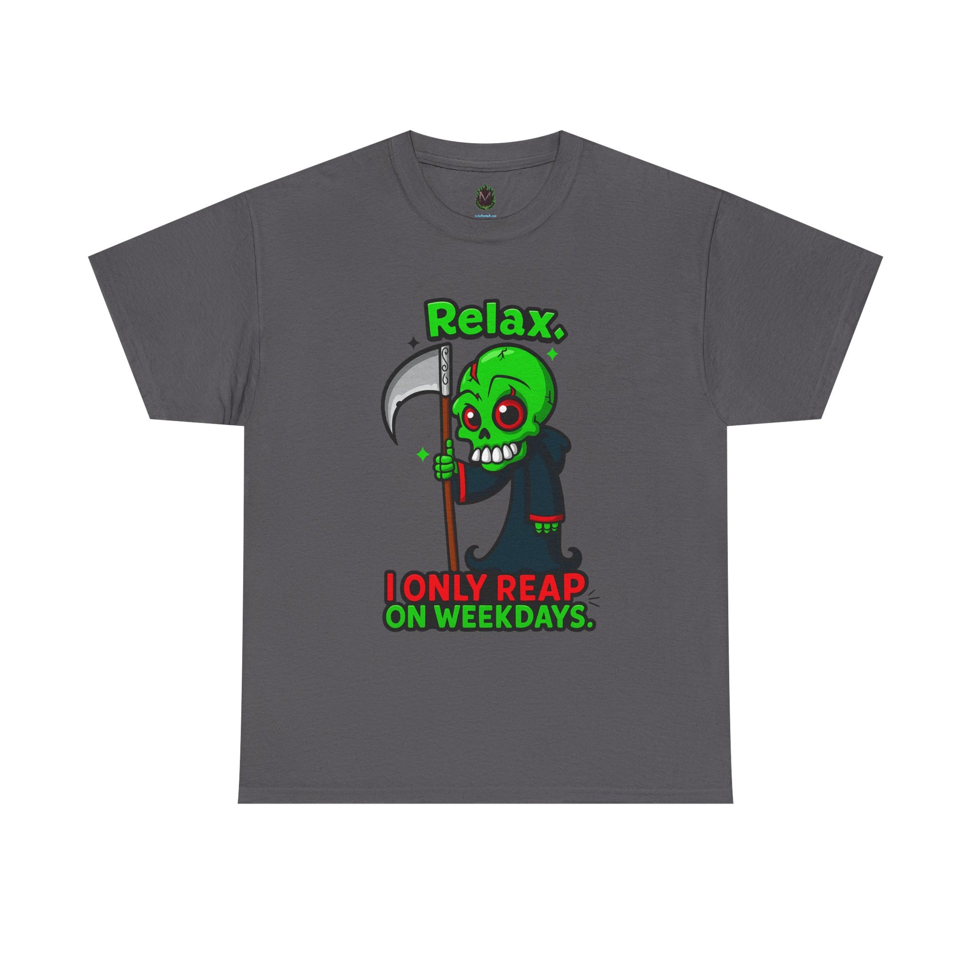 Relax I Only Reap On Weekdays T-Shirt | Grim Reaper Cartoon Tee