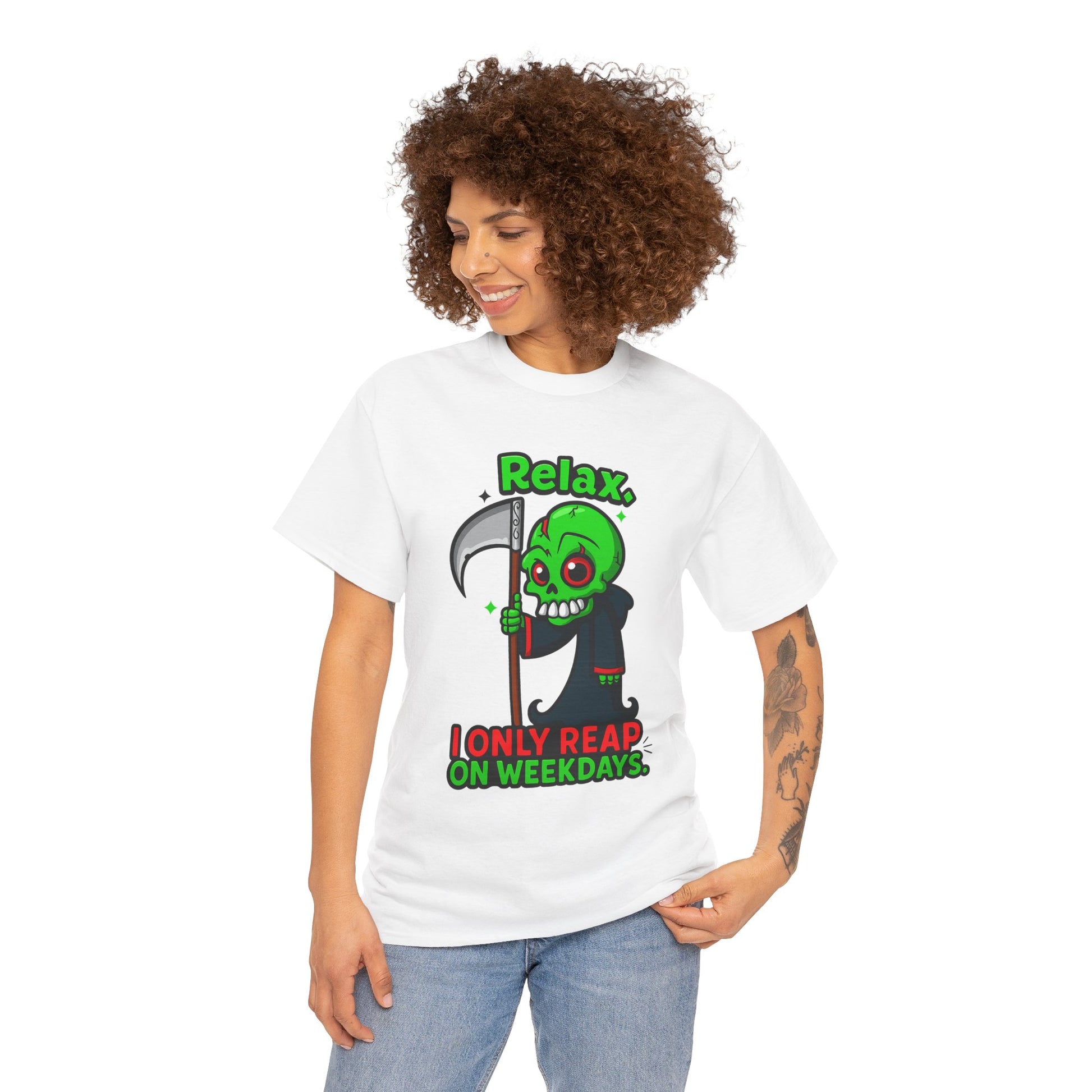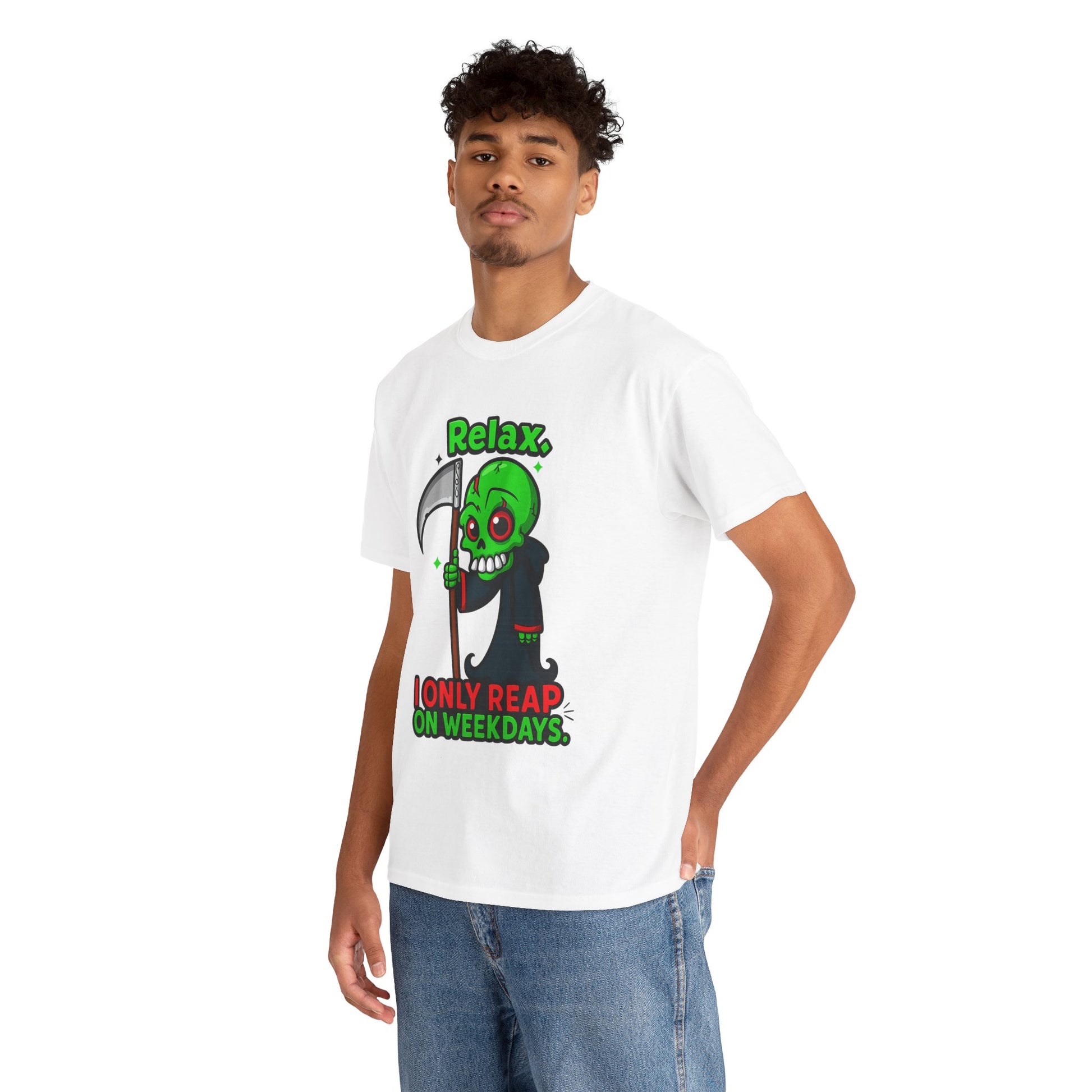 A cheeky, graphic tee that turns dark humor into everyday style. Soft, sturdy cotton holds a bright, cartoonish Grim Reaper printed in bold greens and reds with the caption: “Relax. I only reap on weekdays.” It’s the kind of shirt that sparks laughs in coffee lines, lightens the mood at late-night study sessions, or adds a playful edge to casual hangouts. The medium-weight fabric feels familiar and dependable; the classic crew neck and relaxed fit layer easily under jackets or stand alone as the statement piece. Wear it when you want to be a little irreverent without taking yourself too seriously.