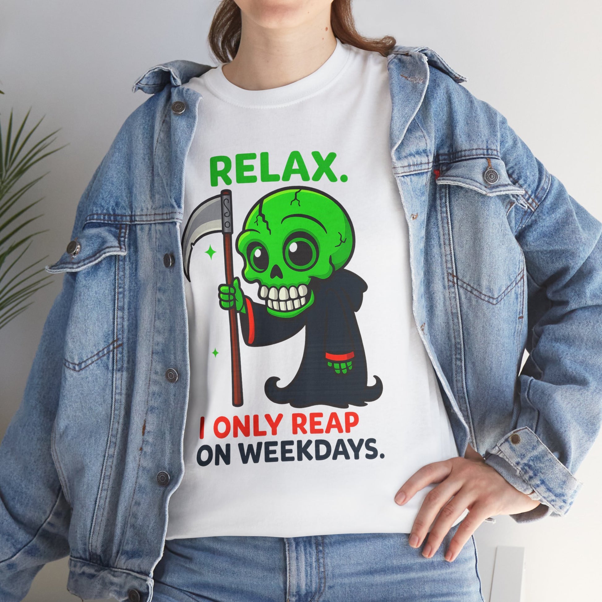 Relax I Only Reap on Weekdays T-Shirt | Grim Reaper Graphic