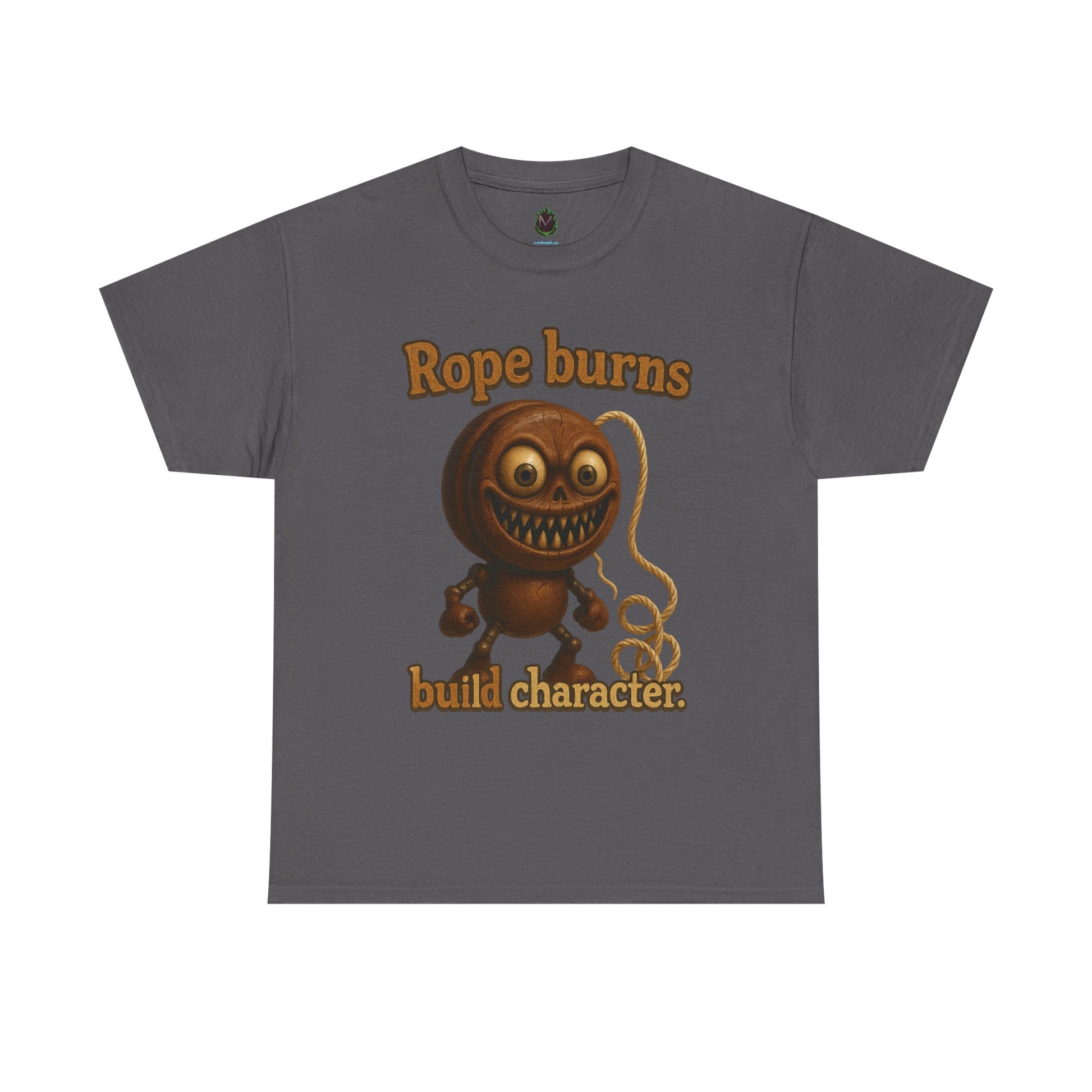 This soft, classic-fit tee carries a darkly playful vibe—an oddball, grinning mascot clutching a coiled rope with the tongue-in-cheek line “Rope burns build character.” Lightweight but sturdy, the shirt sits like a familiar favorite: relaxed through the shoulders, smooth against skin, and printed with crisp, detailed art that holds up wash after wash. Wear it when you want to spark a laugh, start a conversation, or lean into a quirky, slightly twisted sense of humor.