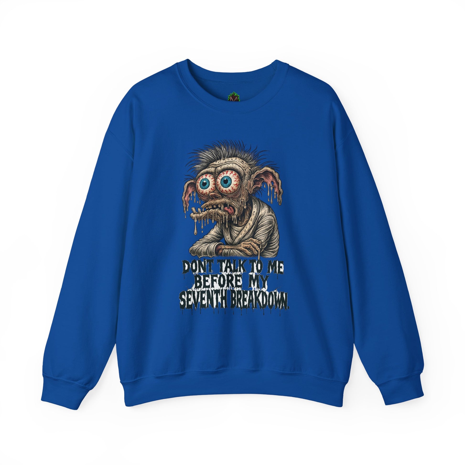 The "Don’t Talk to Me Before My Seventh Breakdown" crewneck stars one jittery, gooey-eyed gremlin who's just about had it.