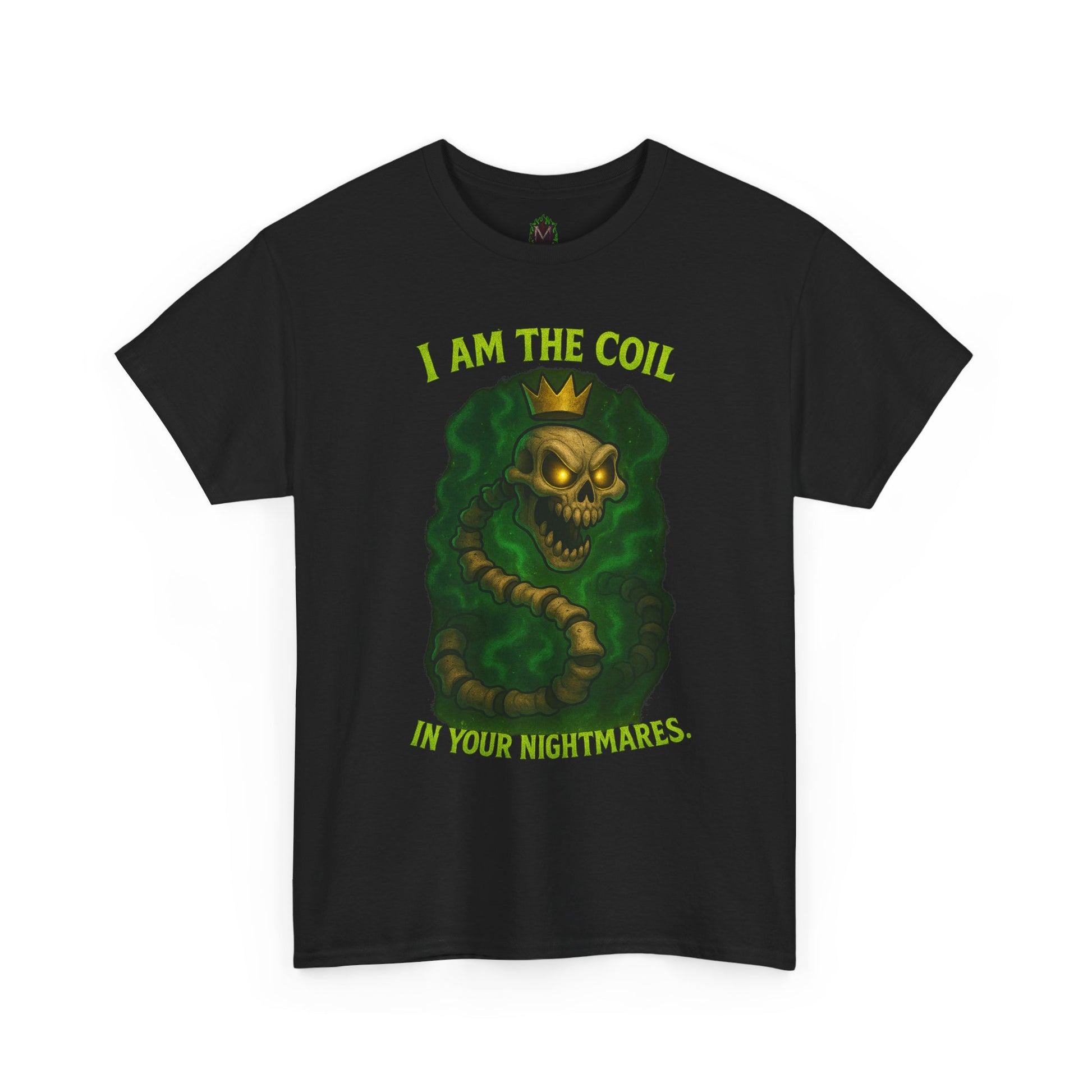 Slip into a tee that wears like a little story you can carry. This classic cotton shirt features a sinister, vintage-inspired illustration of a crowned skull wrapped in a coiling serpent, framed by the line: “I AM THE COIL IN YOUR NIGHTMARES.” The art sits bold and centered on a crisp white background, its mossy greens and antique golds lending an eerie, retro-horror vibe. Lightweight but durable, the shirt breathes and moves with you — whether you’re wandering late-night streets, stacking vinyl at a record swap, or settling in for a horror game night. It’s for people who prefer their style with a dark wink: theatrical, tactile, and unmistakably personal. Wear it under a denim jacket, over a long-sleeve, or on its own when you want your outfit to tell a story before you say a word.