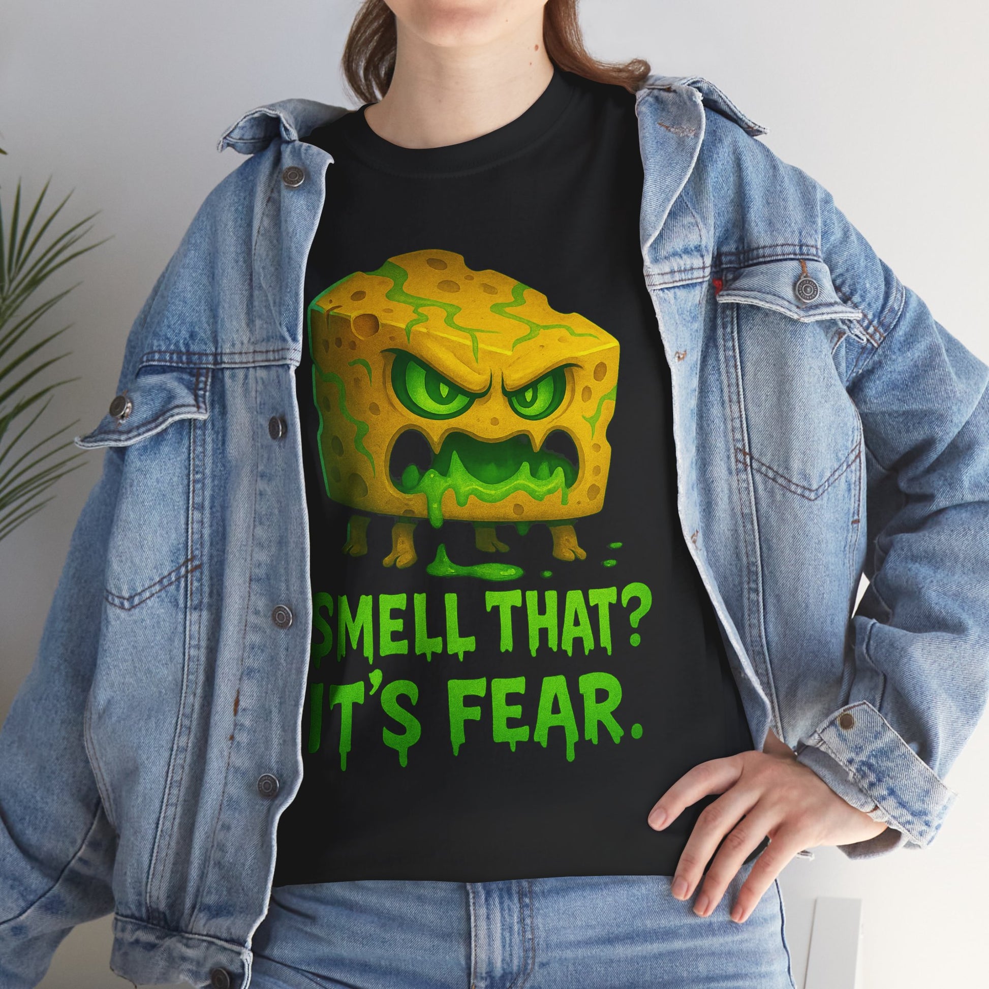 A cheeky, tongue-in-cheek tee that turns gross-out humor into wearable art. Bright, cartoonish illustration of a foul, blocky creature with dripping textures sits front-and-center above the playful line “SMELL THAT? IT’S FEAR.” The bold colors and exaggerated expression read like a comic-panel punchline — silly, slightly revolting, and impossible to ignore. Lightweight but sturdy cotton gives it a lived-in feel that works for lazy weekends, gaming nights, or anytime you want to make friends laugh (or grimace). It layers easily under a flannel or wears solo with jeans for an offbeat, confident look.