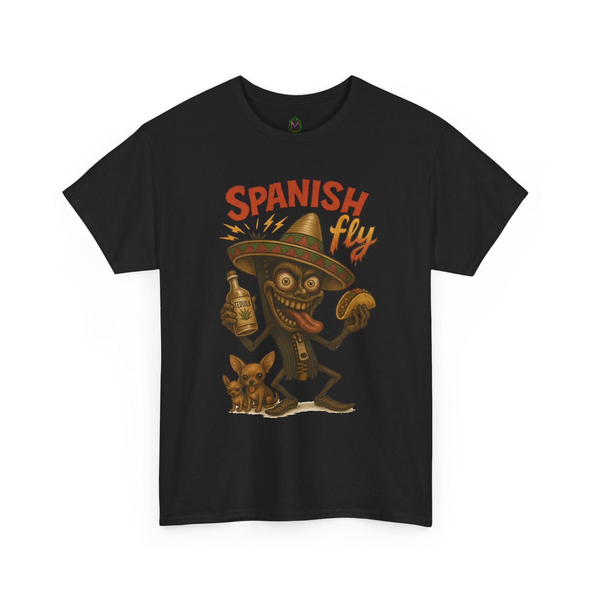 This Spanish Fly tee brings chaotic fiesta energy with a sombrero-wearing, taco-loving, tequila-guzzling bug—plus backup from a very suspicious chihuahua.