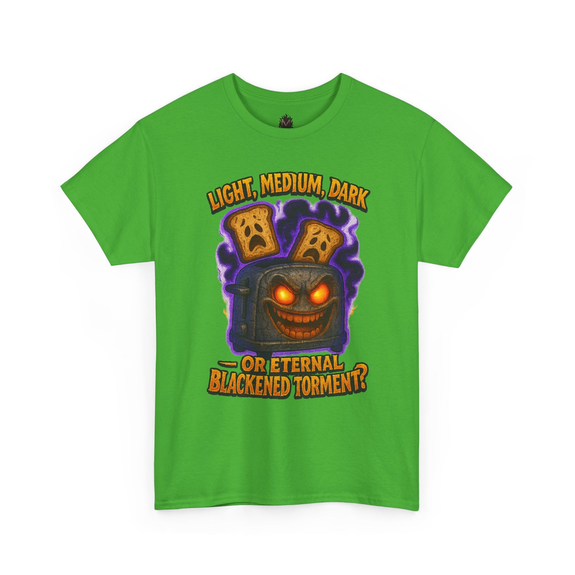 A bold, slightly twisted tee for people who like their humor dark and their graphics loud. This classic cotton shirt carries a vivid, DTF/DTG-printed caricature: a grinning, jack-o’-lantern–eyed toaster crowned with burnt toast, surrounded by smoky purple accents and tongue-in-cheek lettering about roast levels and eternal torment. It sits casual and confident on the body — roomy through the torso with a clean crew neckline — so it layers easily under jackets or stands alone at shows, meetups, or late-night hangouts. The fabric has a sturdy, smooth hand that keeps prints sharp and colors popping wash after wash. Wear it when you want to spark a laugh, start a conversation, or lean into a little bit of deliciously grim fun.