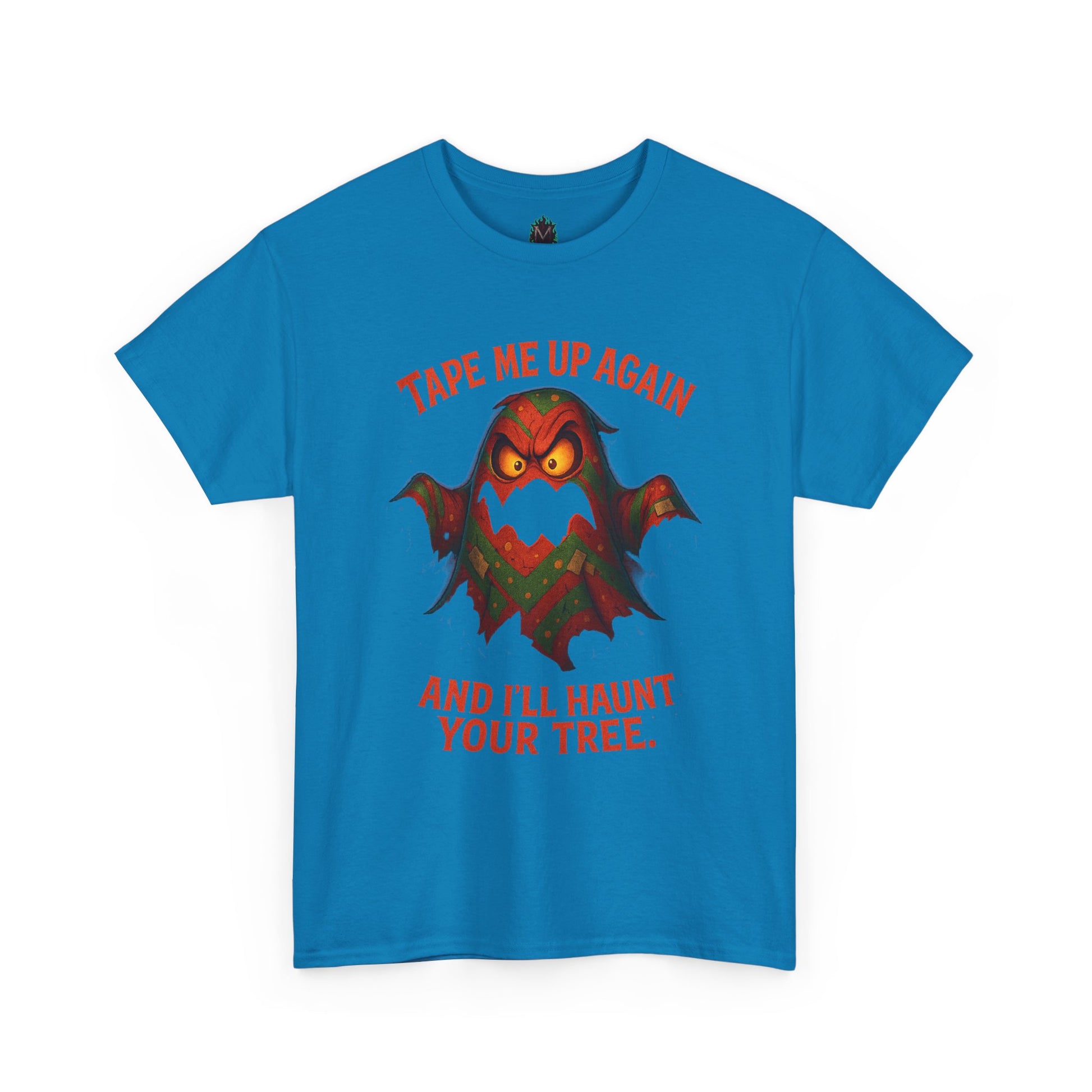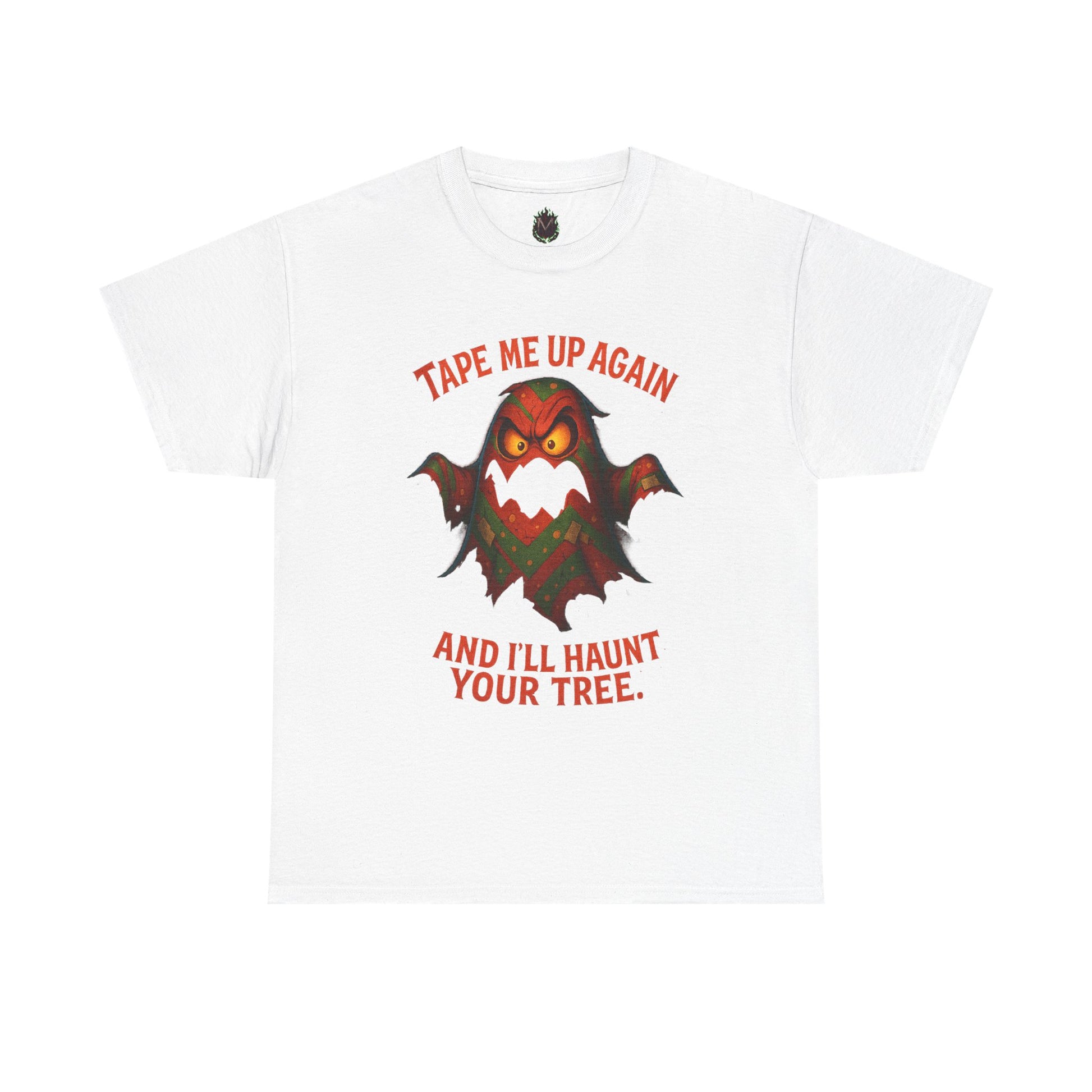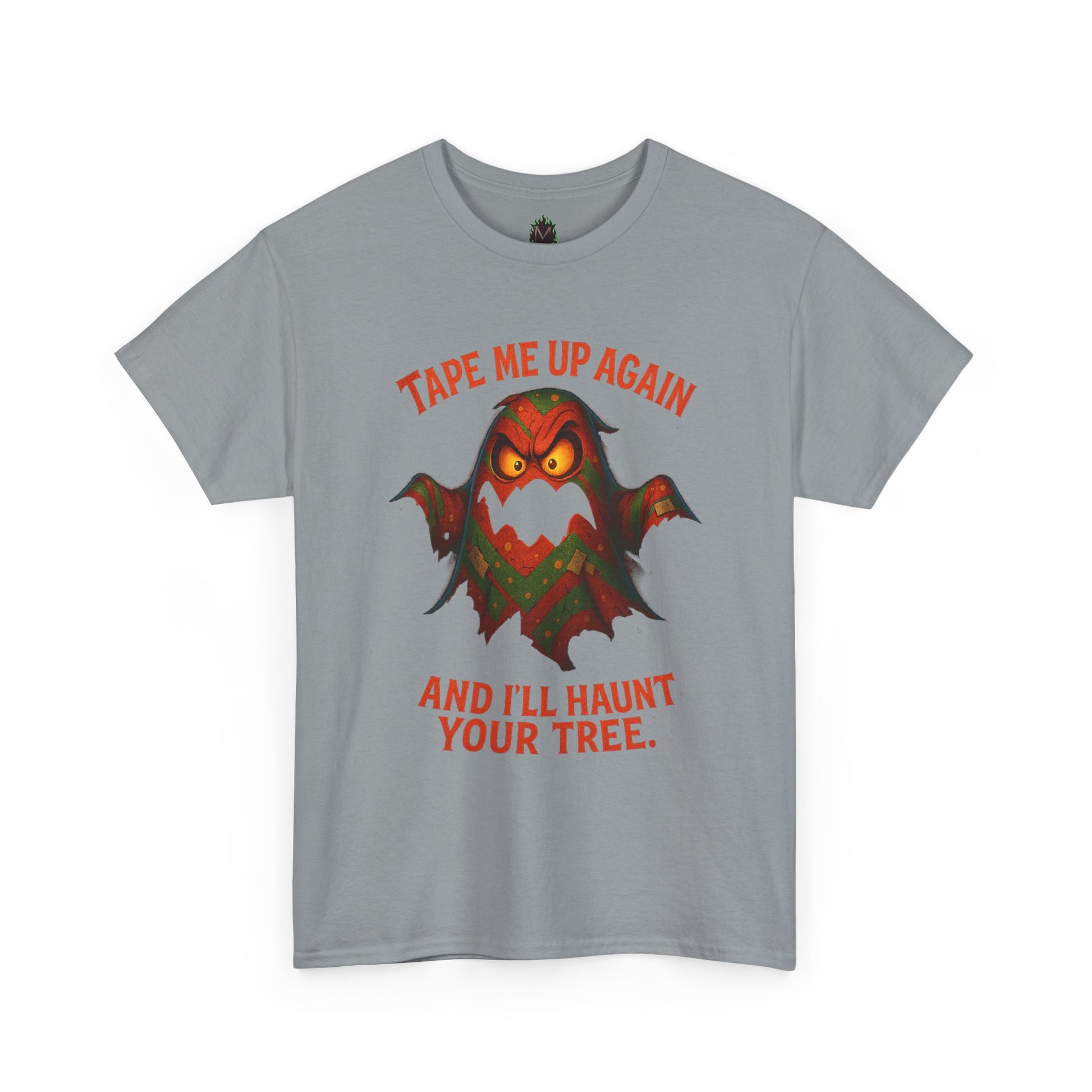 This tee brings playful menace to your wardrobe with a cheeky, retro-horror illustration and bold typographic punch. The soft, midweight cotton holds bright DTG/DTF prints so the angry bat/ghost character and the line “Tape me up again and I’ll haunt your tree.” stay vivid wash after wash. Wear it when you want to poke fun at holiday décor wars, celebrate spooky season with dry humor, or add a nostalgic, tongue-in-cheek vibe to everyday outfits. The classic crew neckline and relaxed fit layer easily under jackets or stand alone with jeans, while the tear-away label and ribbed collar keep comfort front and center. Thoughtful construction—tubular knit, shoulder tape, and ethically sourced cotton—means this shirt looks clean, feels reliable, and lasts.