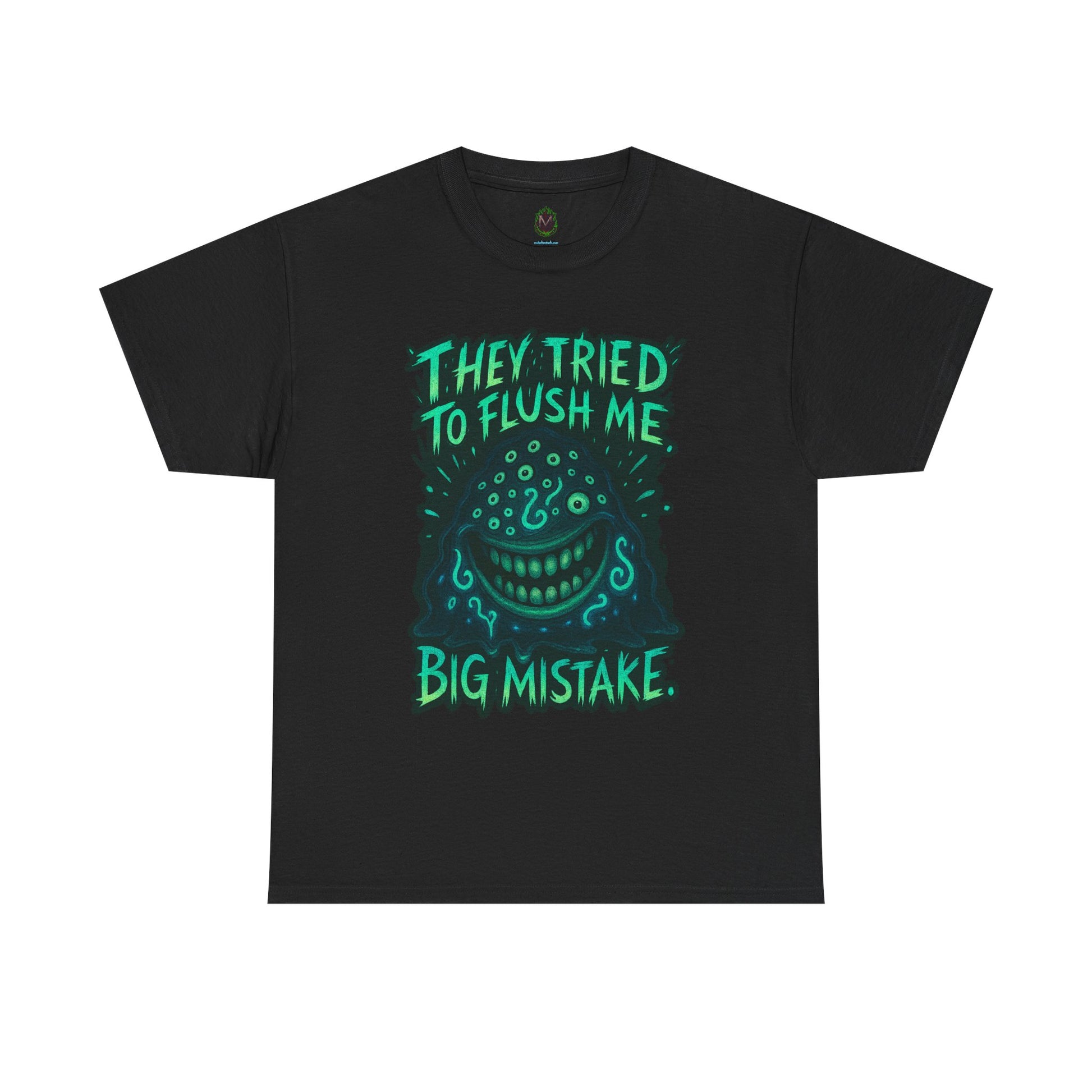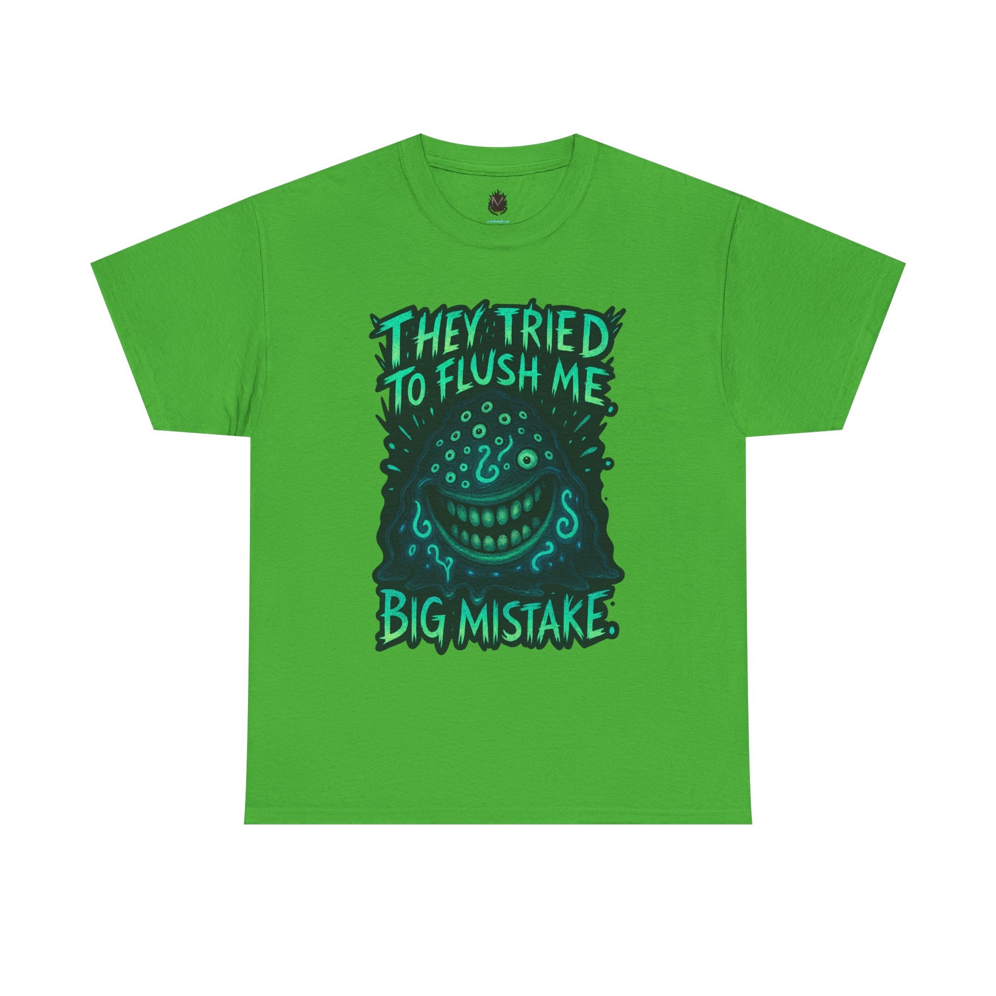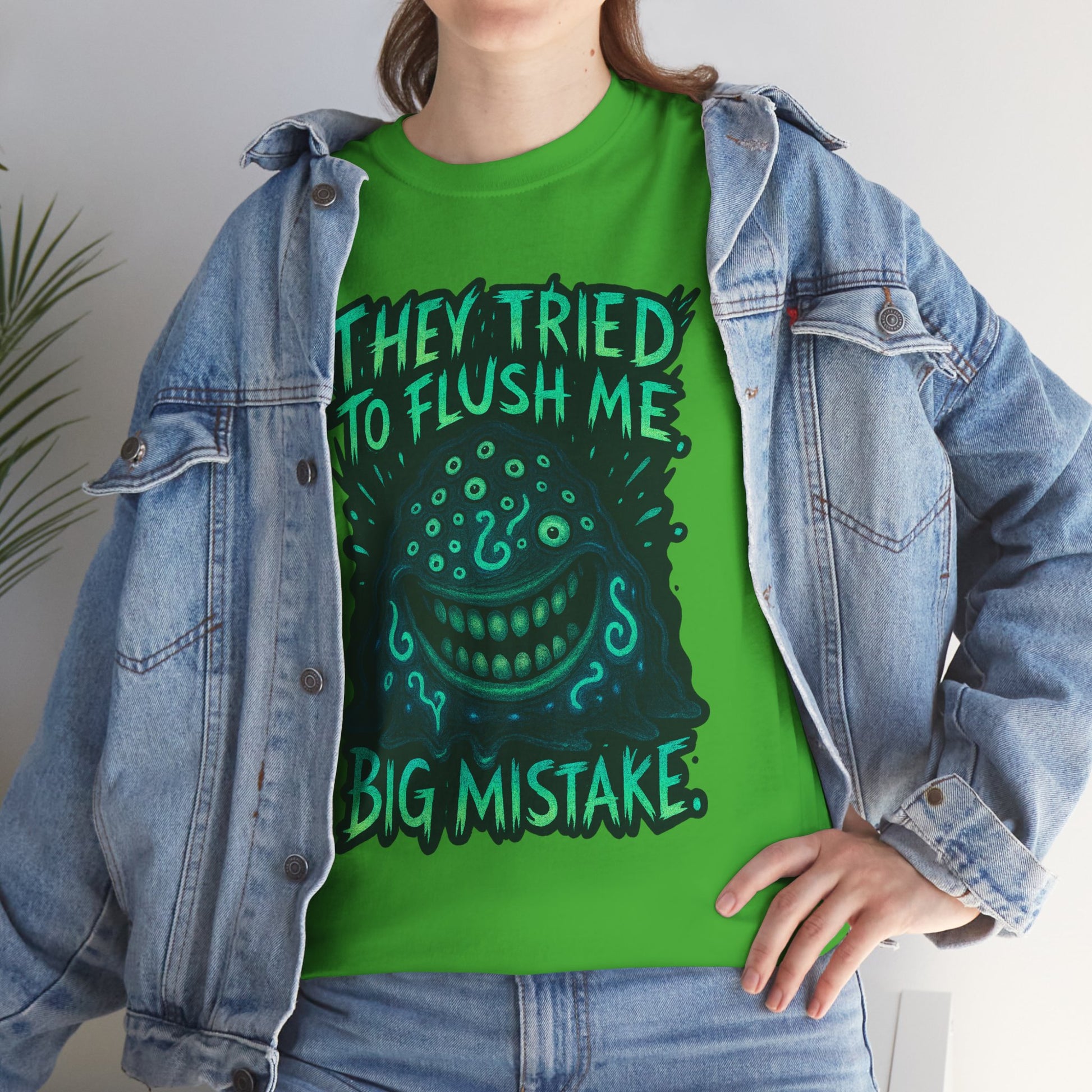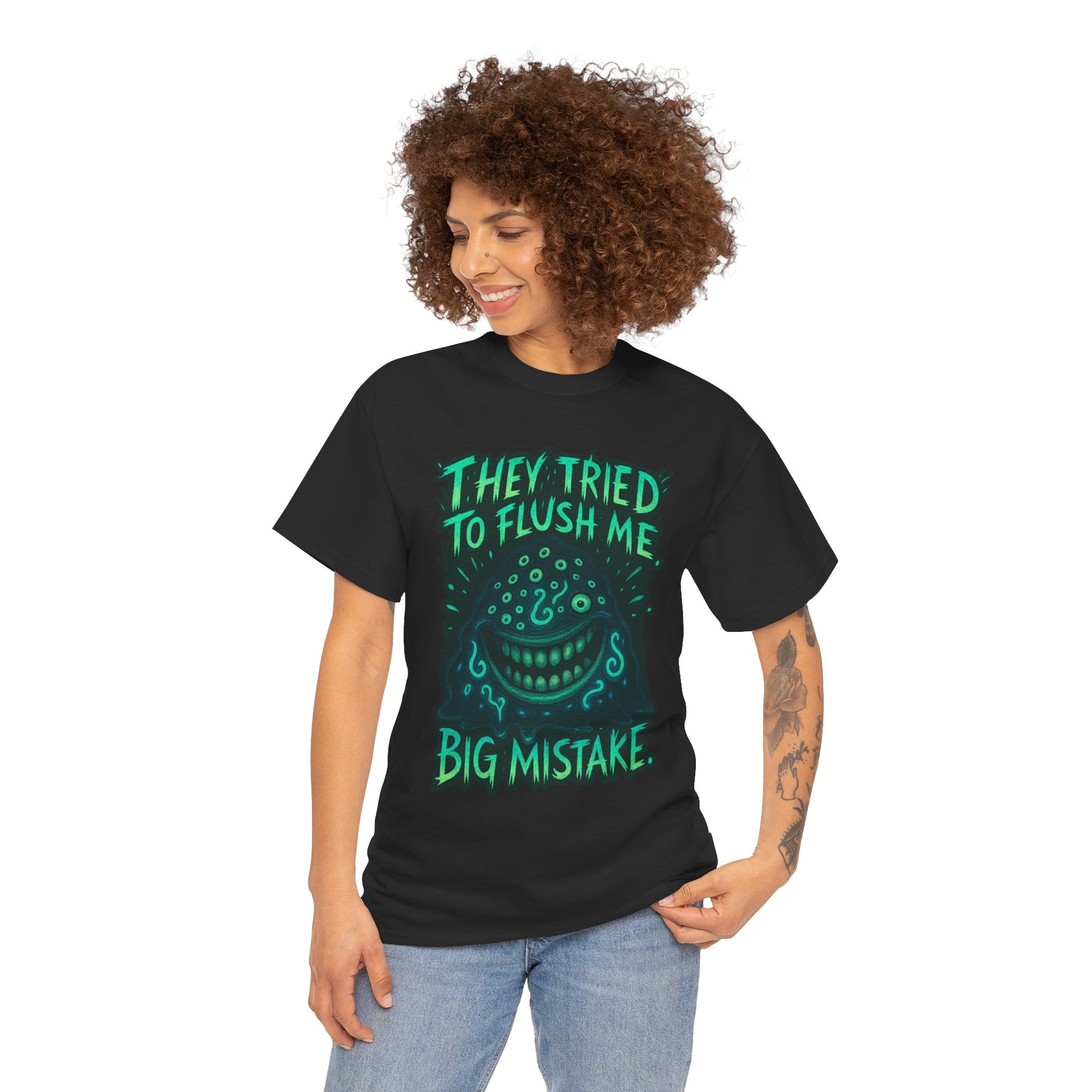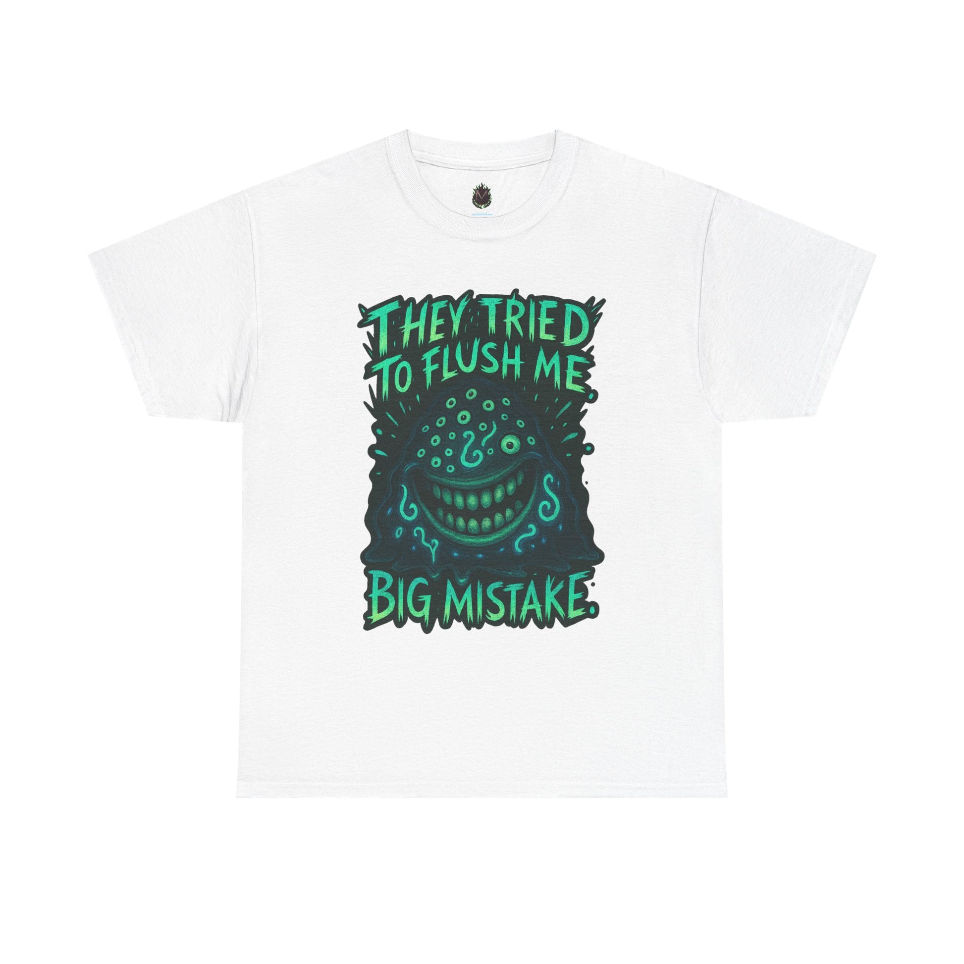 This relaxed-fit cotton tee carries attitude in soft, reliable fabric. A bold, hand-drawn graphic sits center chest: a mischievous, grinning face surrounded by dripping, sea-green lettering that reads "They tried to flush me — big mistake." The print’s slightly distressed edges and neon-accent palette give the shirt a punkish, underground vibe that stands out against the natural white canvas. Wear it to skateparks, late-night shows, or weekend hangs when you want to make a wry, confident statement without shouting. The crew neck and classic cut keep it comfortable for long days; the tear-away label and reinforced shoulder tape mean it stays comfy and holds its shape wash after wash. Ethically sourced cotton and durable printing techniques ensure this tee looks lived-in in a good way — like something you’ve owned through the best small rebellions of your life.