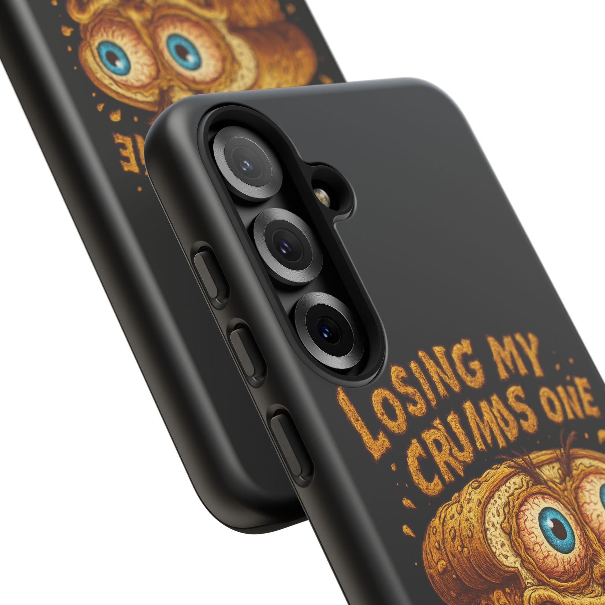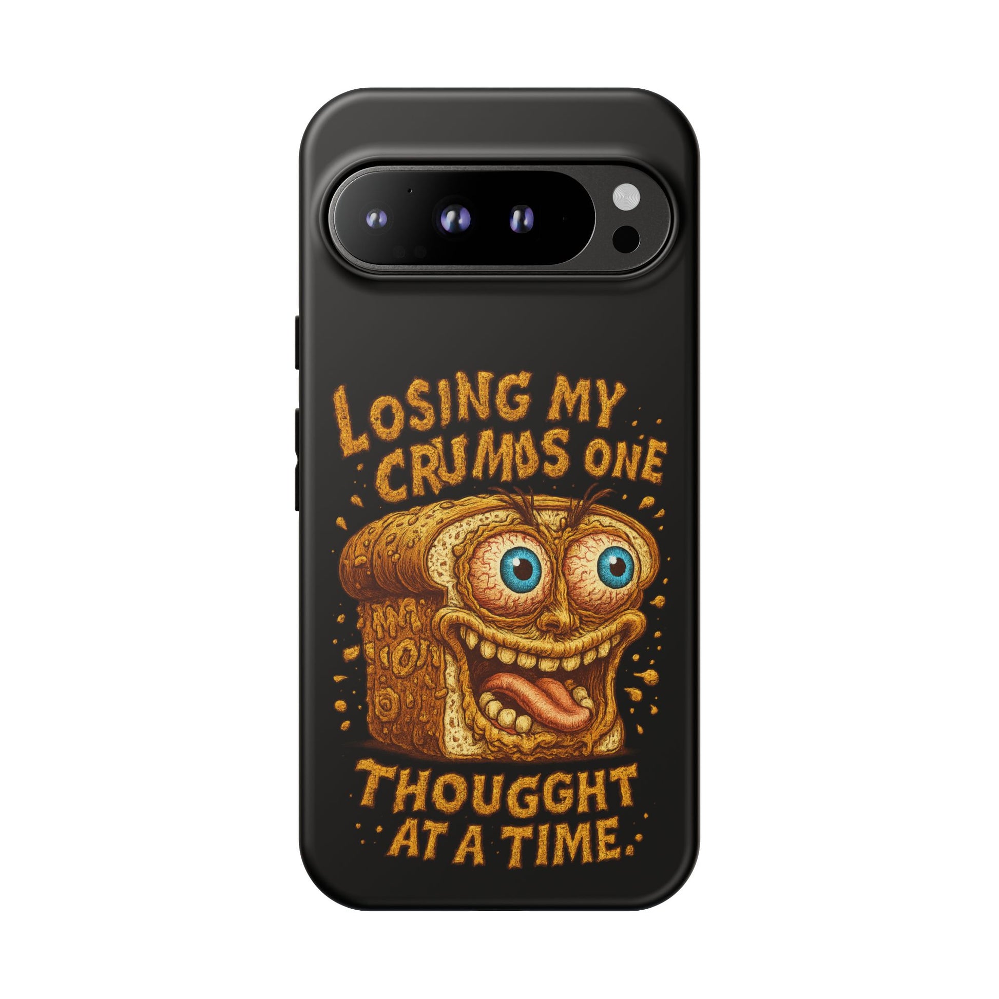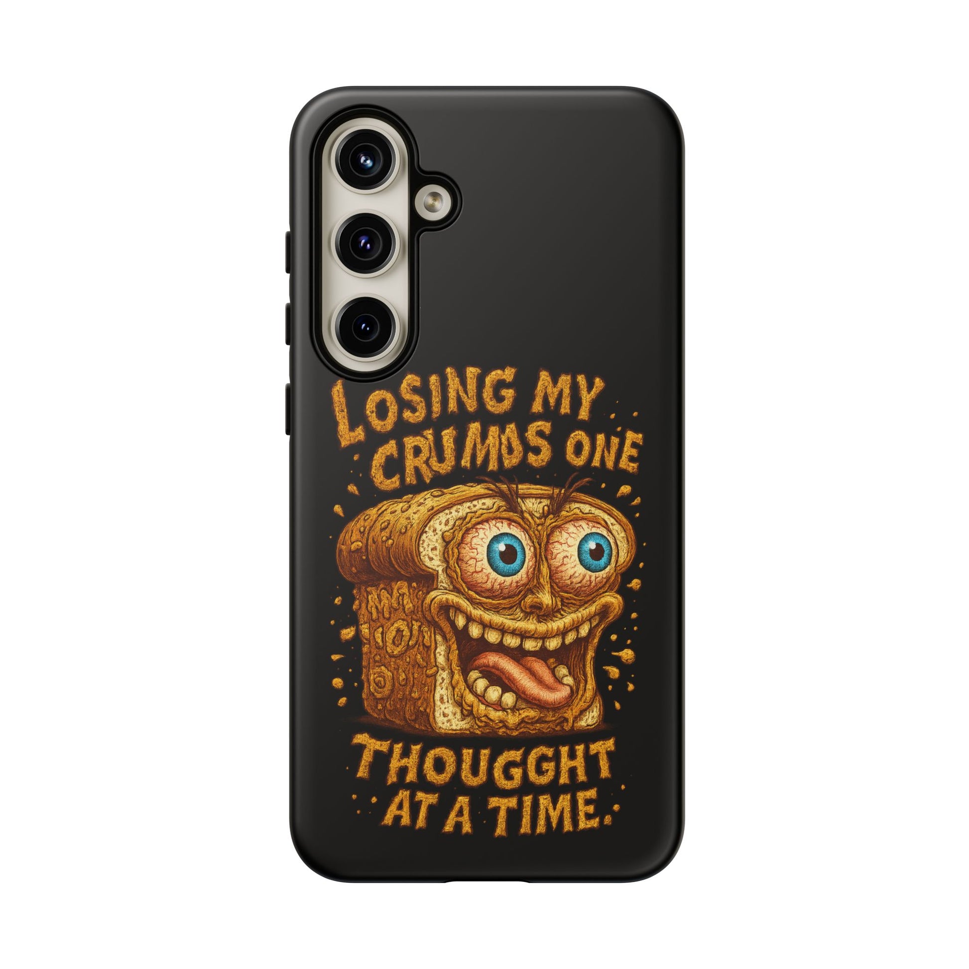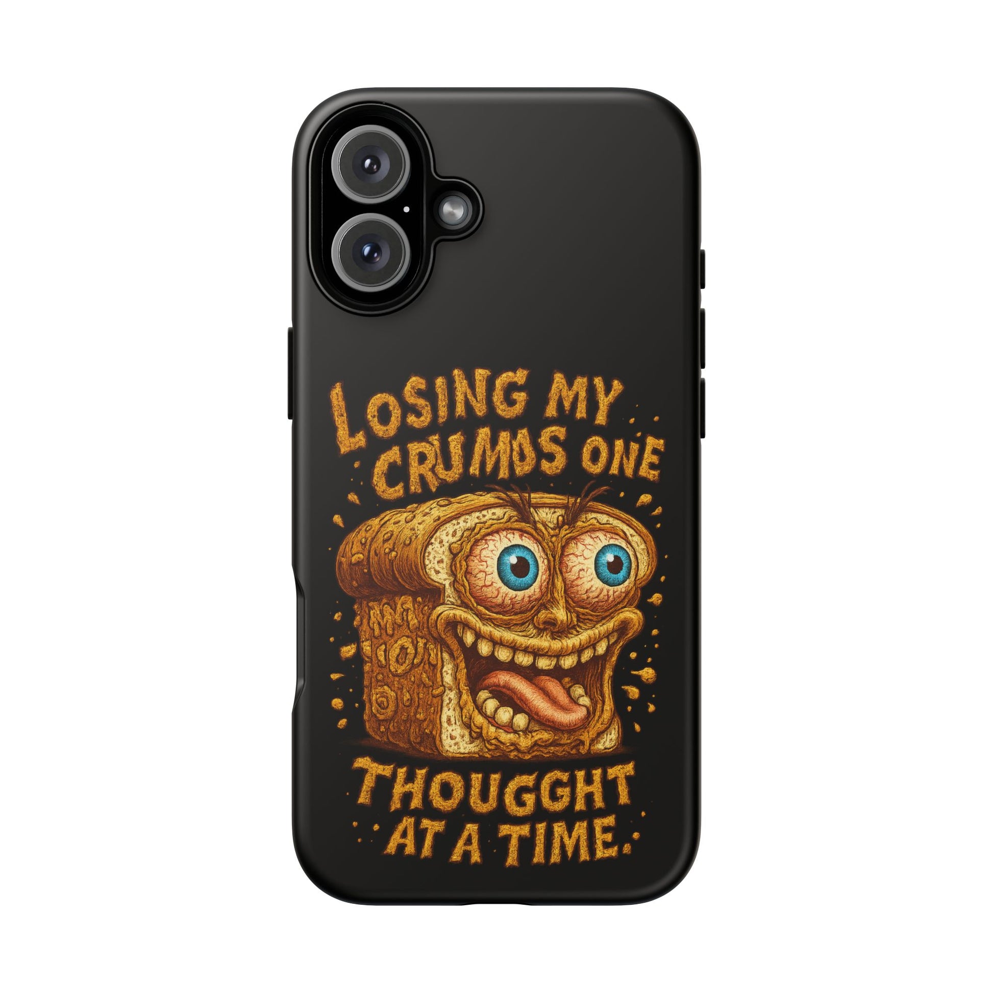 A rugged, personality-packed phone case that keeps your device safe while showing off a cheeky, snack-fueled sense of humor. The bold illustrated toast character and hand-lettered line “Losing my crumbs one thought at a time” sit in full-color wrap across a gloss or matte background. Dual-layer construction (polycarbonate shell + TPU silicone liner) so drops and knocks are absorbed, while clear port openings keep your phone fully accessible. Designed for everyday wear — from commuting to coffee runs — it brings durable protection with a playful edge for anyone who likes their accessories equal parts sturdy and silly.