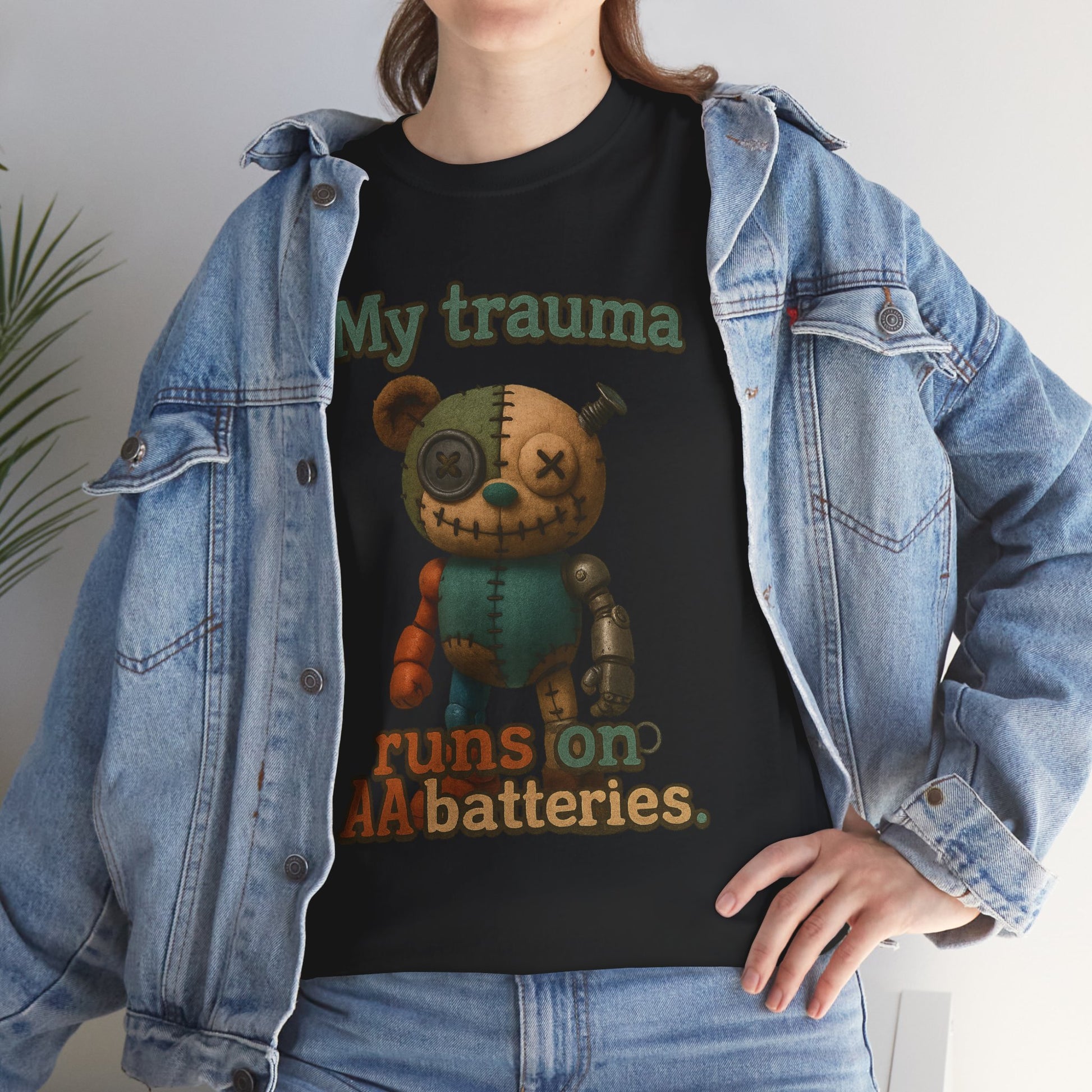 A worn, stubborn little companion with a darkly humorous heart. This classic cotton tee features a stitched teddy-bot illustration and the phrase “My trauma runs on AA batteries.” It reads like a private joke for people who cope with scars by making light of them — a shirt you’ll reach for when you want comfort and a quietly defiant laugh. The medium-weight cotton feels sturdy and breathable. The crew neck and relaxed cut sit easy under a jacket or by themselves on slow mornings. Let this tee be the low-key statement that says you’ve survived, you roll with the weird, and you’re not apologizing for your history.