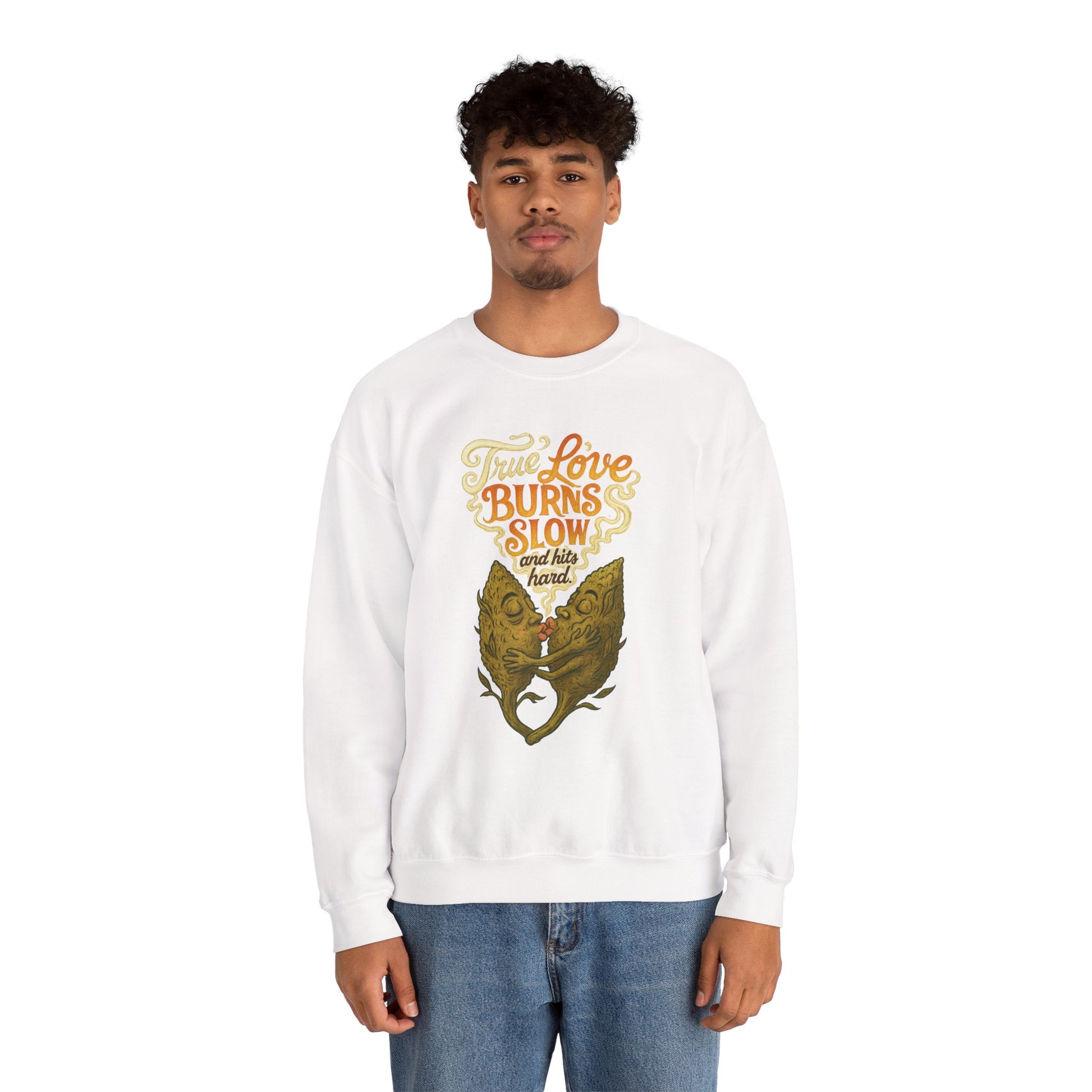 This sweatshirt speaks the truth—love hits like a bong rip from the gods. Featuring two leafy lovers mid-embrace and a swirling psychedelic message that’s equal parts romantic and ridiculous.