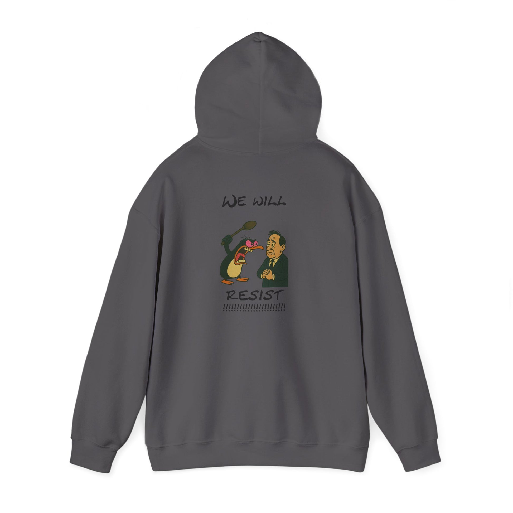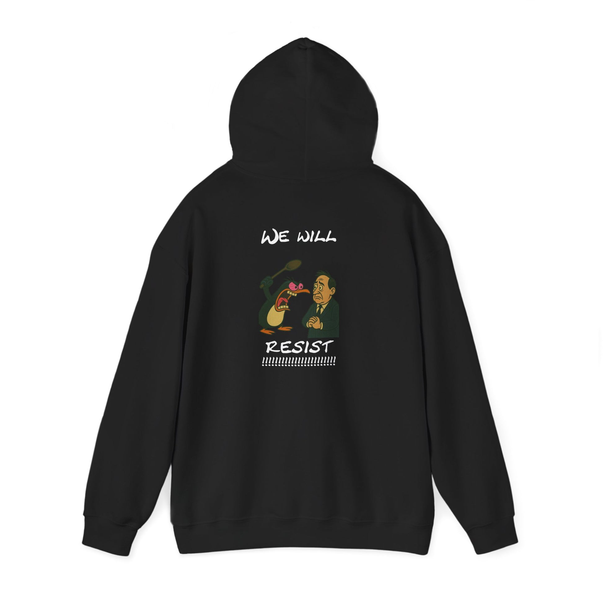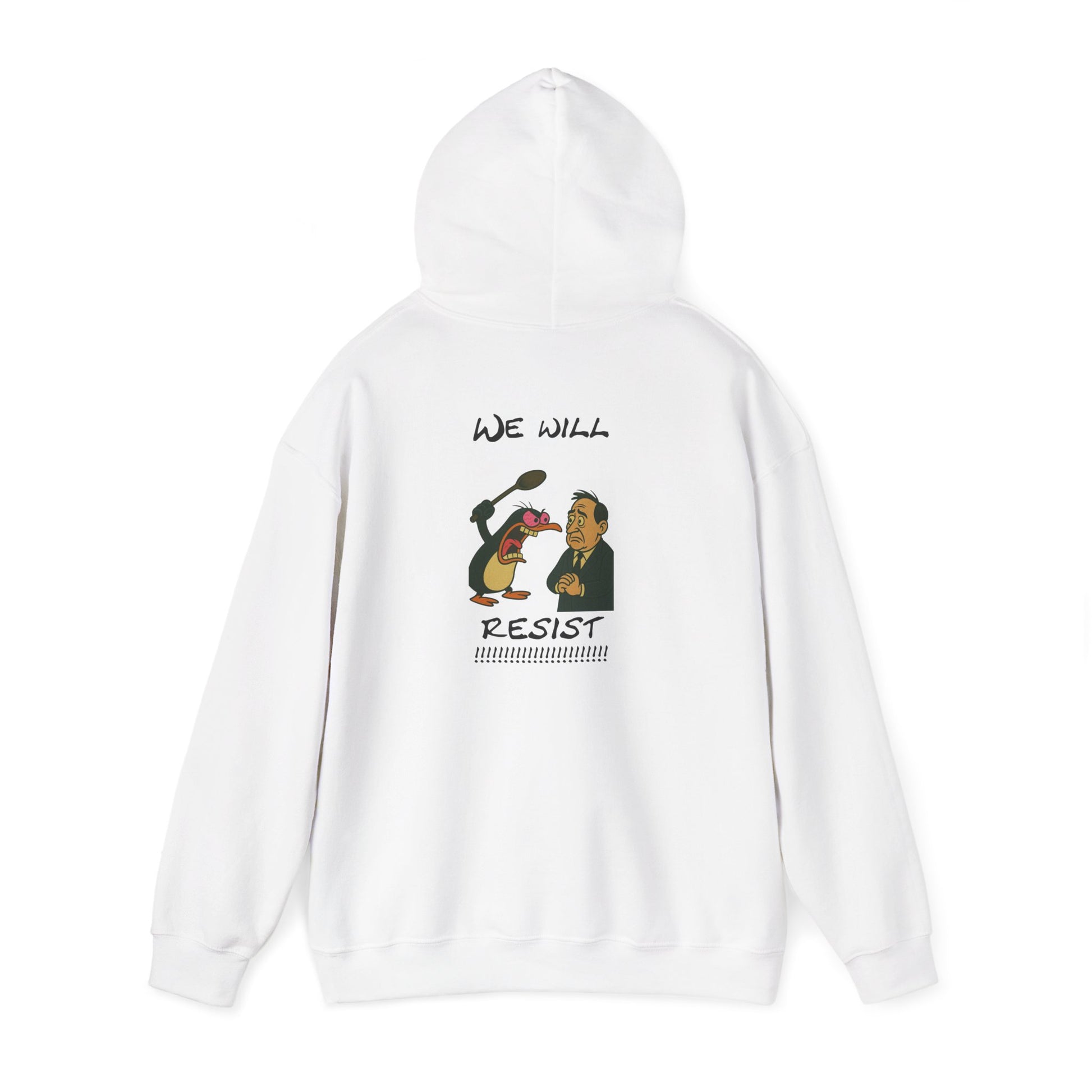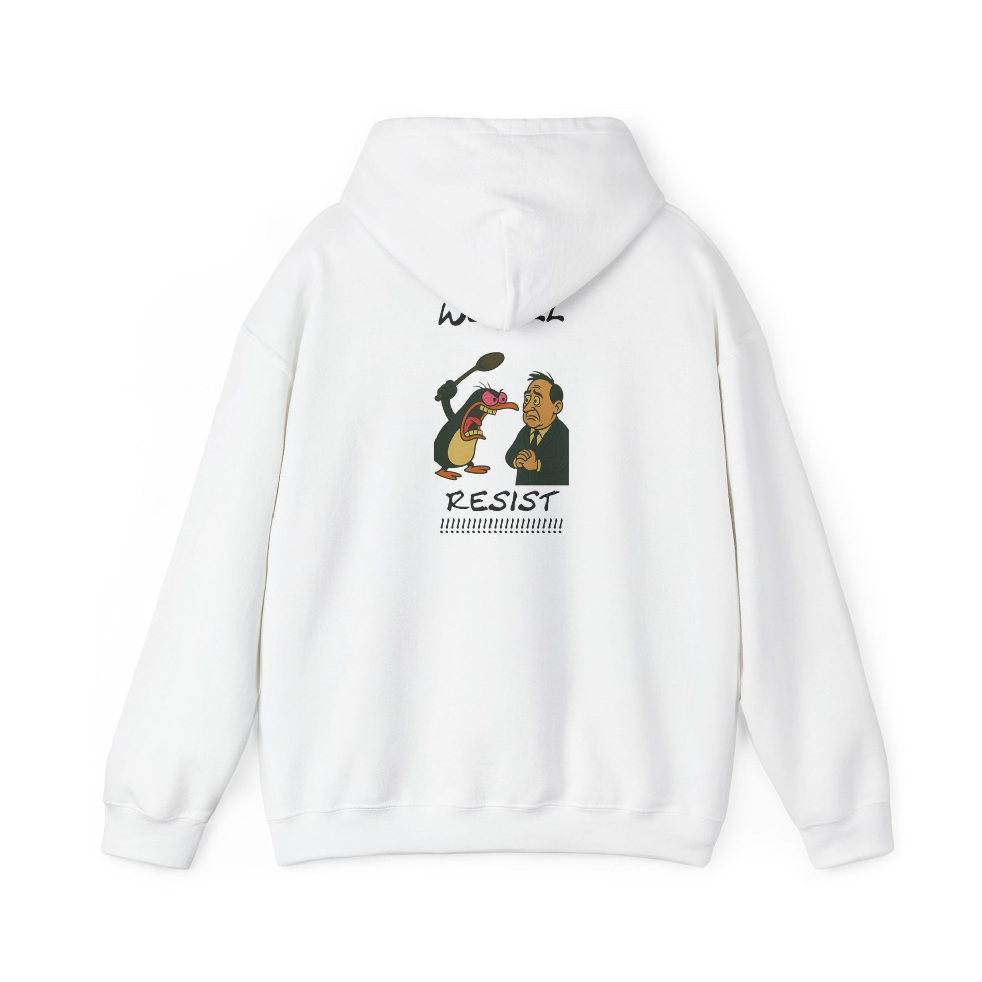 One penguin. One protest. One broken spoon. This hoodie says what you’ve wanted to scream for years. With a cartoon penguin mid-freakout shouting “WE WILL RESIST” and a terrified man on the receiving end, this design is the perfect combo of unhinged rebellion and ridiculous energy. Wear it when you're done being polite.