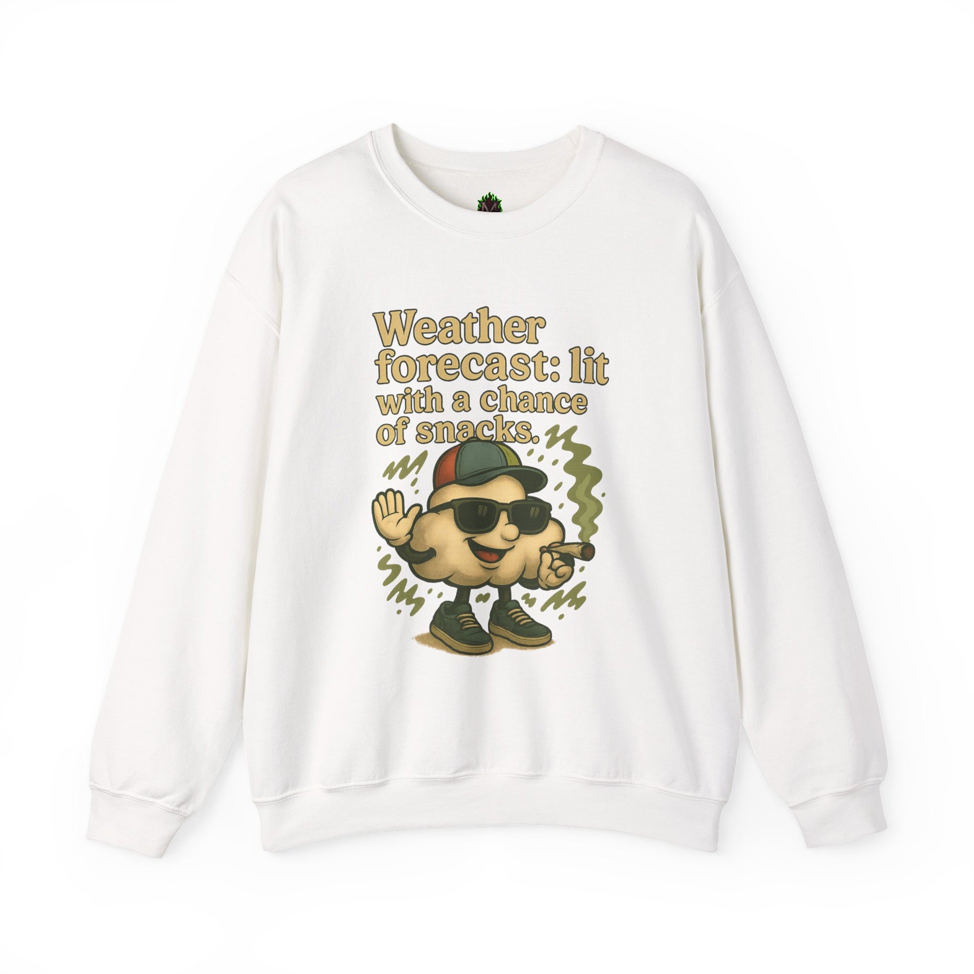 Stay high and dry with this hilariously chill crewneck sweatshirt. Featuring a stoned cloud rocking shades, a backwards hat, and a lit joint, this design forecasts good vibes and major munchies. Perfect for the laid-back weather watcher who prefers clouds of the herbal kind.