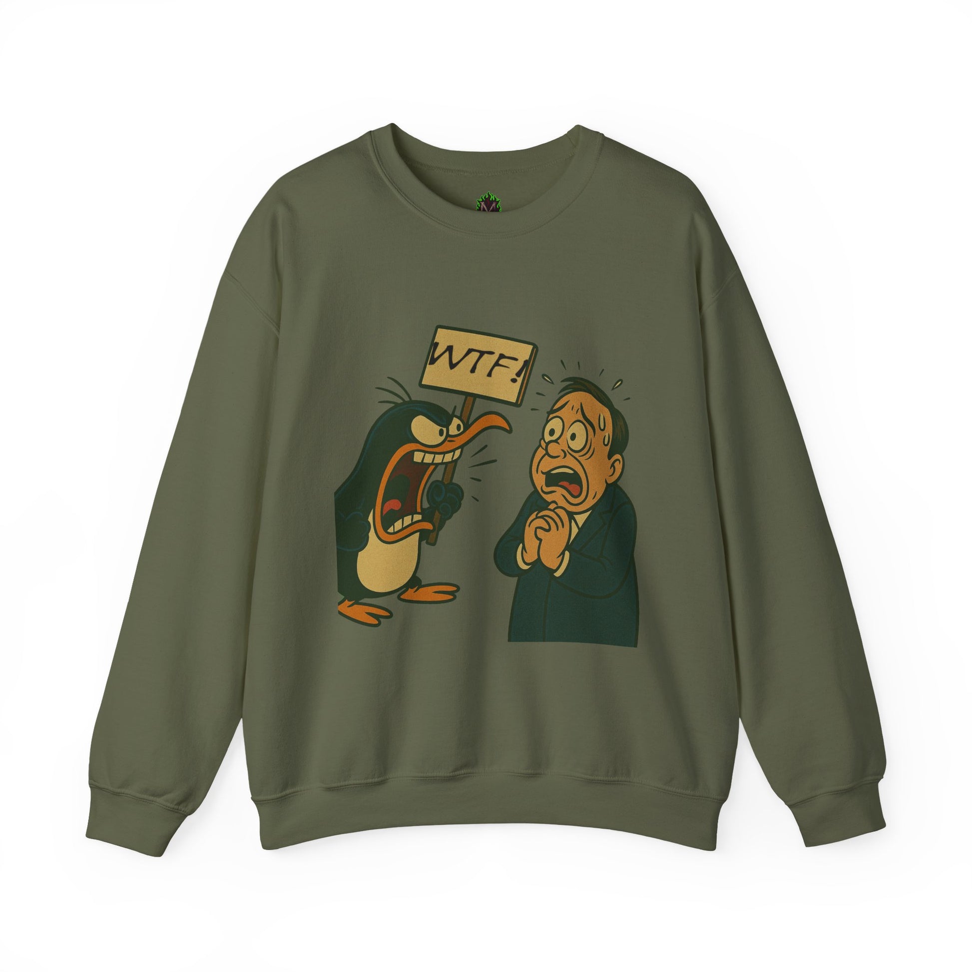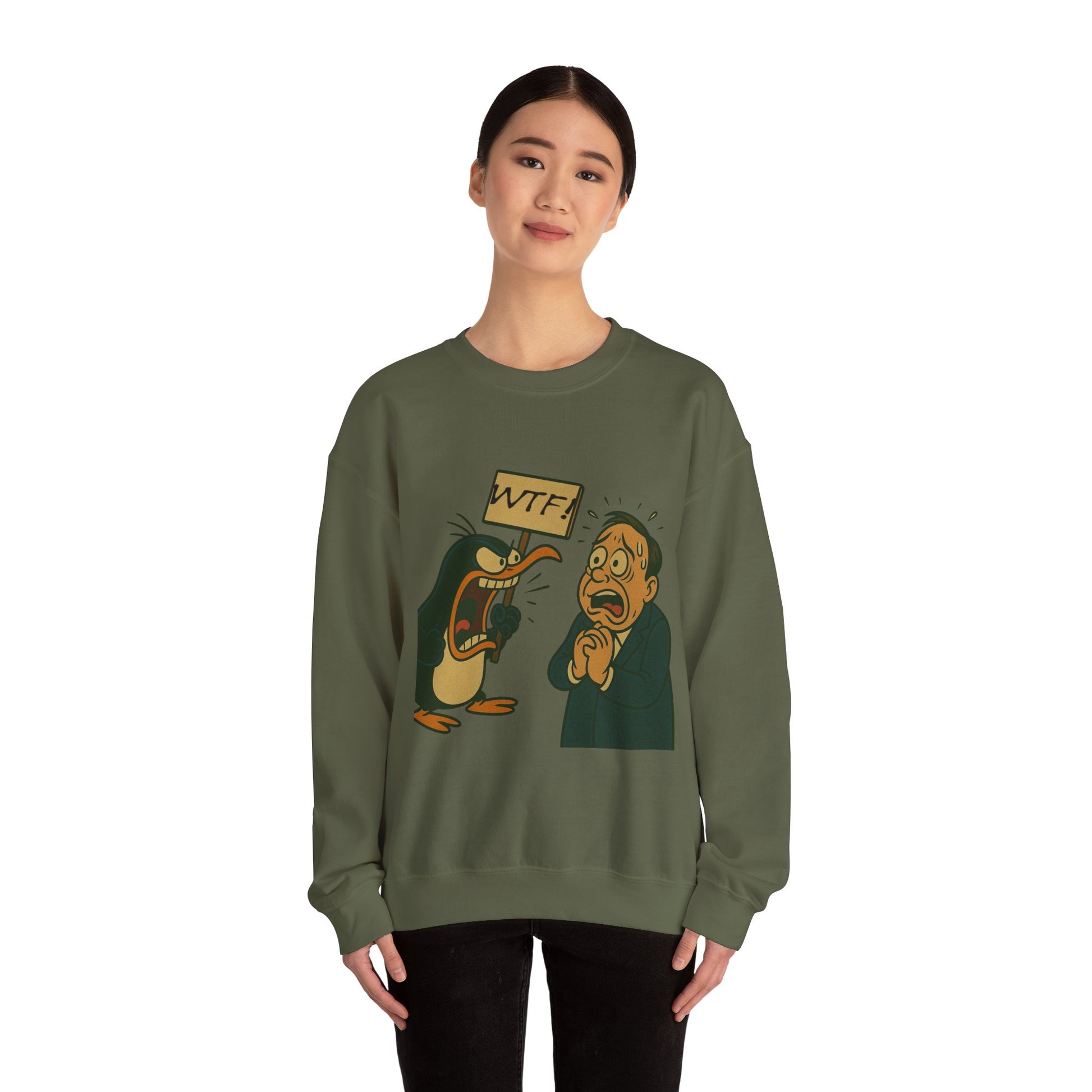 Bold, funny, and a little absurd—this crewneck features a furious cartoon penguin holding a “WTF!” sign while yelling at a panicked man. Perfect for fans of over-the-top humor, quirky art, and conversation-starting apparel.