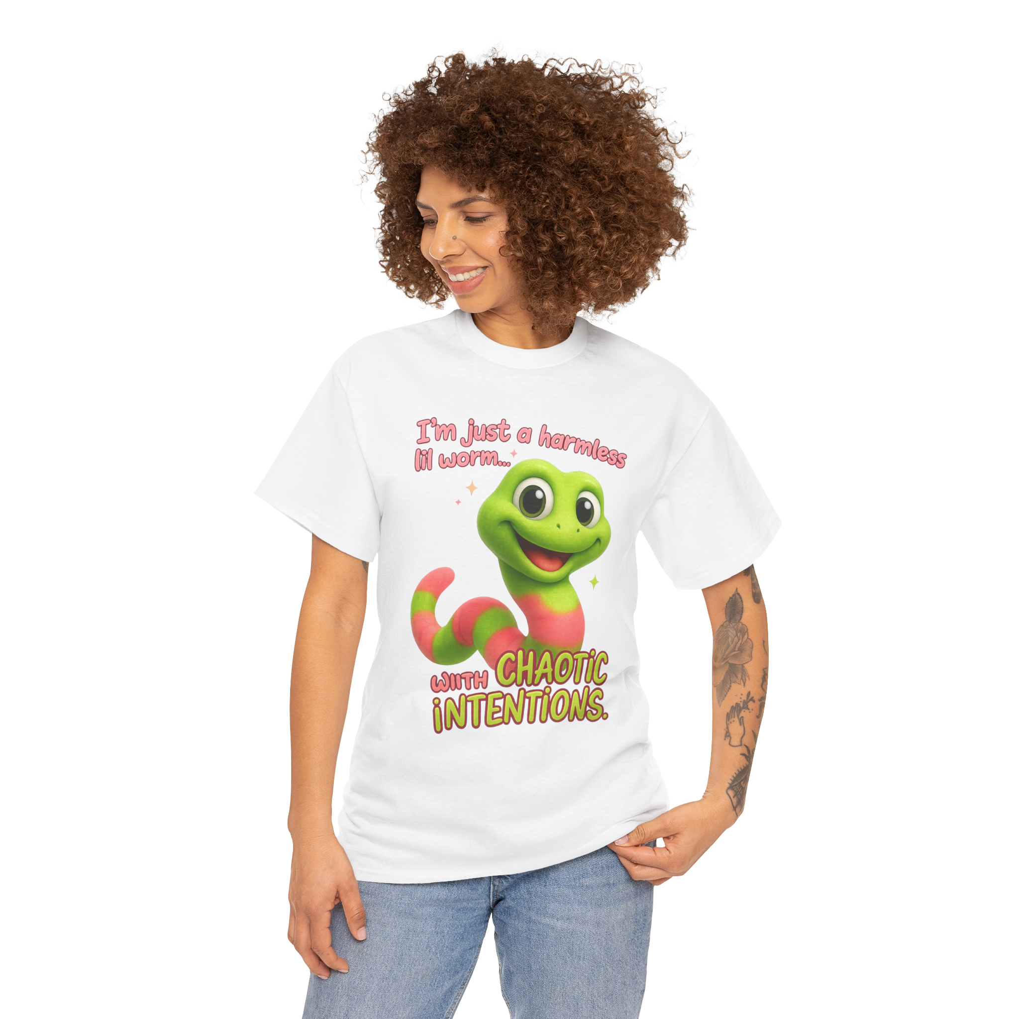 This T-shirt stars a bright, candy-colored gummy worm with an innocent face and the words: “I’m just a harmless lil worm… with chaotic intentions.” Perfect for mischief-makers, chaos gremlins, or anyone who plays nice but plots nonsense. Whether you’re scheming, snacking, or just slaying in style, this shirt is your candy-coated warning label.
