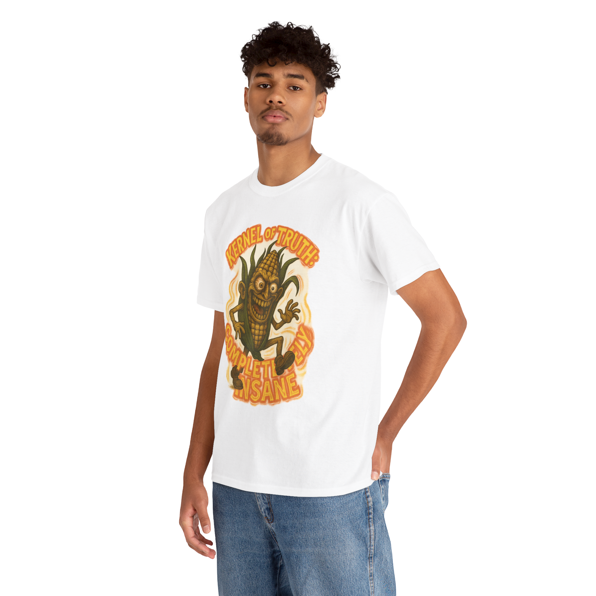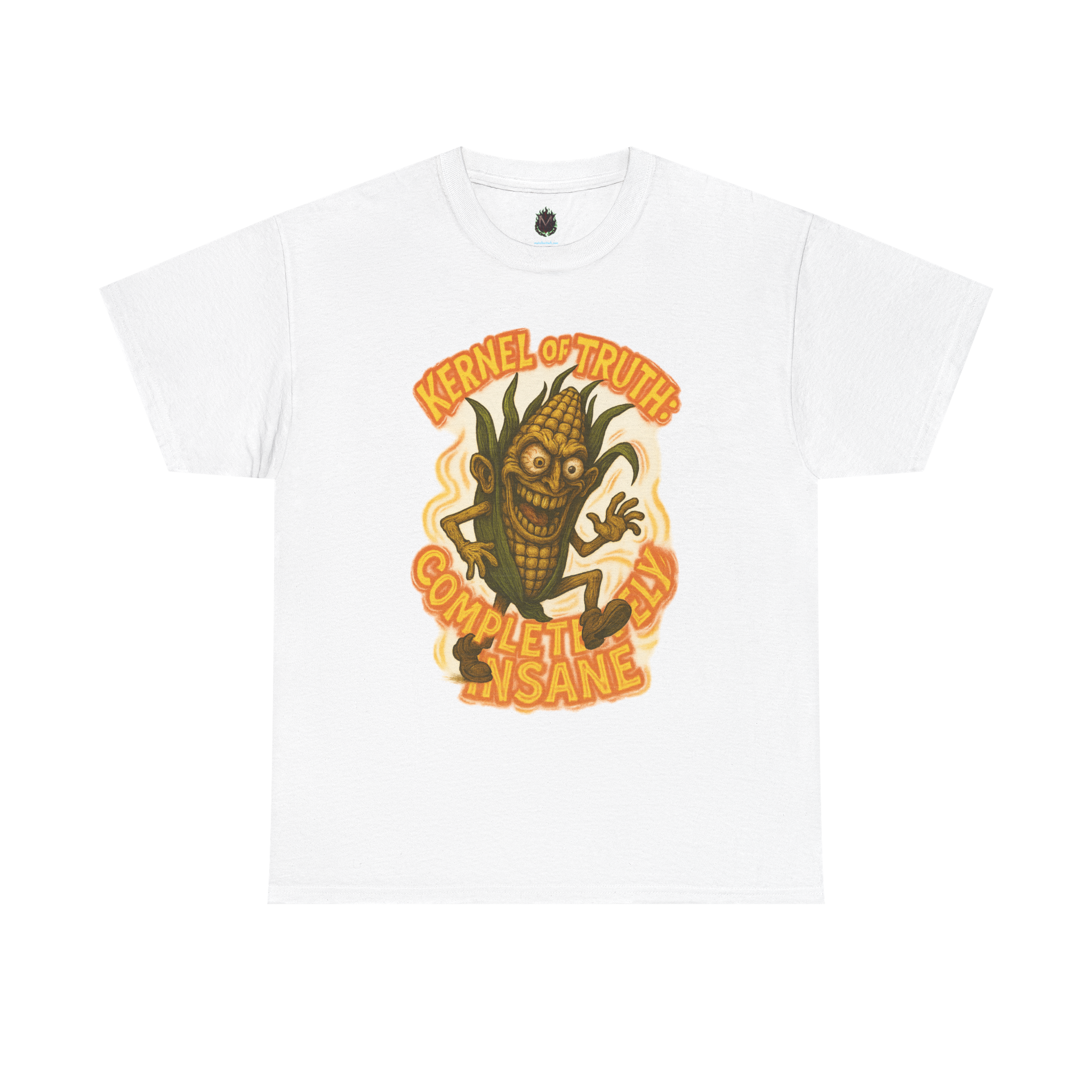 Our “Kernel of Truth: Completely Insane” t-shirt features a wild-eyed corn character mid-meltdown, surrounded by blazing, unstable energy and orange wordplay madness. It’s a hilarious, slightly disturbing graphic for those who love offbeat humor with a crunchy edge.